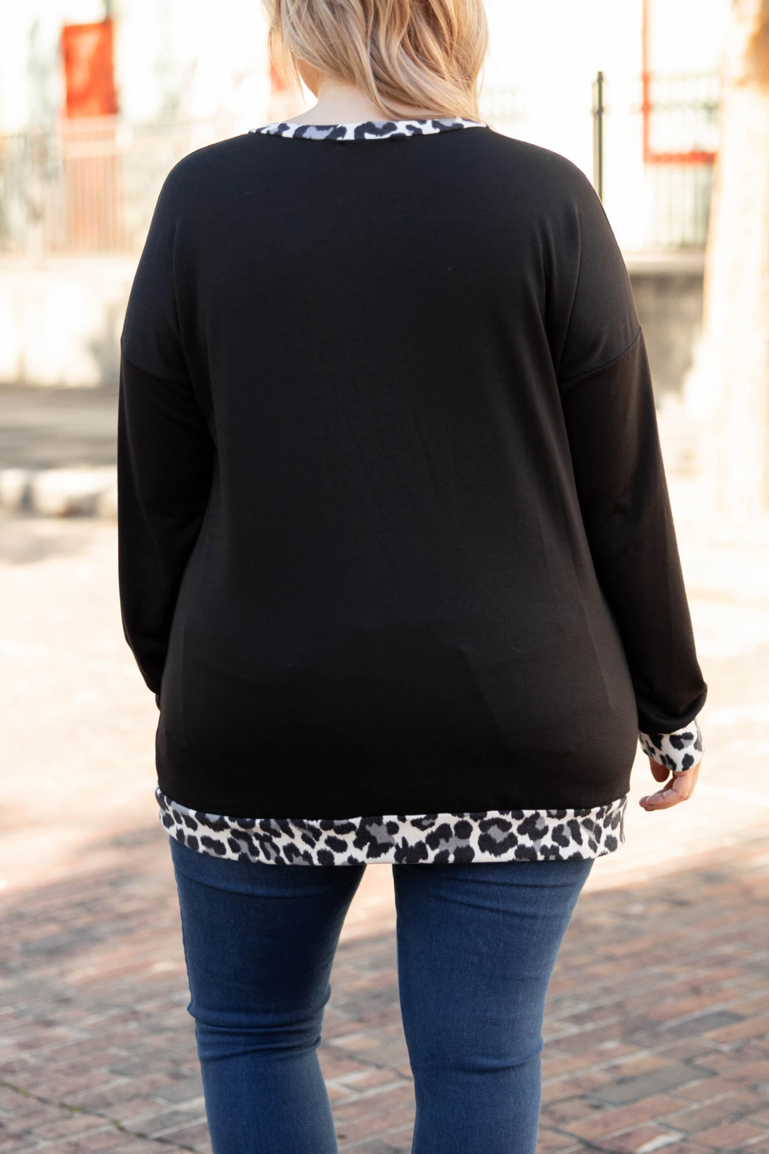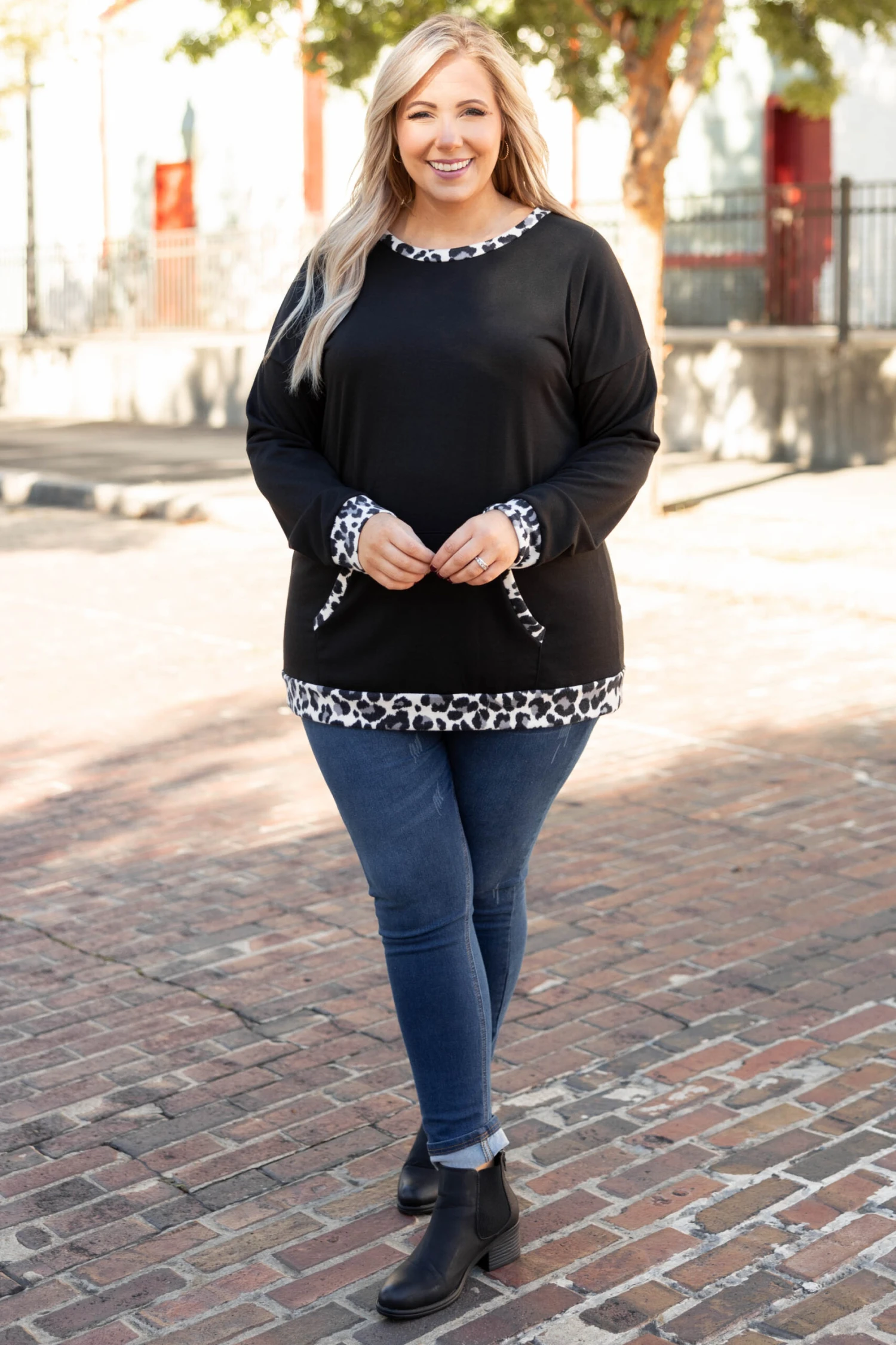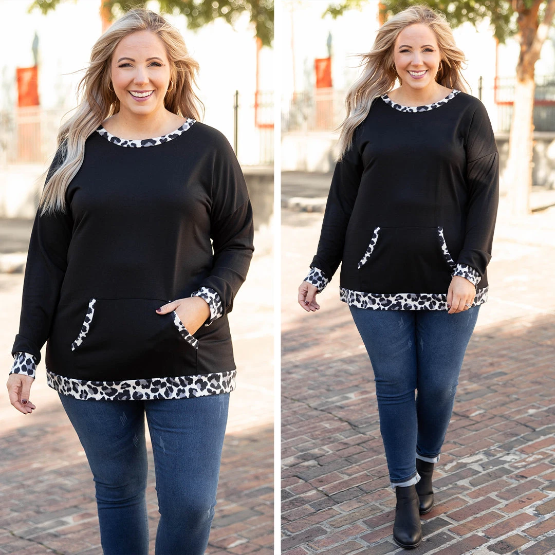 Leave behind last year’s wardrobe and add this beauty to your cart today! This pullover has a classic black color with a chic leopard print you can style with your favorite shoes and accessories! It’s comfortable for all-day wear, has a figure-flattering fit, and even features pockets! Simply style this pullover with skinnies and booties for an easy everyday look!