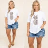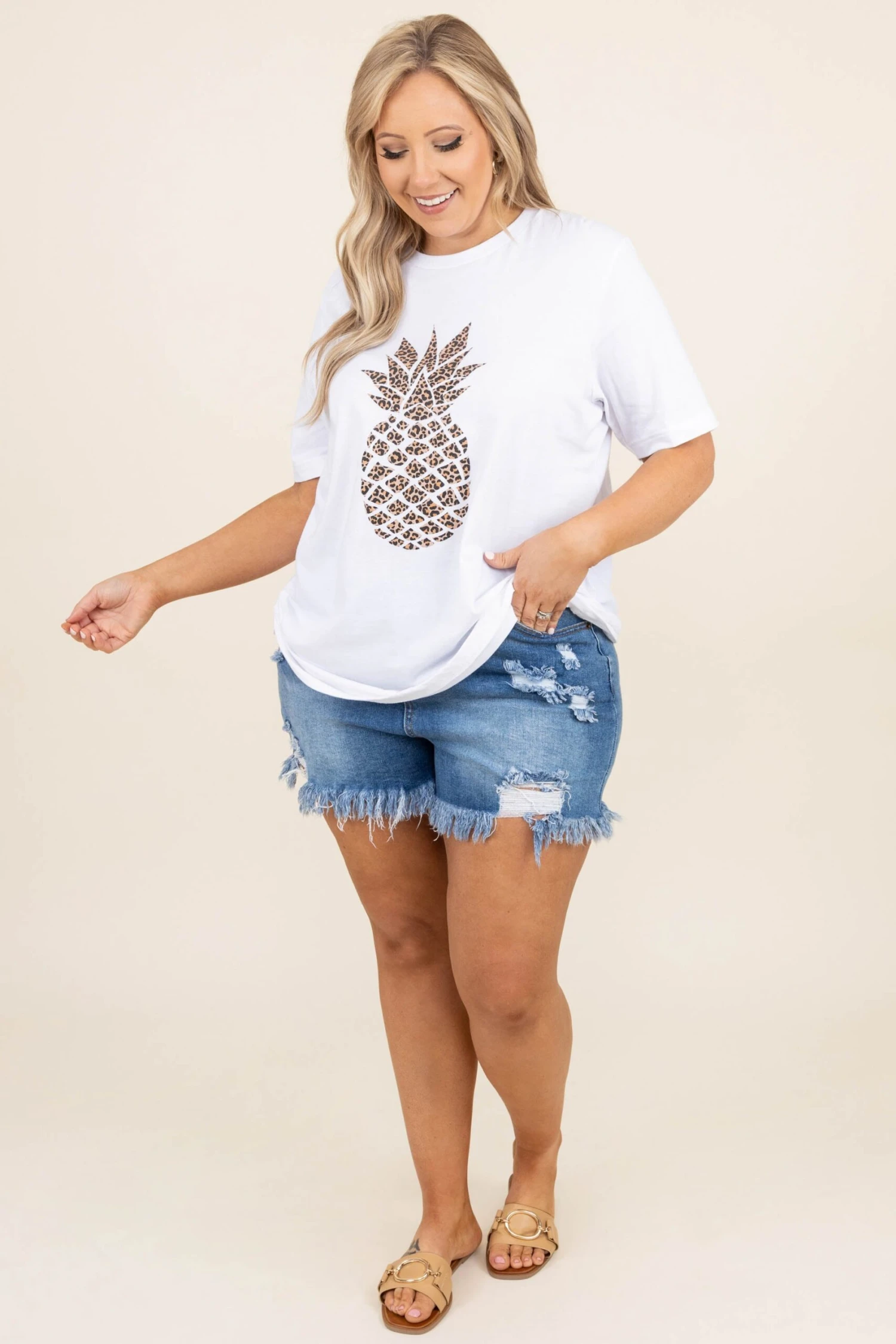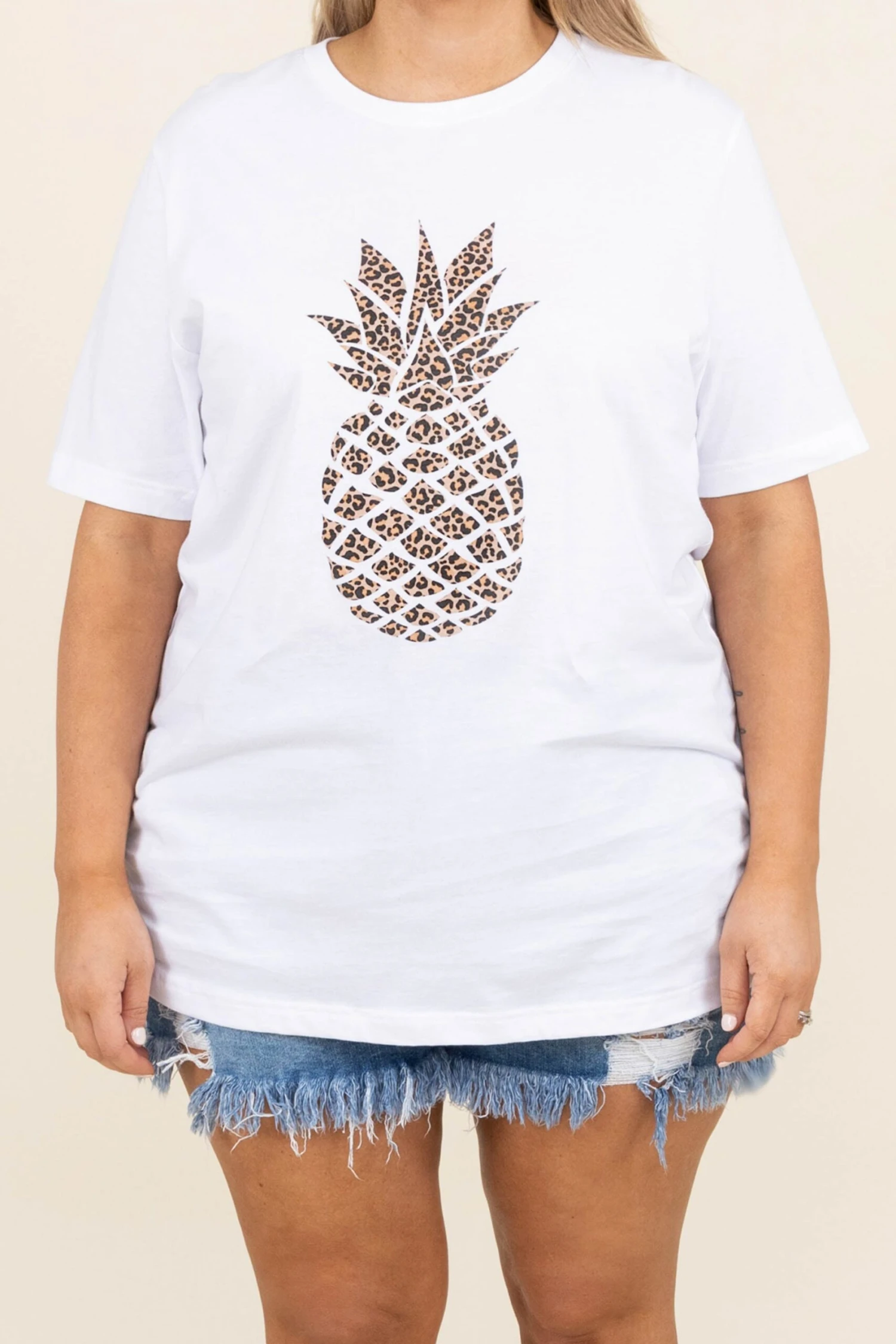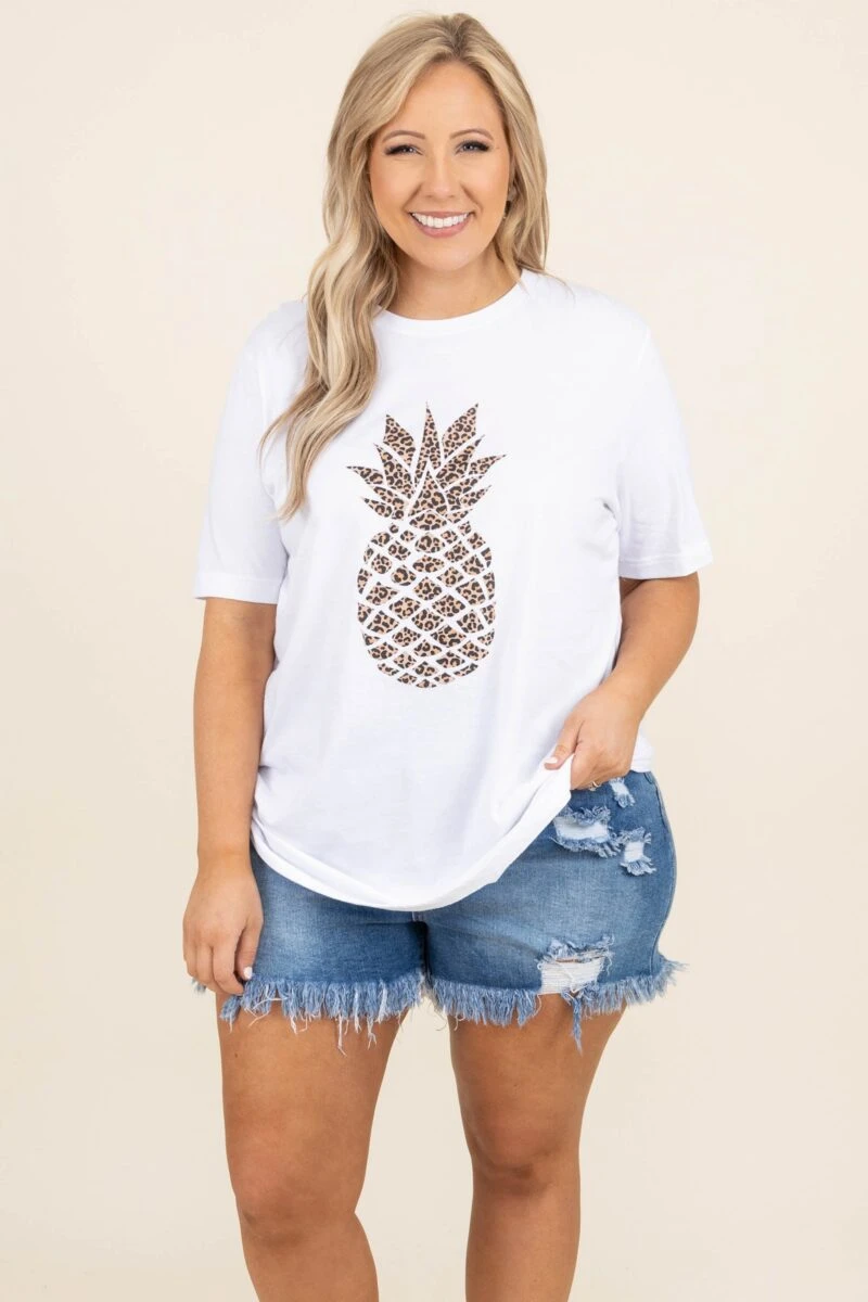 This tee has us obsessing! The white color is so easy to pair with anything and the loose tee fit is so comfy! The leopard pineapple is perfect for warm weather and the leopard pattern is so fierce! Style this cutie with your fave jean shorts for an easy but chic look this spring!