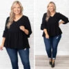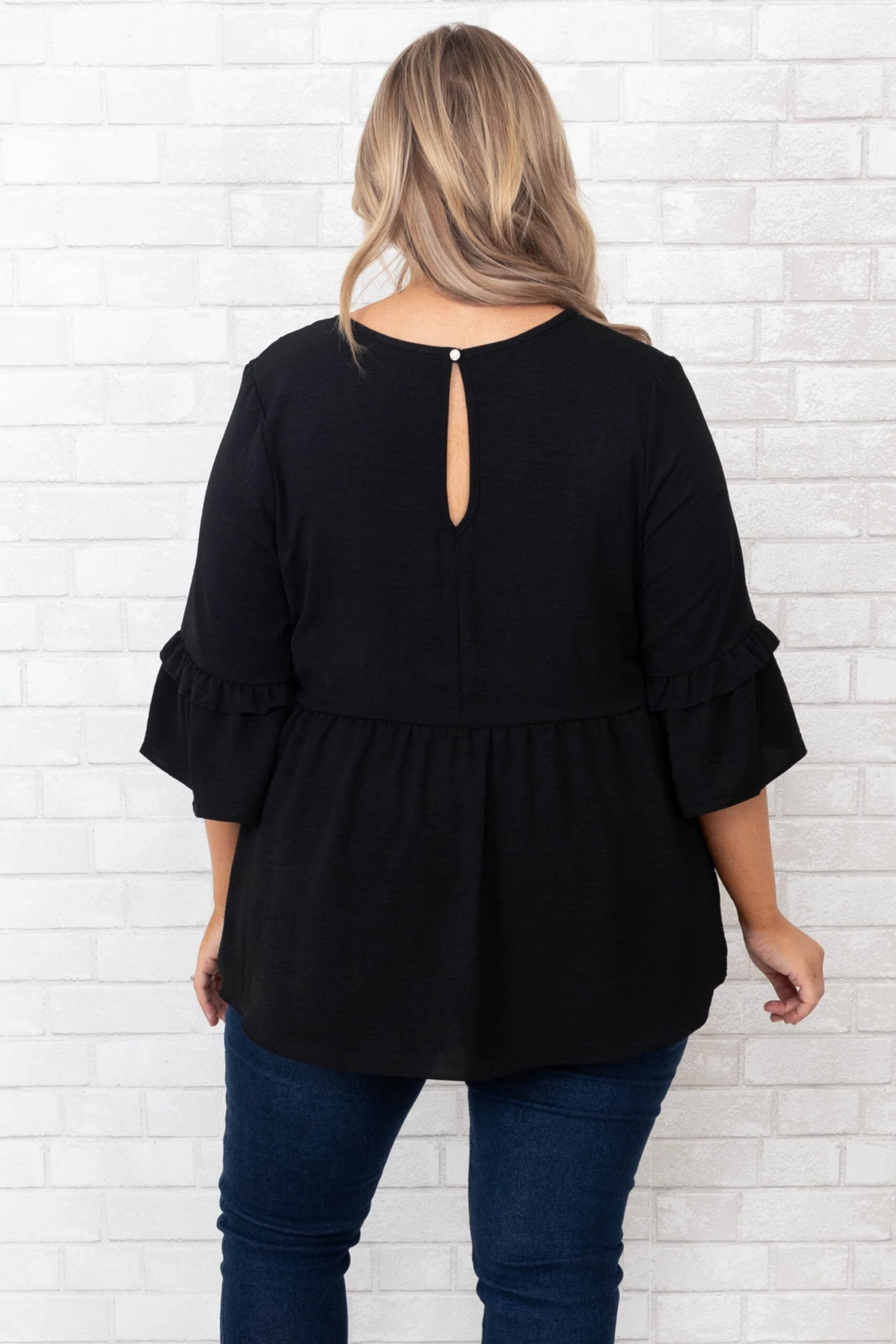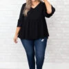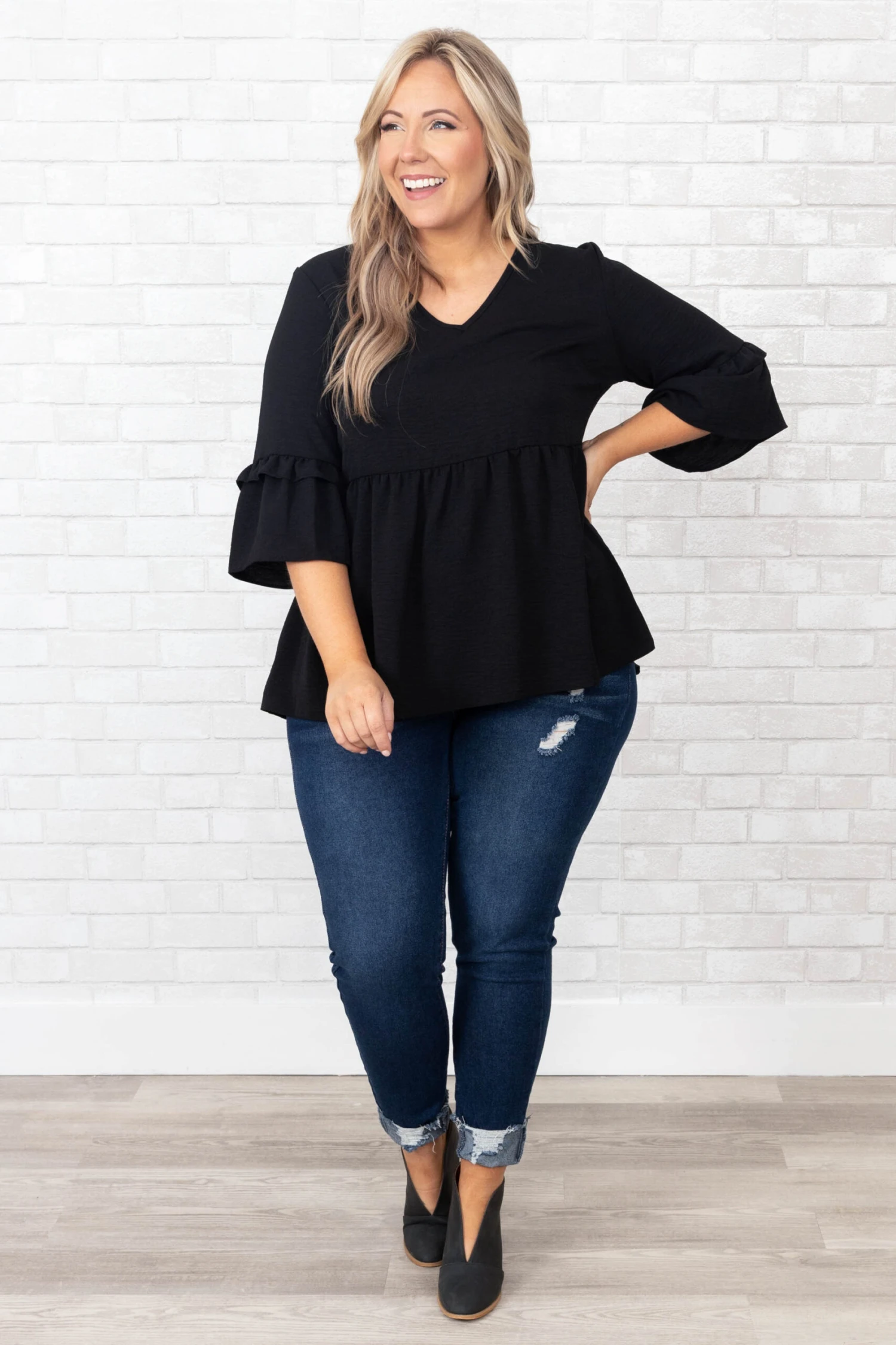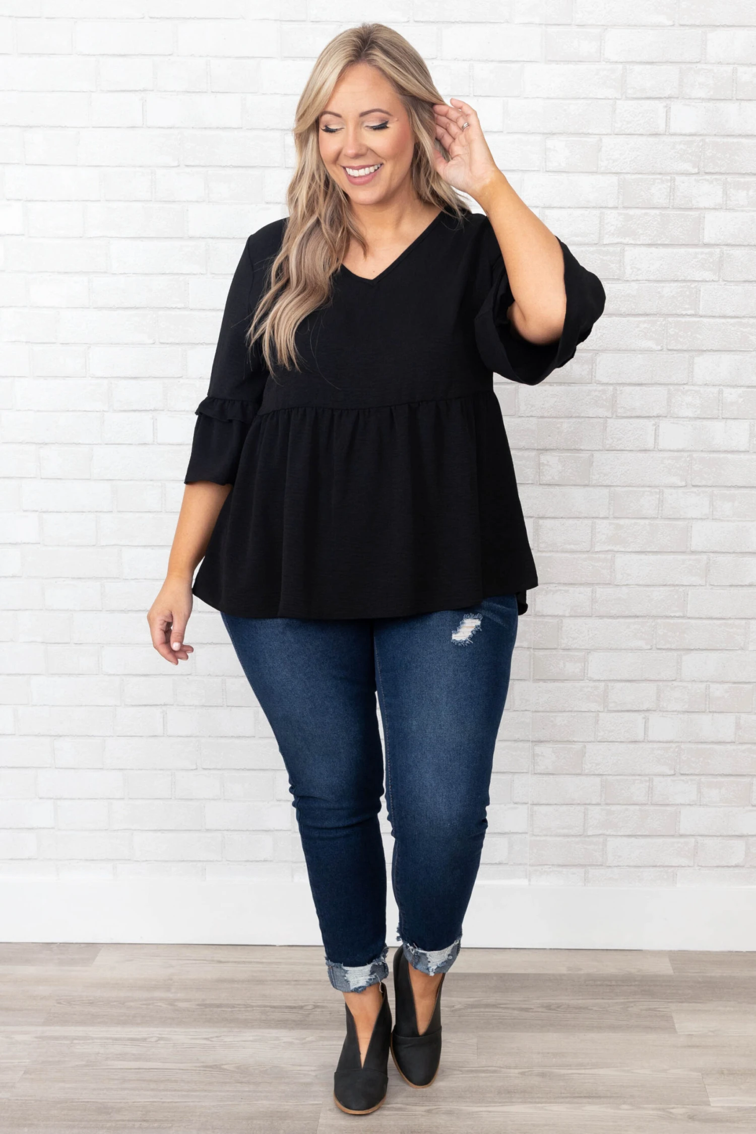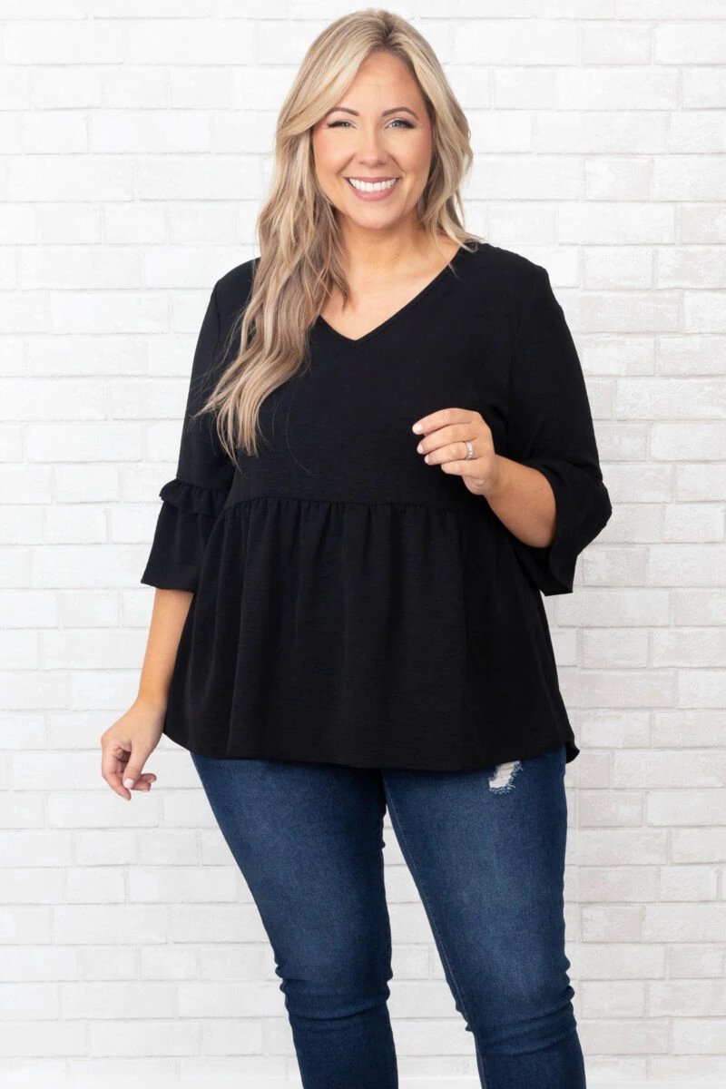 We simply love this beautiful top! This top has a classic black color with ruffles sleeves and a babydoll design that is super sweet! Style this top with skinnies and booties for a classy chic look!