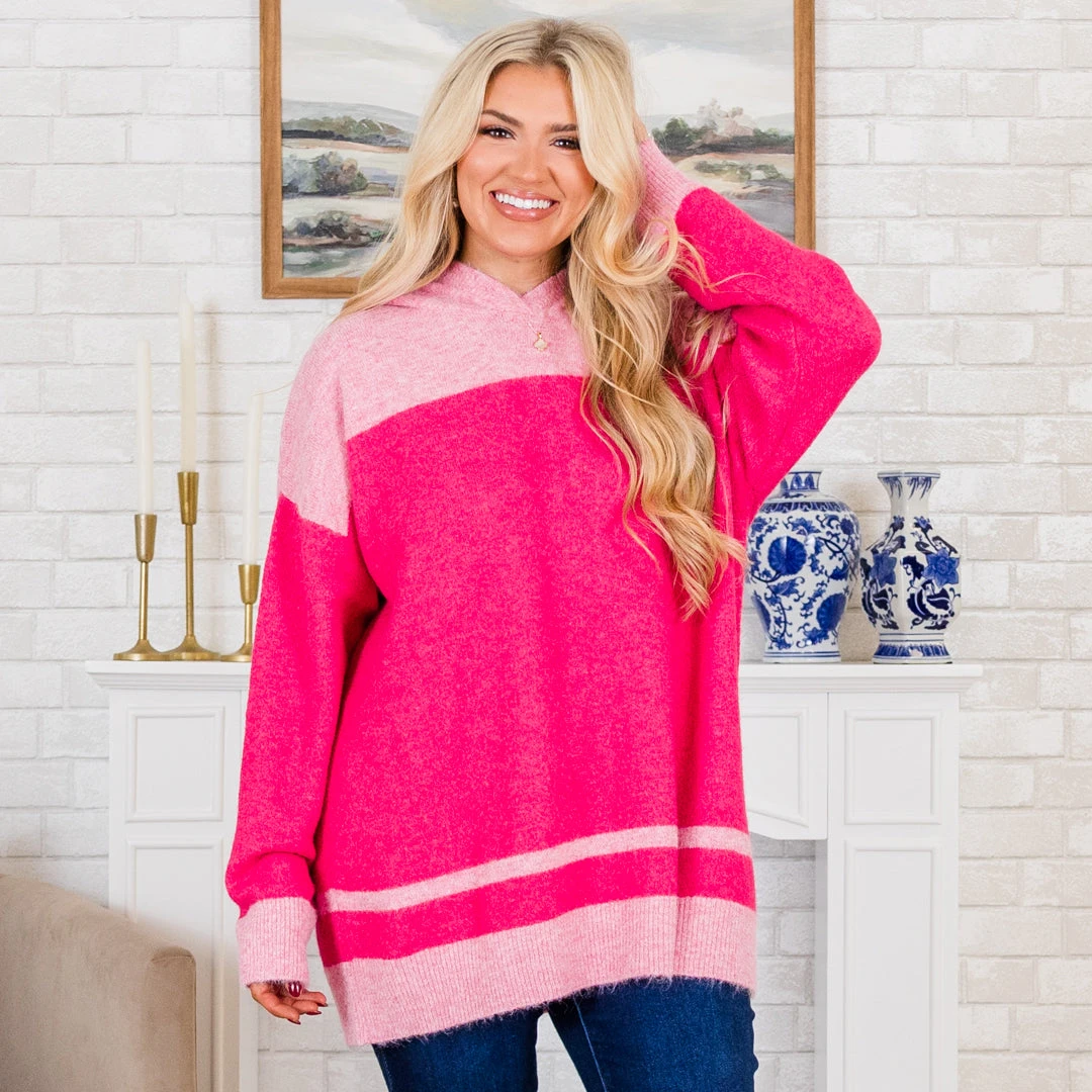 The Let Me Talk Sweater in pink is the perfect addition to your wardrobe! With its trendy color block design and comfortable hoodie, it will keep you warm and stylish all day long! Whether you’re running errands or lounging at home, this sweater has got you covered!
