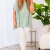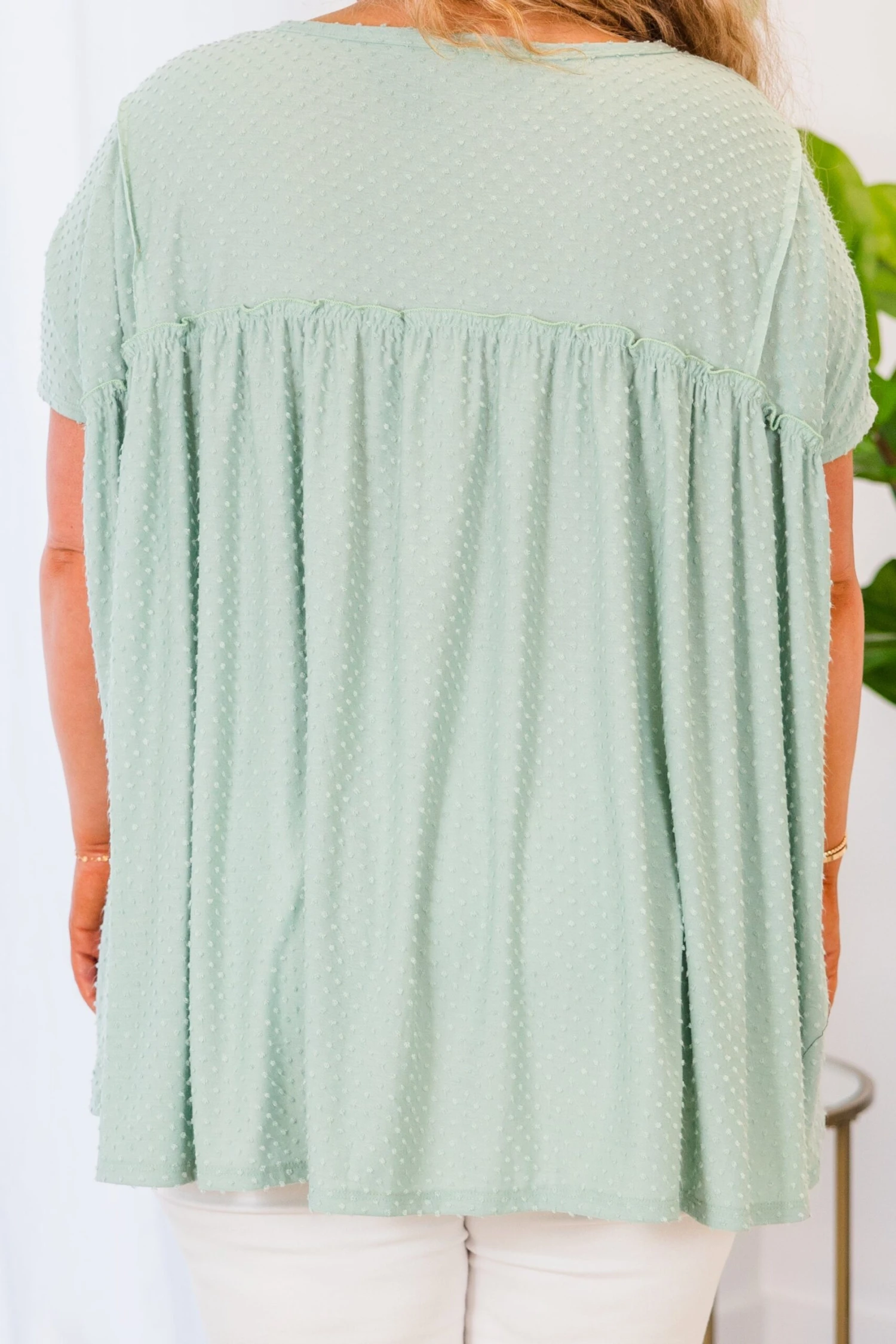 Let’s chat about how adorable this top is! Its gorgeous seafoam color and raised polka dot pattern adds a touch of fun to any outfit! Made for comfort, this top pairs perfectly with white denim and sandals, creating a classy and chic look!
