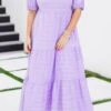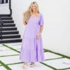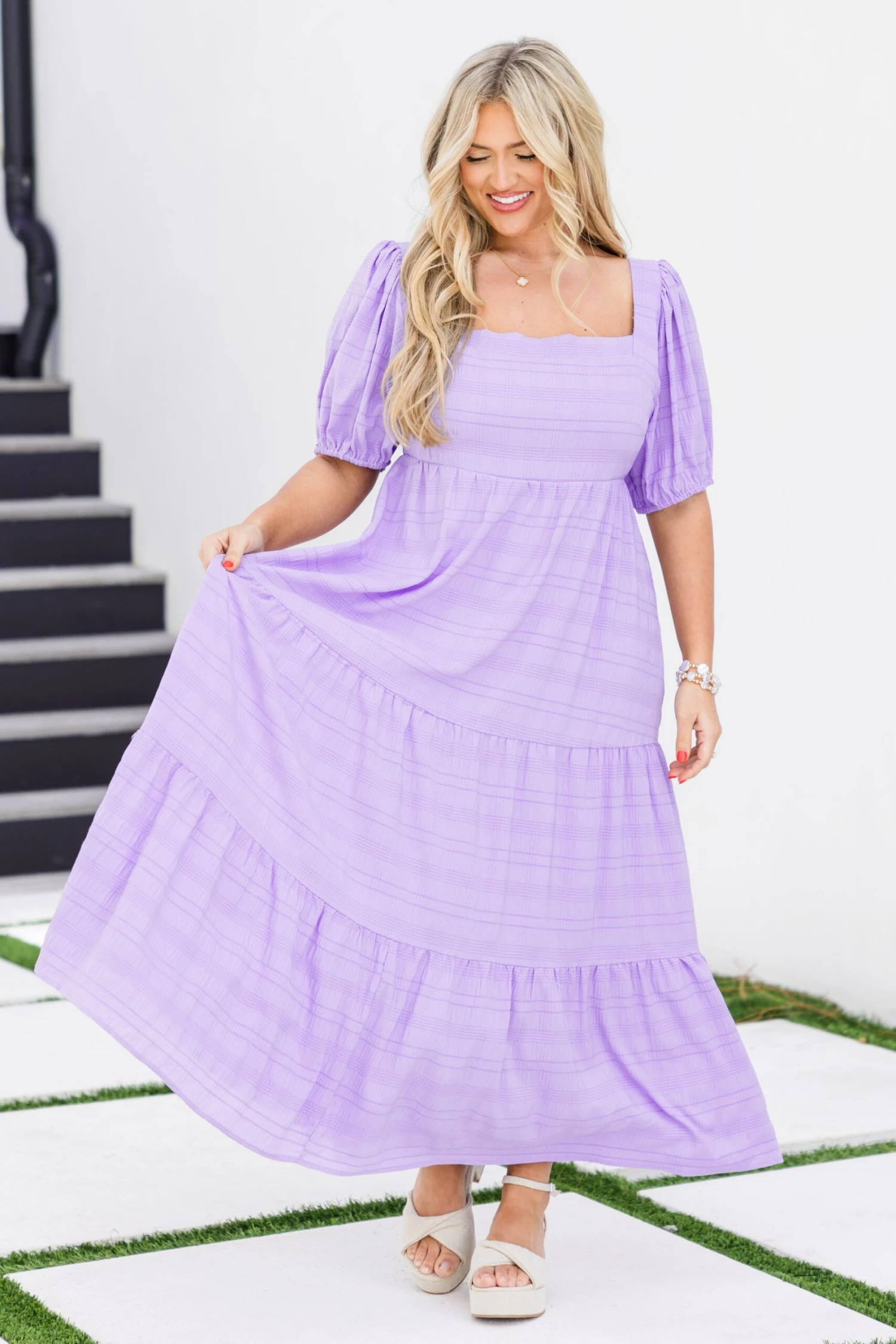 Enjoy the perfect getaway in this mesmerizing dress! It is the perfect choice for any brunch date! Its monochromatic stripe pattern and lovely lavender color make it a stylish and feminine option! The bubble sleeves and flowy fit add a touch of charm, while providing a comfortable and flattering look! Get ready to turn heads in this must-have dress!