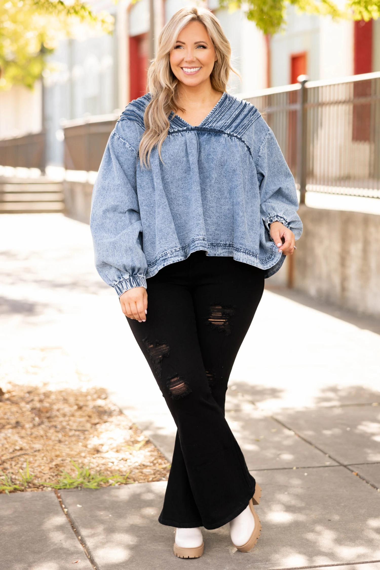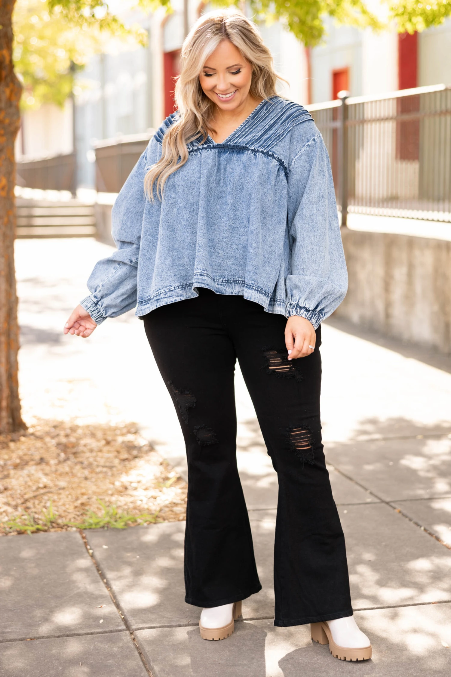 Go on an adventure in this gorgeous top! This denim top has a flirty babydoll design and a trendy acid wash style this is just in time for the season! Pack this beaty for your next cross country adventure and you won’t regret it! Style this top with some flare jeans and booties or heels for a classy chic look!