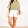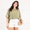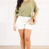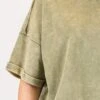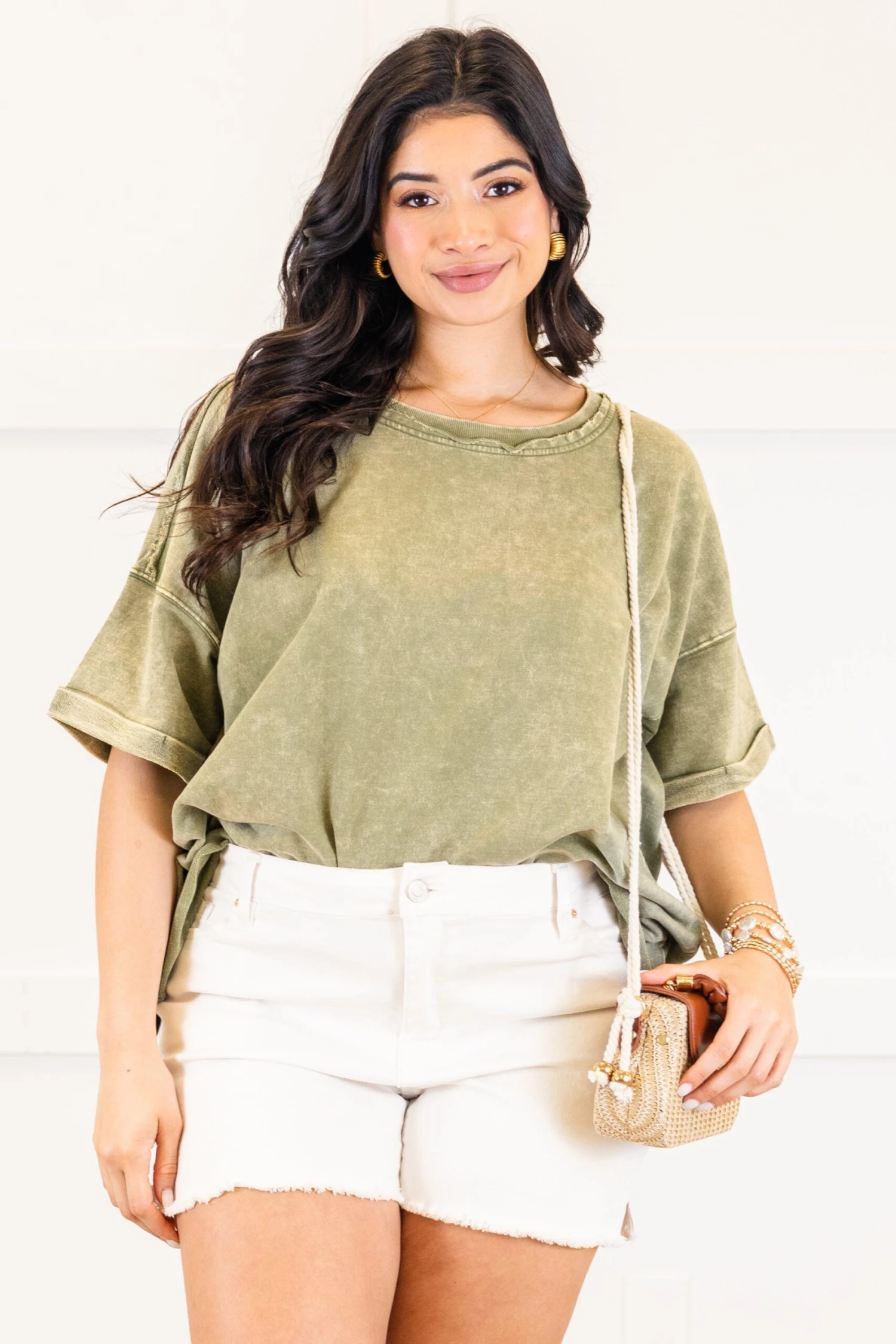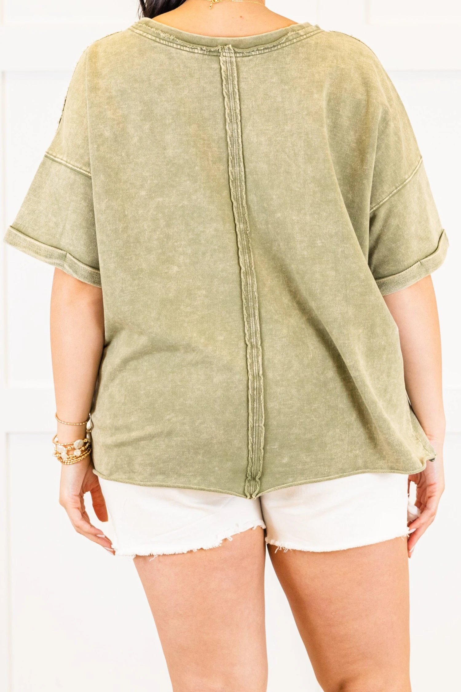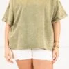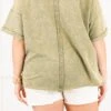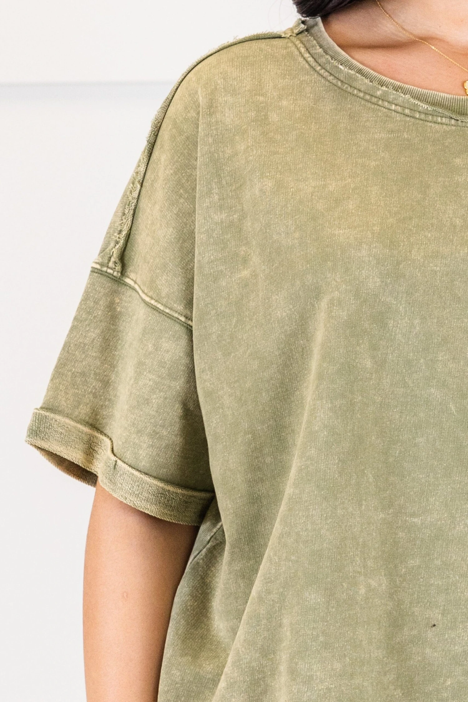 Get ready to have some fun in this top! Made from french terry fabric with a unique acid wash, this drop shoulder top is both stylish and comfortable! Tacked cuffs and exposed seam details add an edgy touch! Get ready to turn heads in this light olive top!
