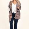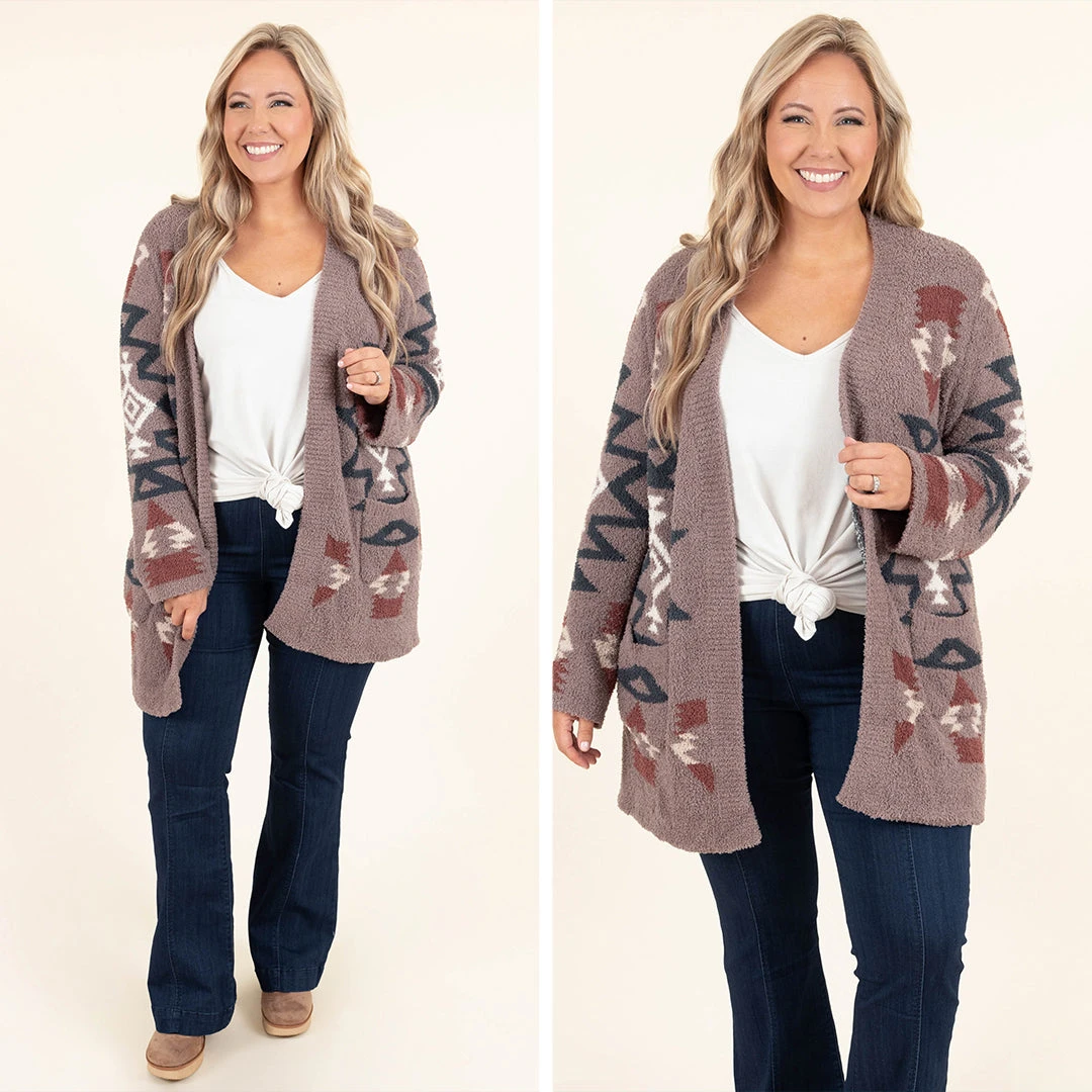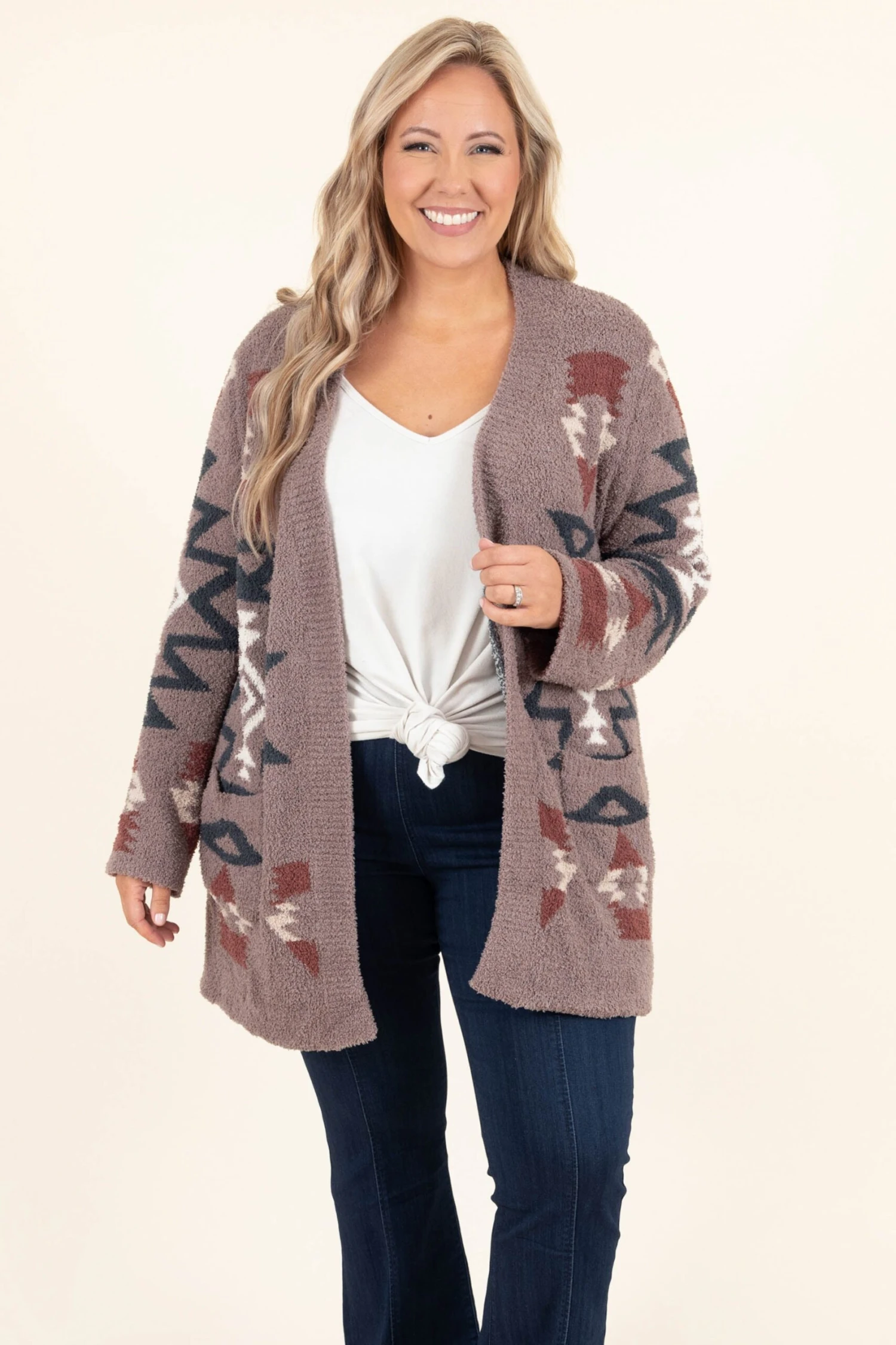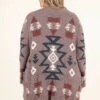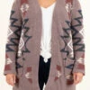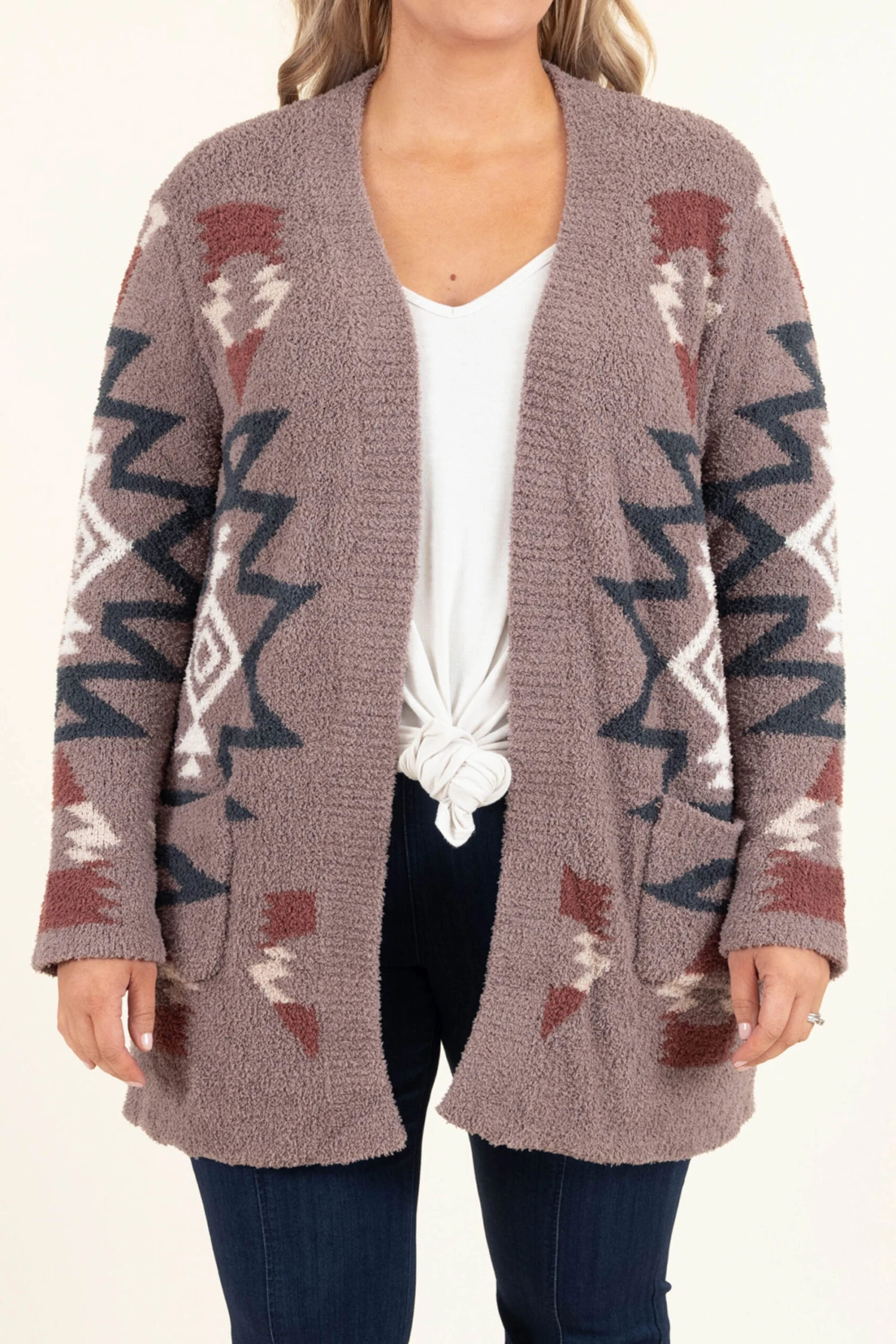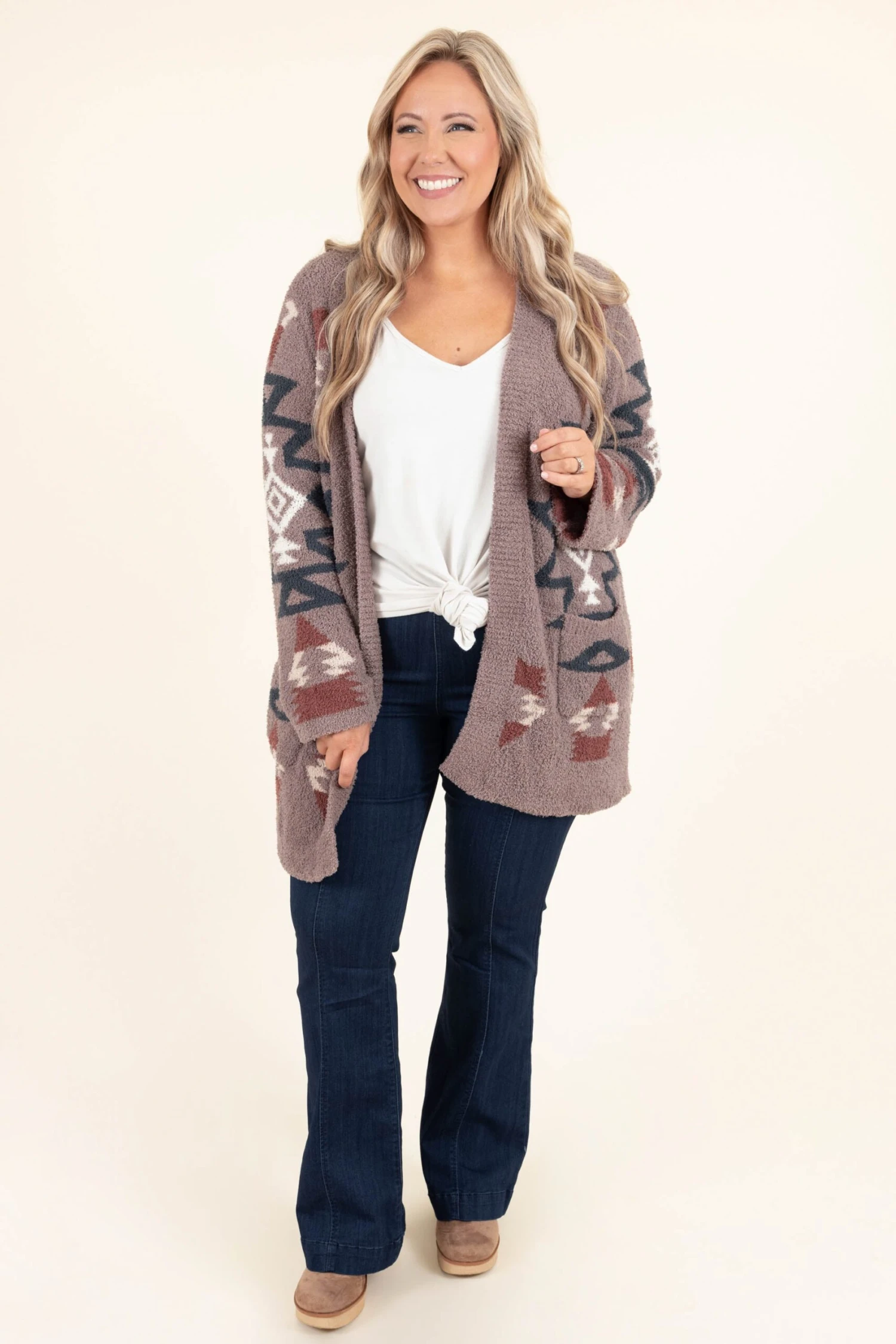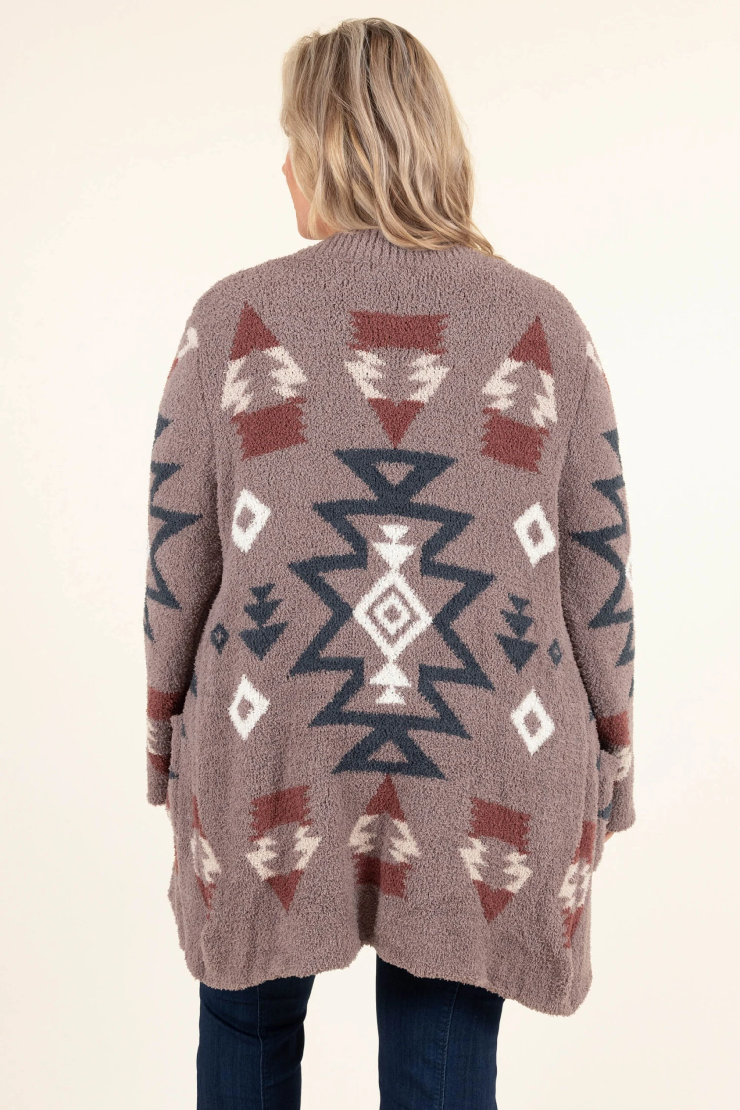 Stay snuggled up this season in this fun cardigan! It has a gorgeous mocha color with a unique Aztec design that is super sweet! Simply style this cardigan with a solid top and some cute denim for a trendy, chic look!