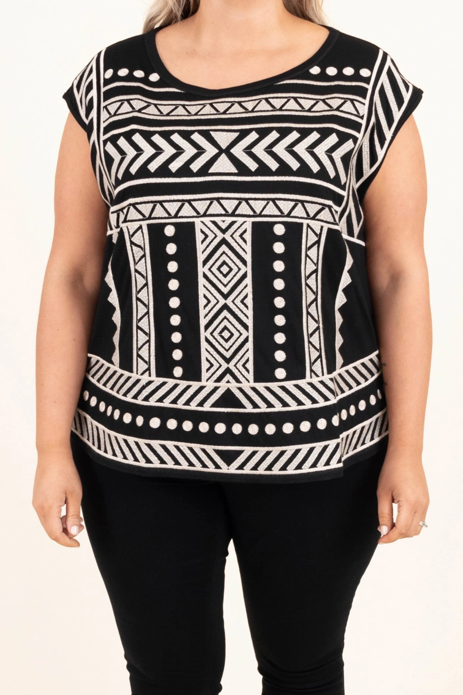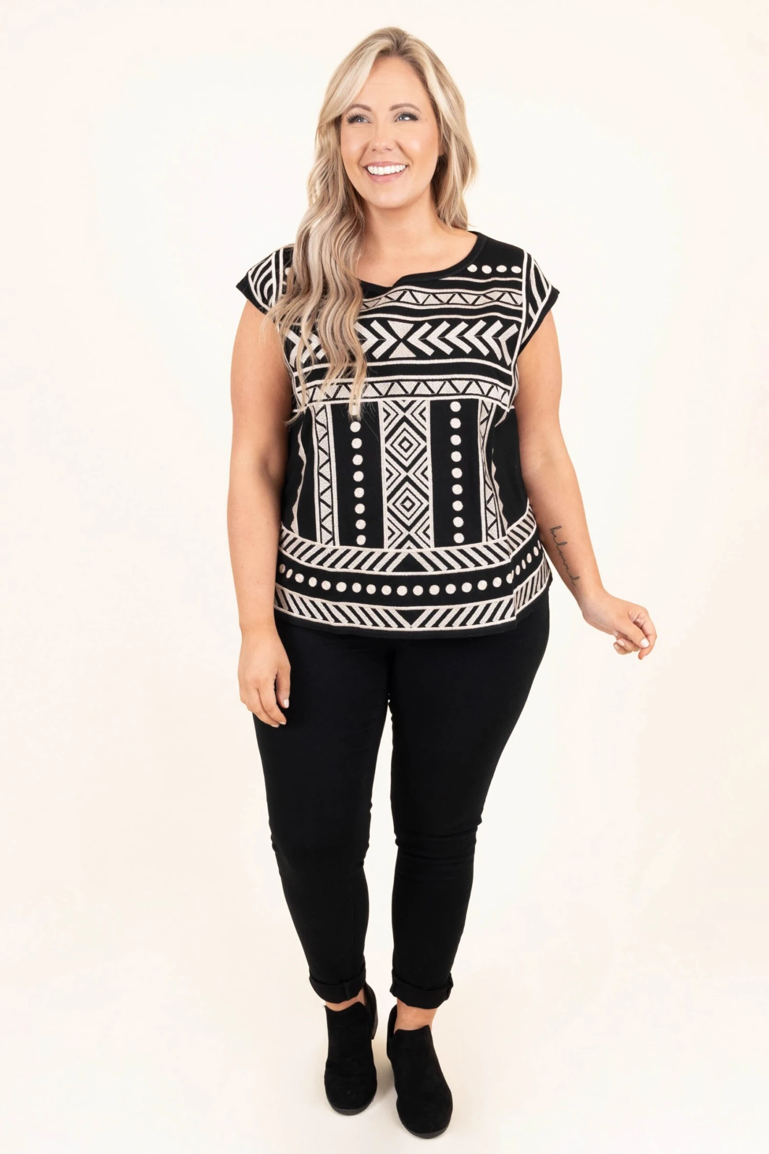 Everyone will stop and look at how beautiful you are in this top! This top has a lovely neutral color with a trendy embroidered design! The figure flattering fit is perfect for all day wear this season! Pair this top with some skinnies and booties for a casual, chic look!