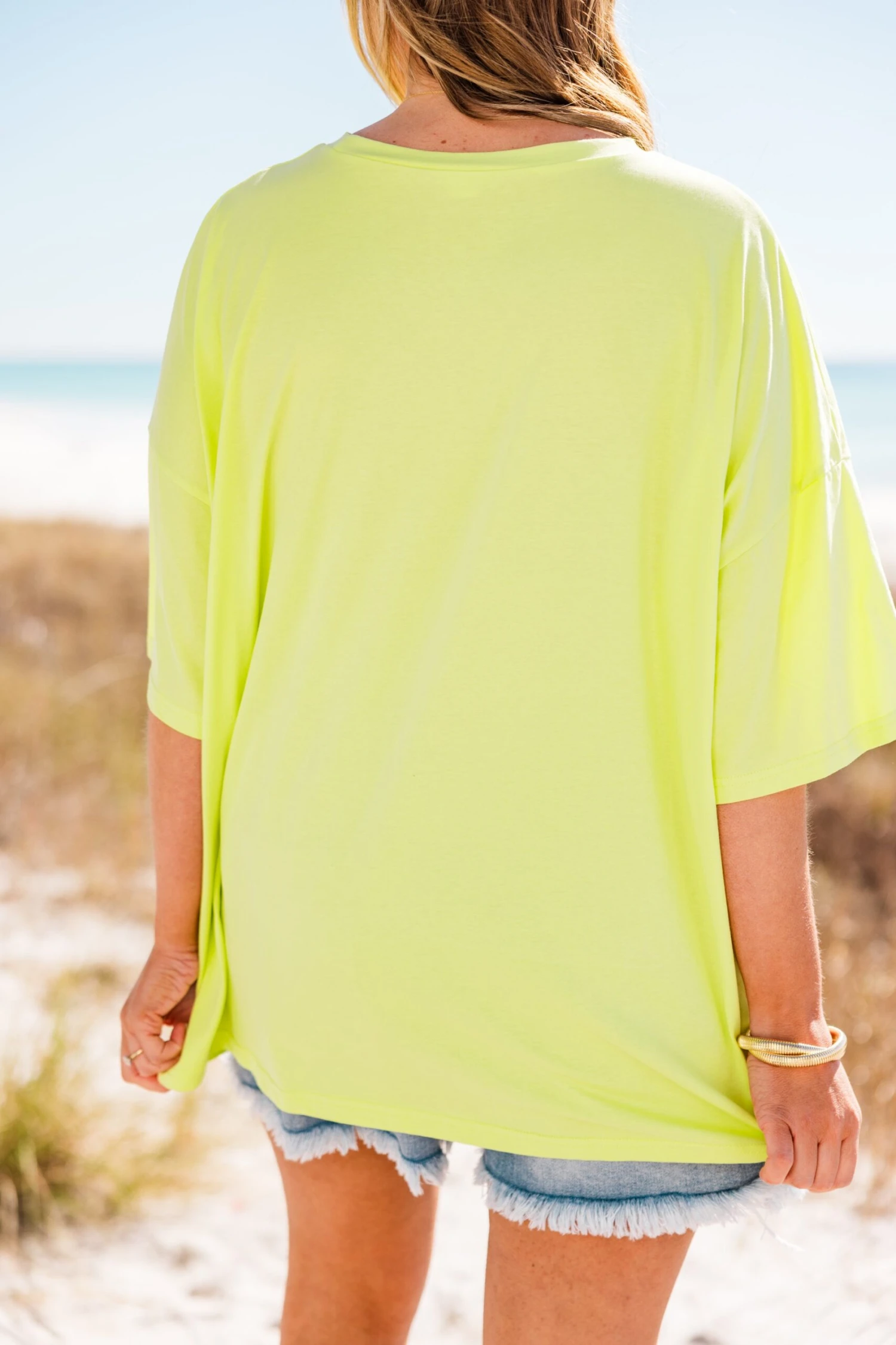 Be bold and make a statement with this FAB tee! Featuring an adorable graphic and oversized fit, this tee is perfect for a casual outing! Let the vibrant neon lime color brighten up your day and your wardrobe!