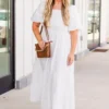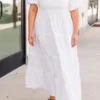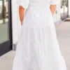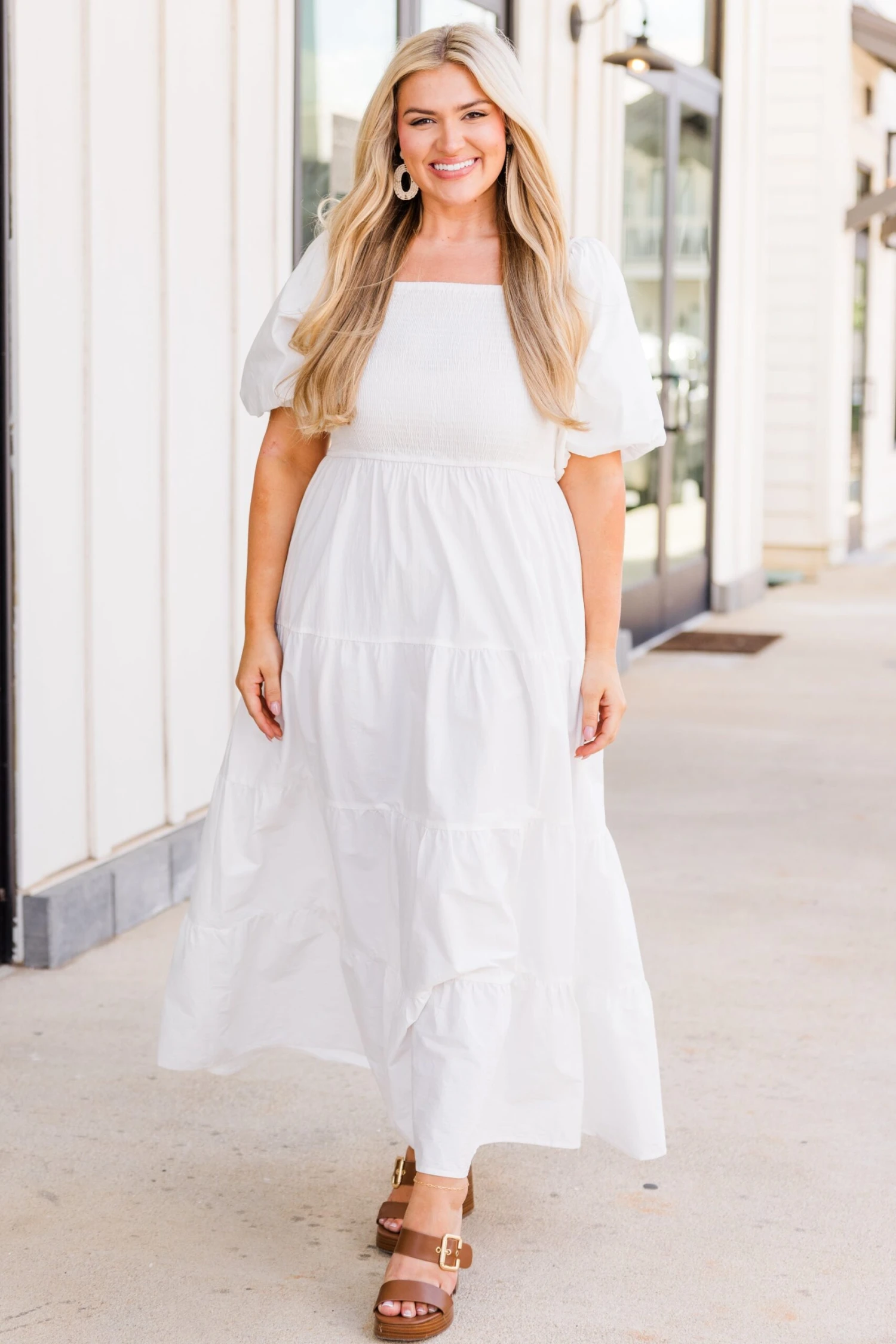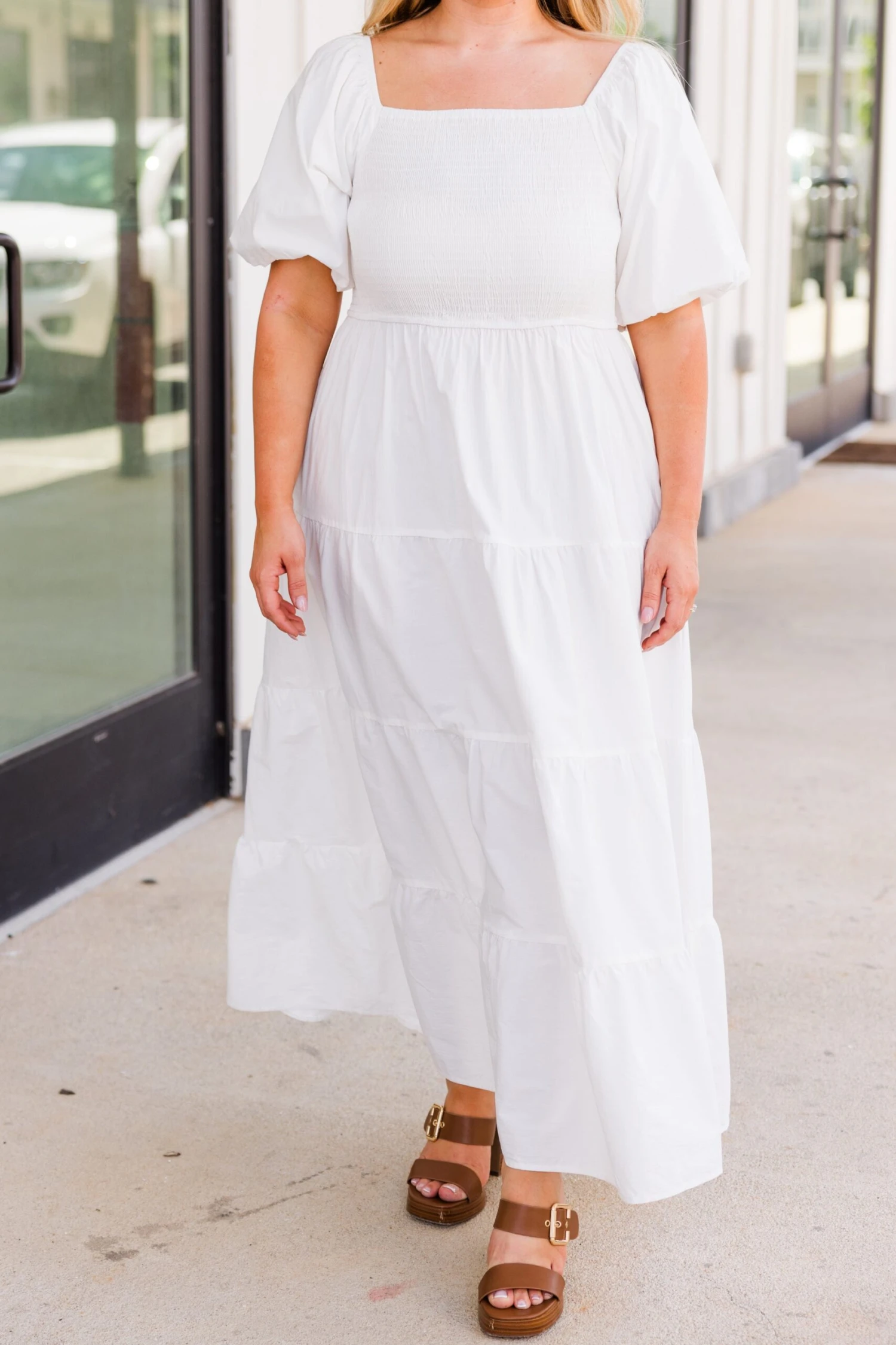 Embrace life’s gifts in this snow-colored dress! With a smocked bodice and elastic square neckline, this maxi dress is both stylish and comfortable! The elastic bubble sleeves and tiered skirt add a fun touch, making it perfect for a summer night out or the bride to be!