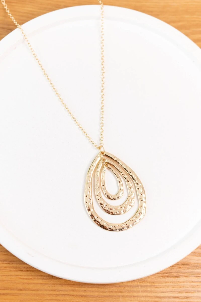 This necklace is sure to charm! The gold color can be paired with anything in your closet and the long chain makes this perfect for a statement piece! The teardrop pendant is so stylish and the hammered look is so trendy! Style this with a basic top and skinnies to add flair to your outfit!