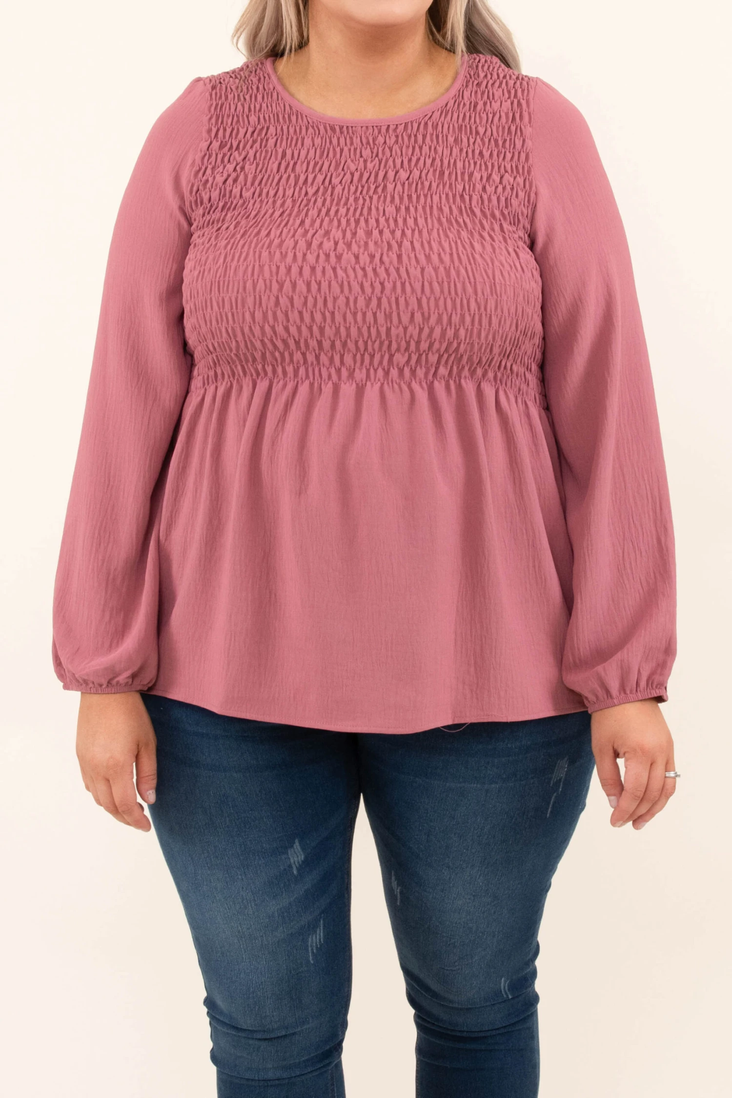 This top is so worth it! It has a wonderful mulberry color and a cute baby doll style and the trendy smocking fabric across the chest. It’s perfect for a day at the office or a fun dinner with friends! Style it with dark wash skinnies and booties for a trendy look!