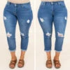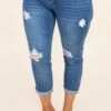 We are living for these jeans! The medium wash color will match everything and they can be worn cuffed or uncuffed depending on the look you want! The distressed look is right on trend and will look so good paired with all of your fave tops and sandals for great looks!