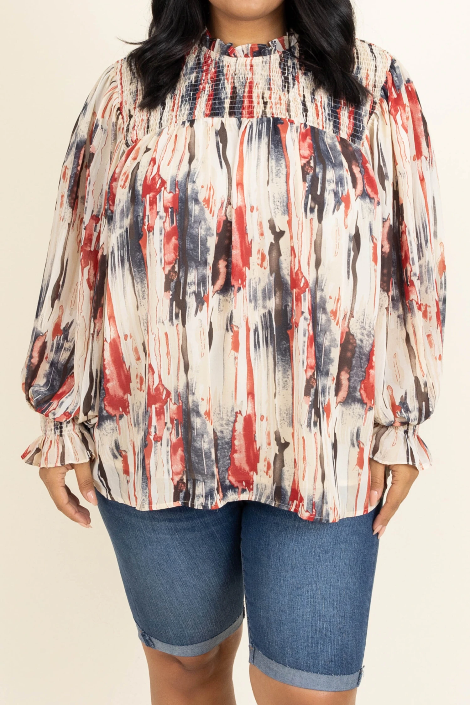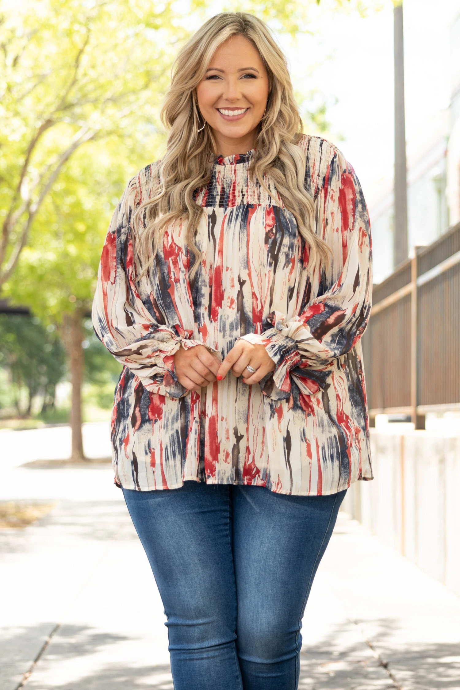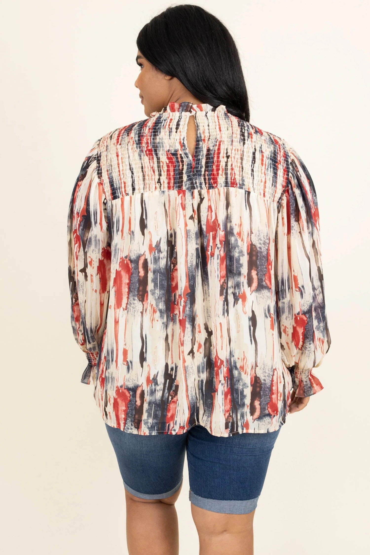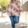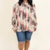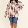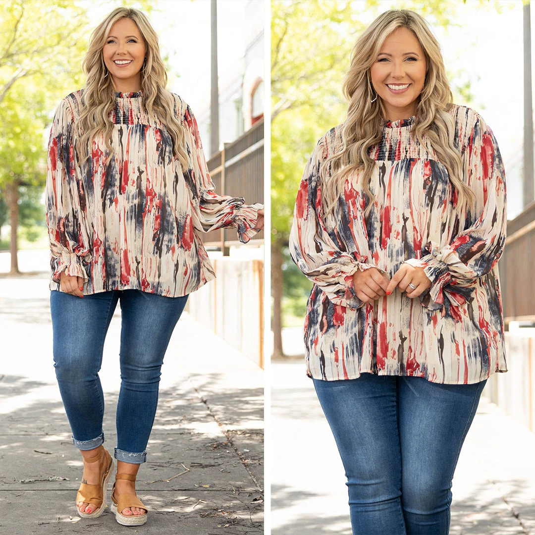 Live your life in this top! The navy and ruby colors are so pretty and the off white background really makes them pop! We love the trendy high neck look and the bubble sleeves that are so sweet! Style this with some shorts and sandals for the perfect look!