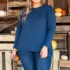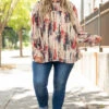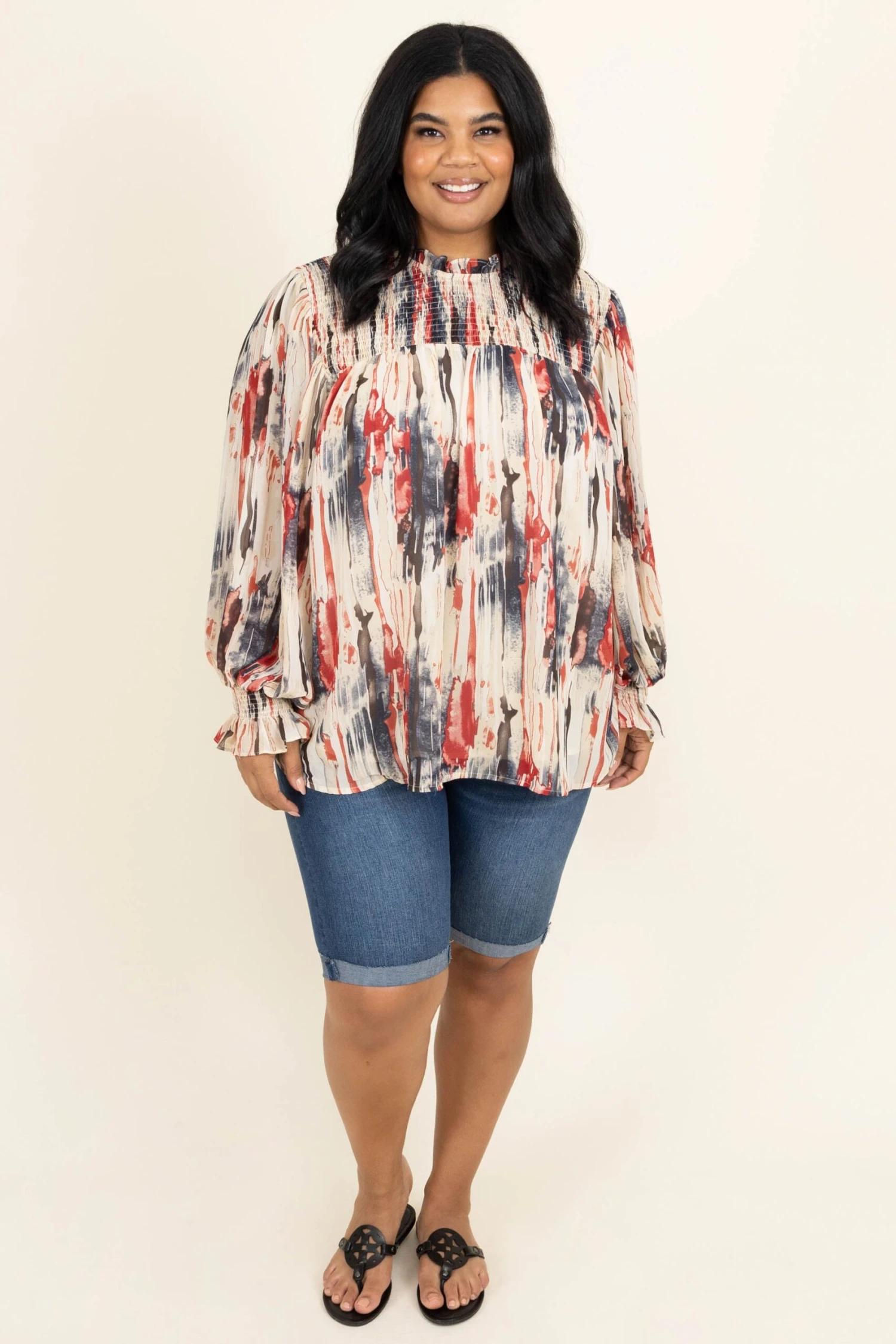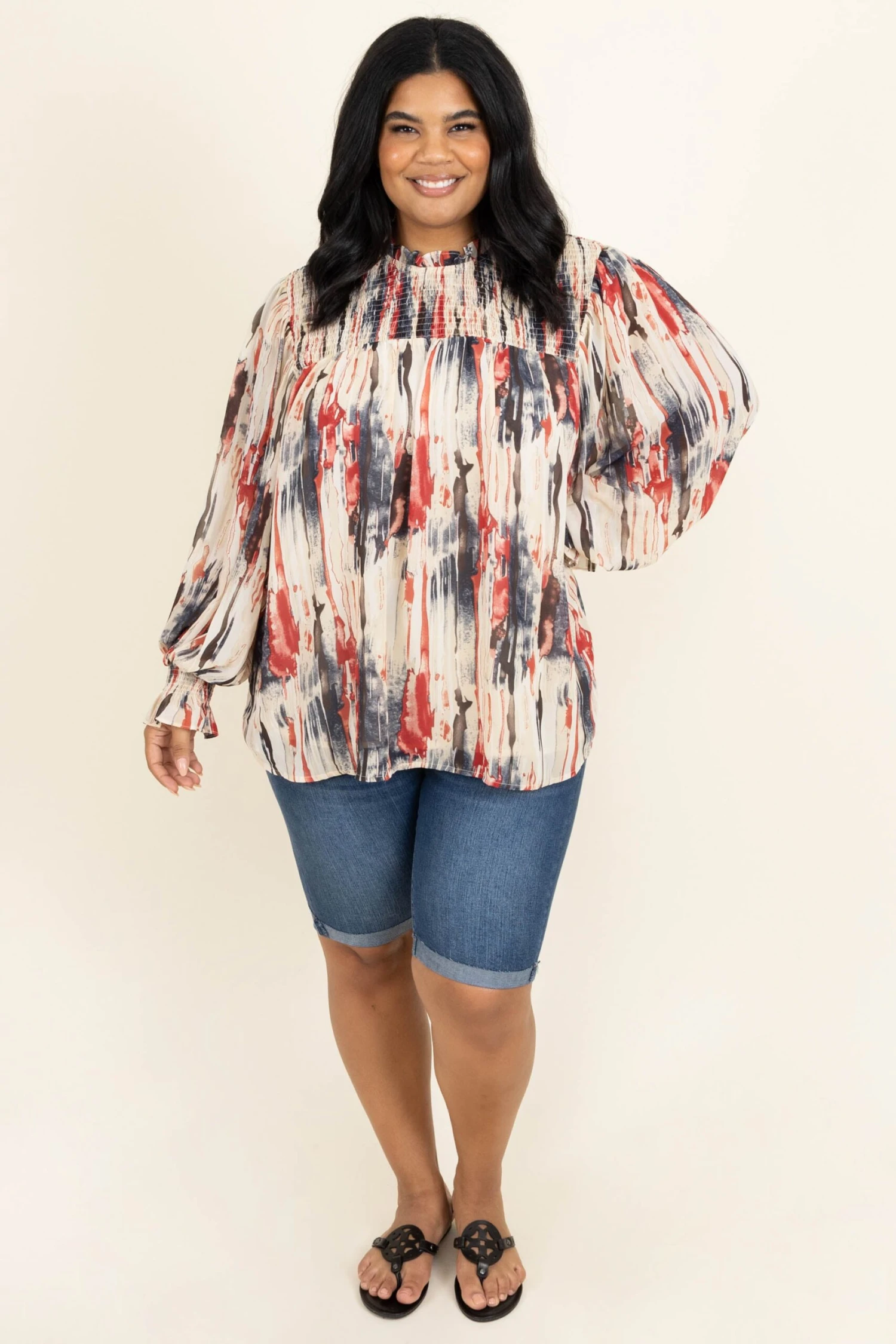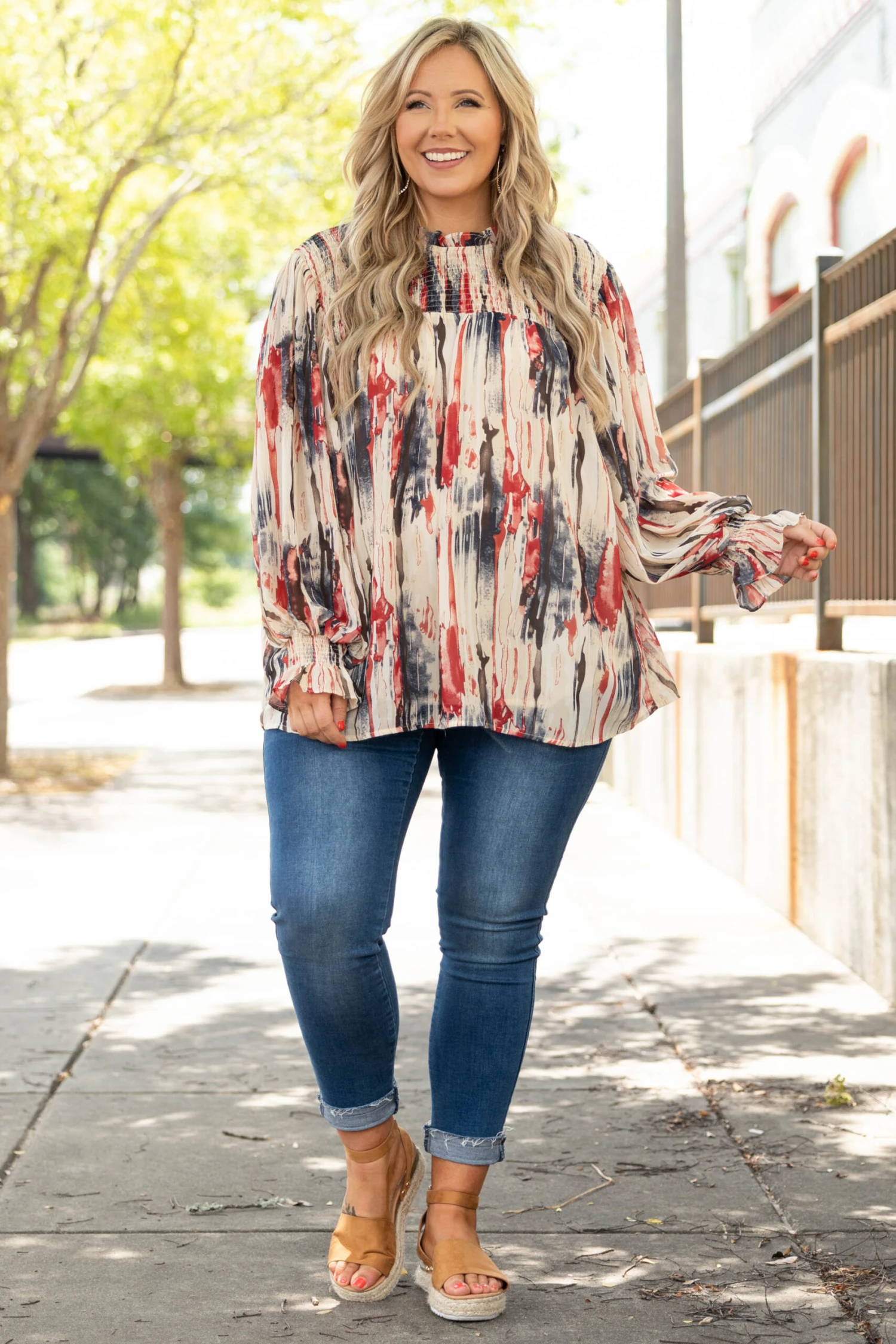 Live your life in this top! The navy and ruby colors are so pretty and the off white background really makes them pop! We love the trendy high neck look and the bubble sleeves that are so sweet! Style this with some shorts and sandals for the perfect look!
