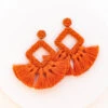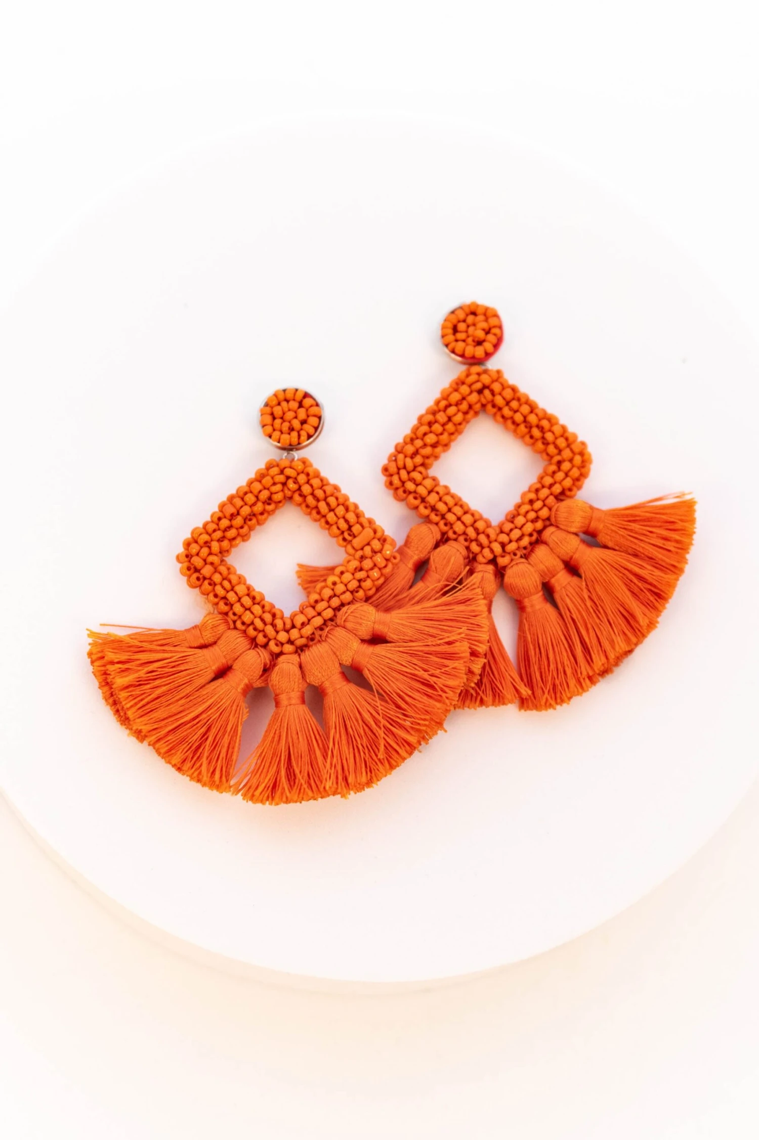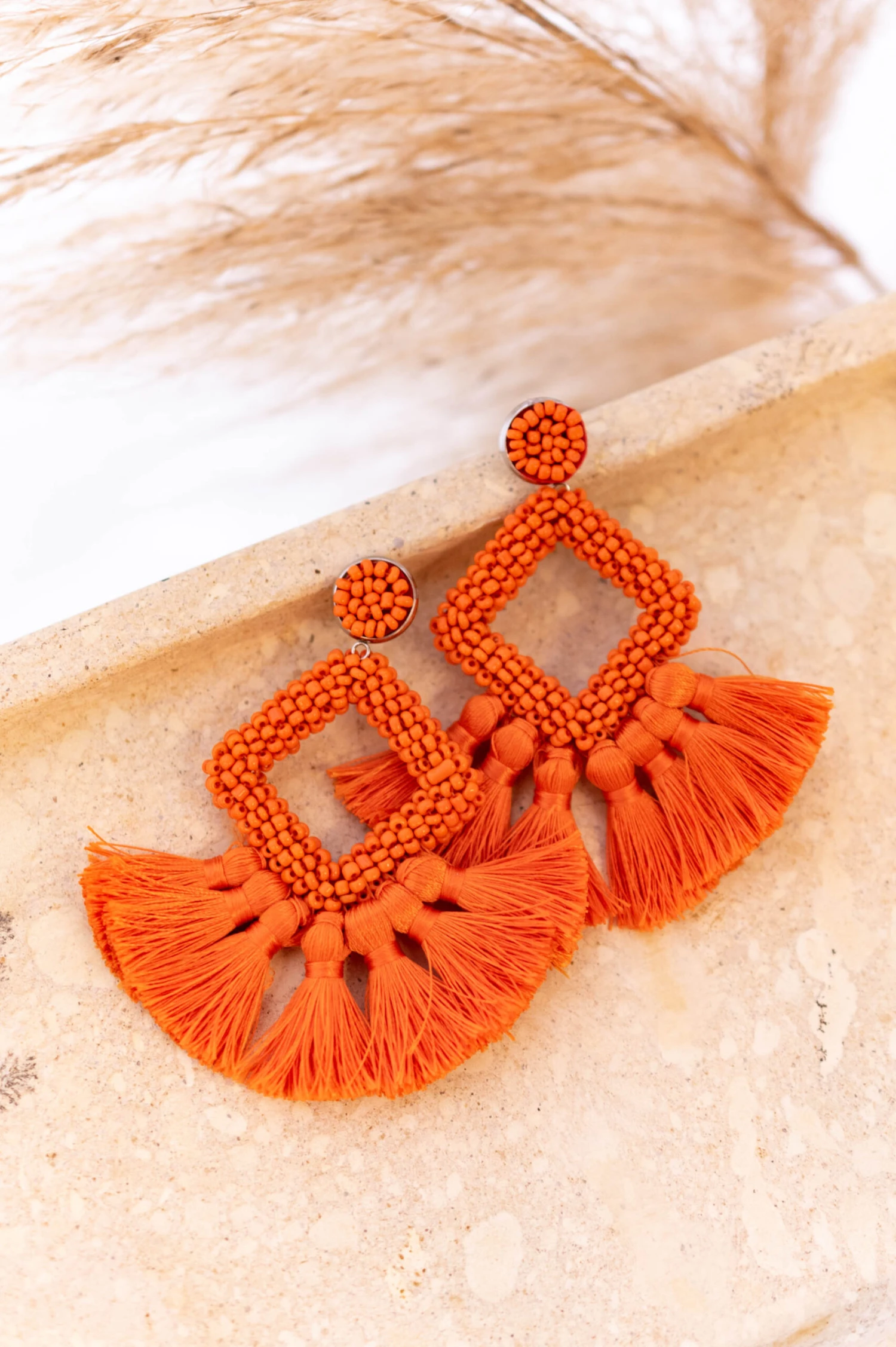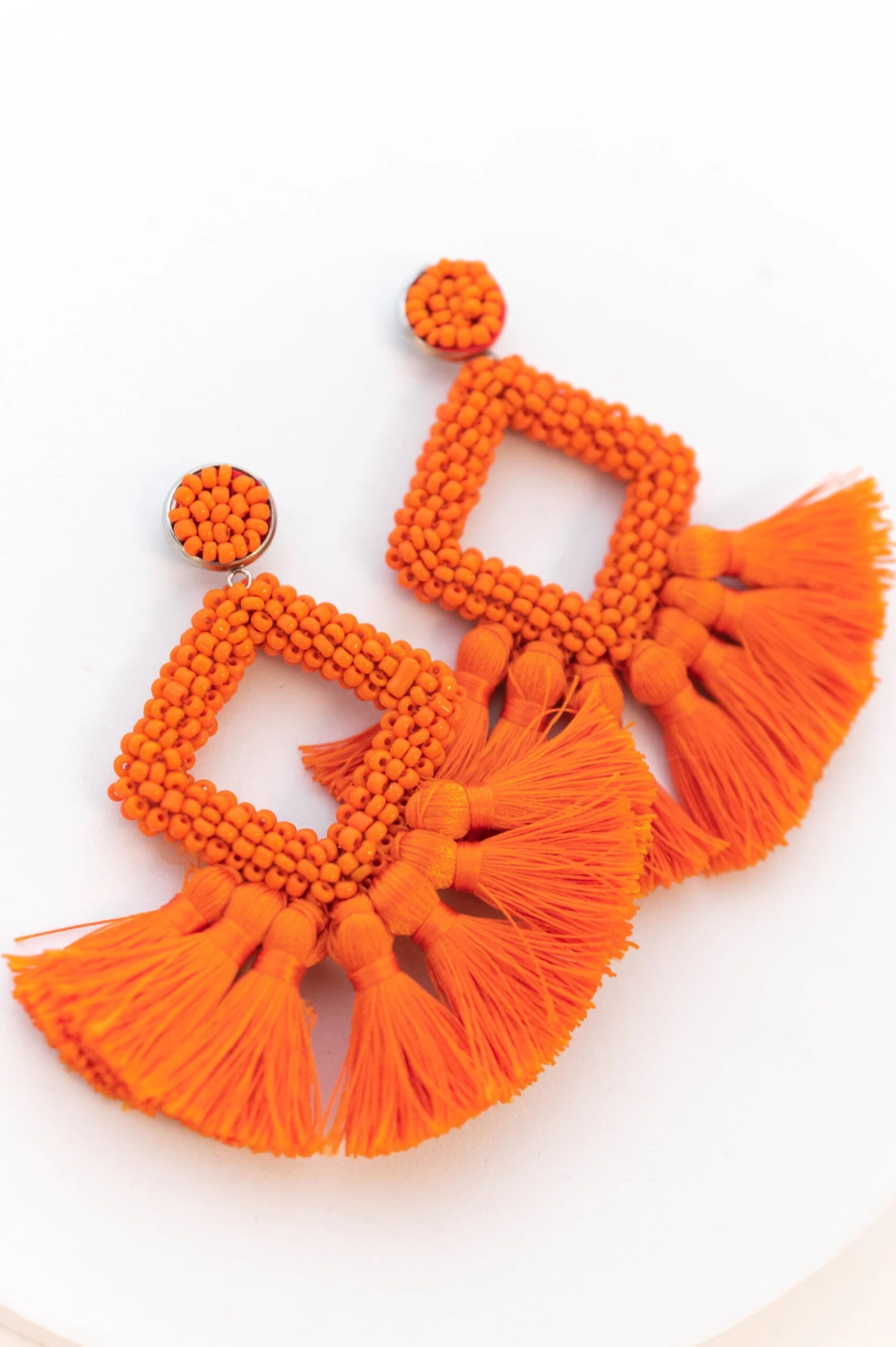 These earrings can easily be your new faves! They have bold orange color with a beaded design and tassel style that is oh so chic! The dangle style pairs well with all of your favorite tops and dresses for bold chic look!