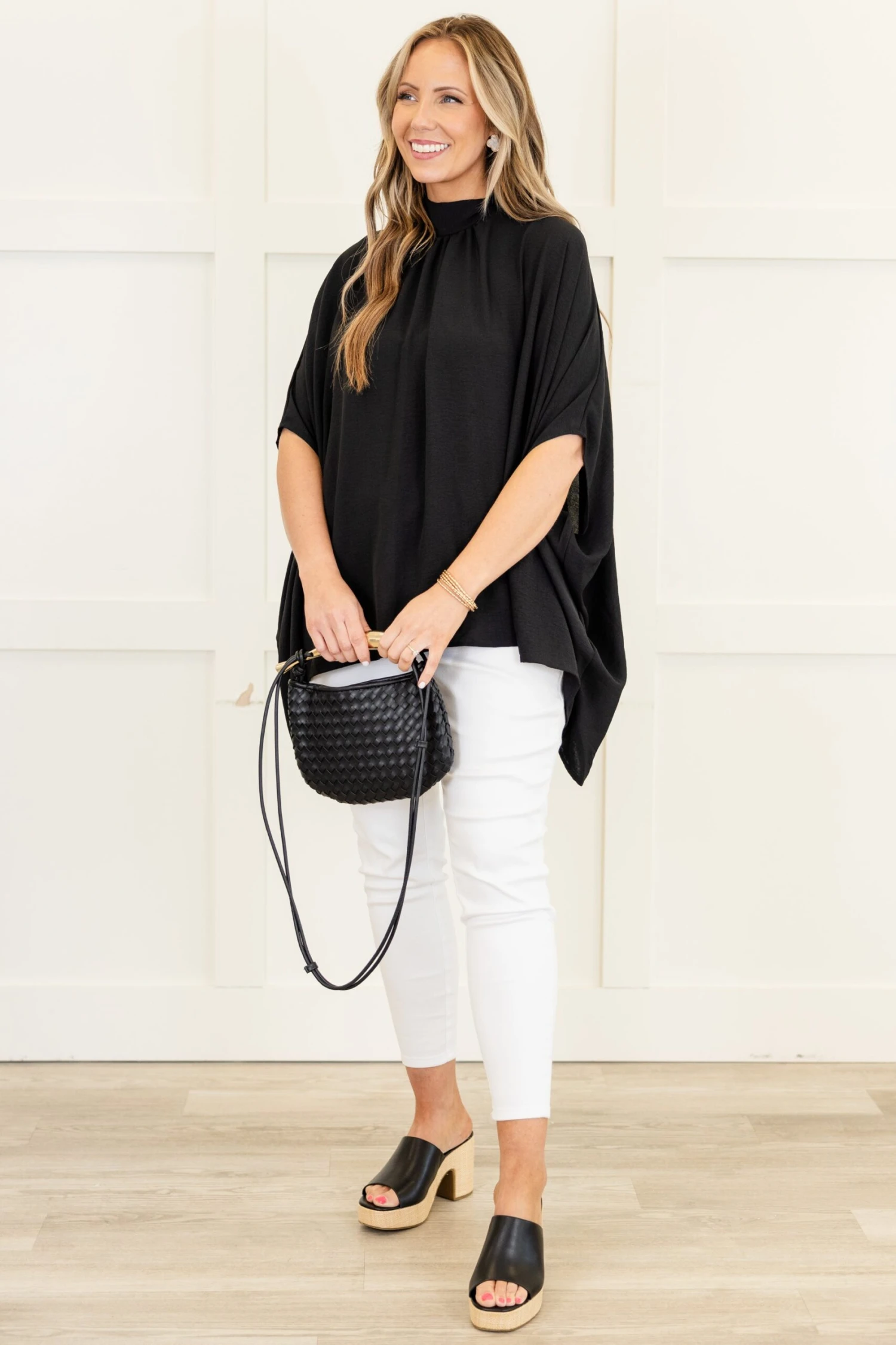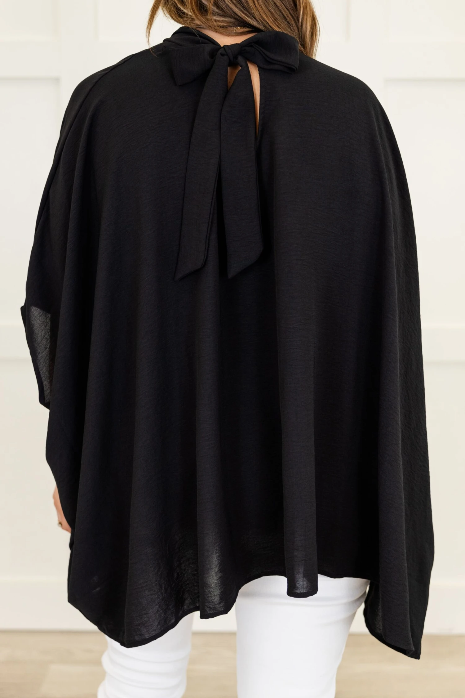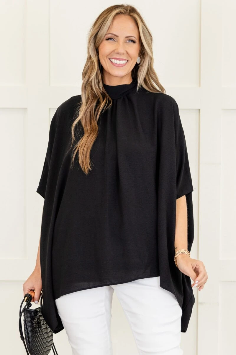 You’ll look and feel good in this gorgeous top! This dazzling top has a black color that is so bold and chic! The high neckline and back tie make this the ultimate must-have! Style this gorgeous top with some white denim and sandals for a sassy chic look!