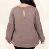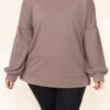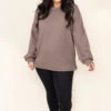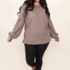 We absolutely love this sweater! It has a solid mocha color and a cool banded hem. This sweater is comfortable for all day wear and is perfect for the season! Pair this with leggings and boots for a comfy look!