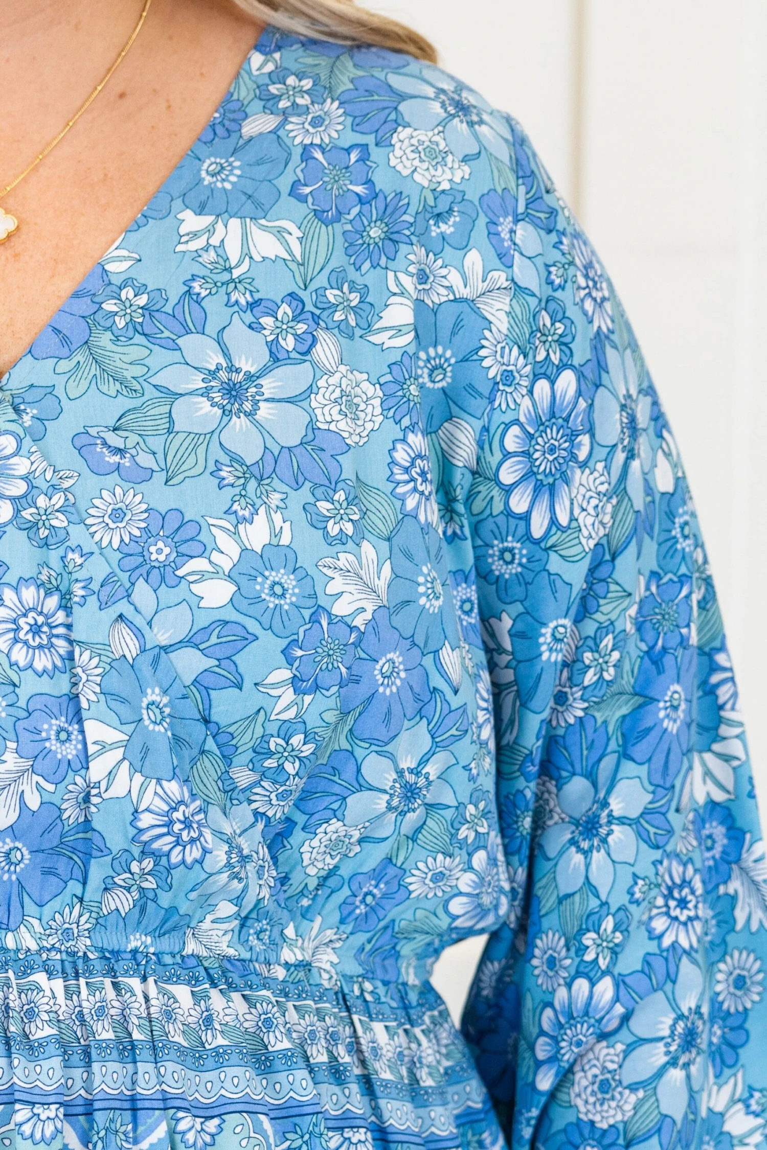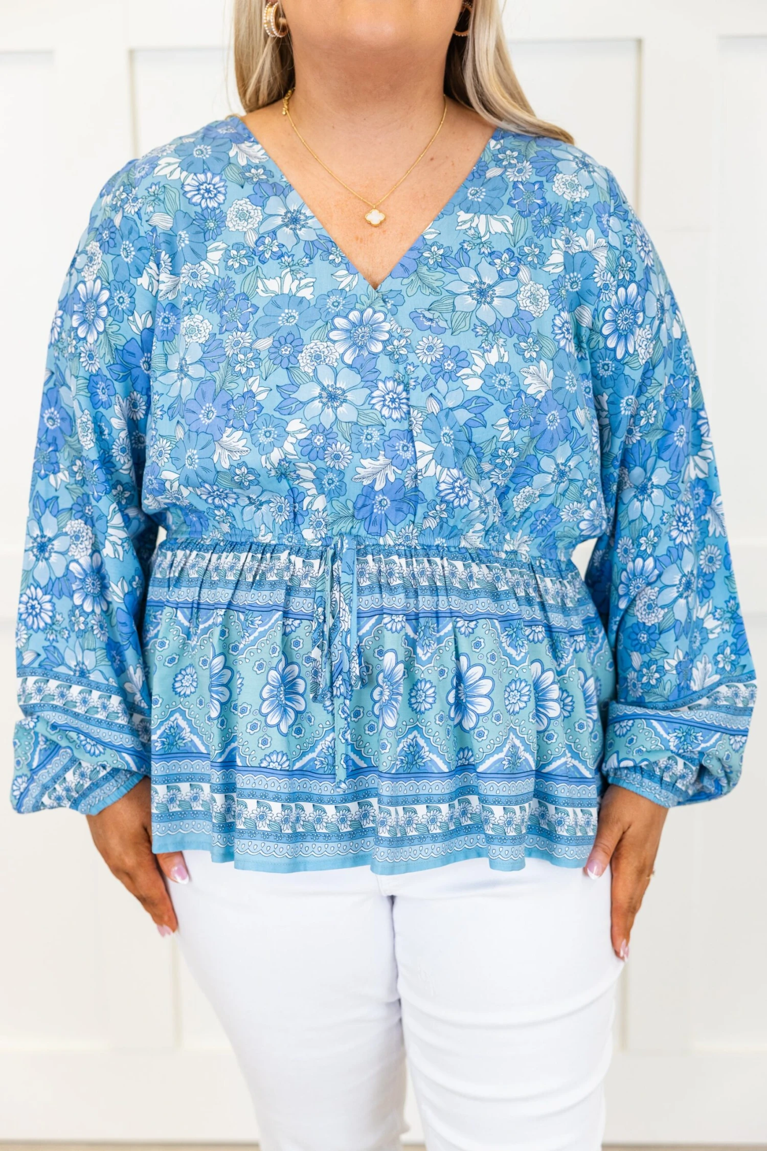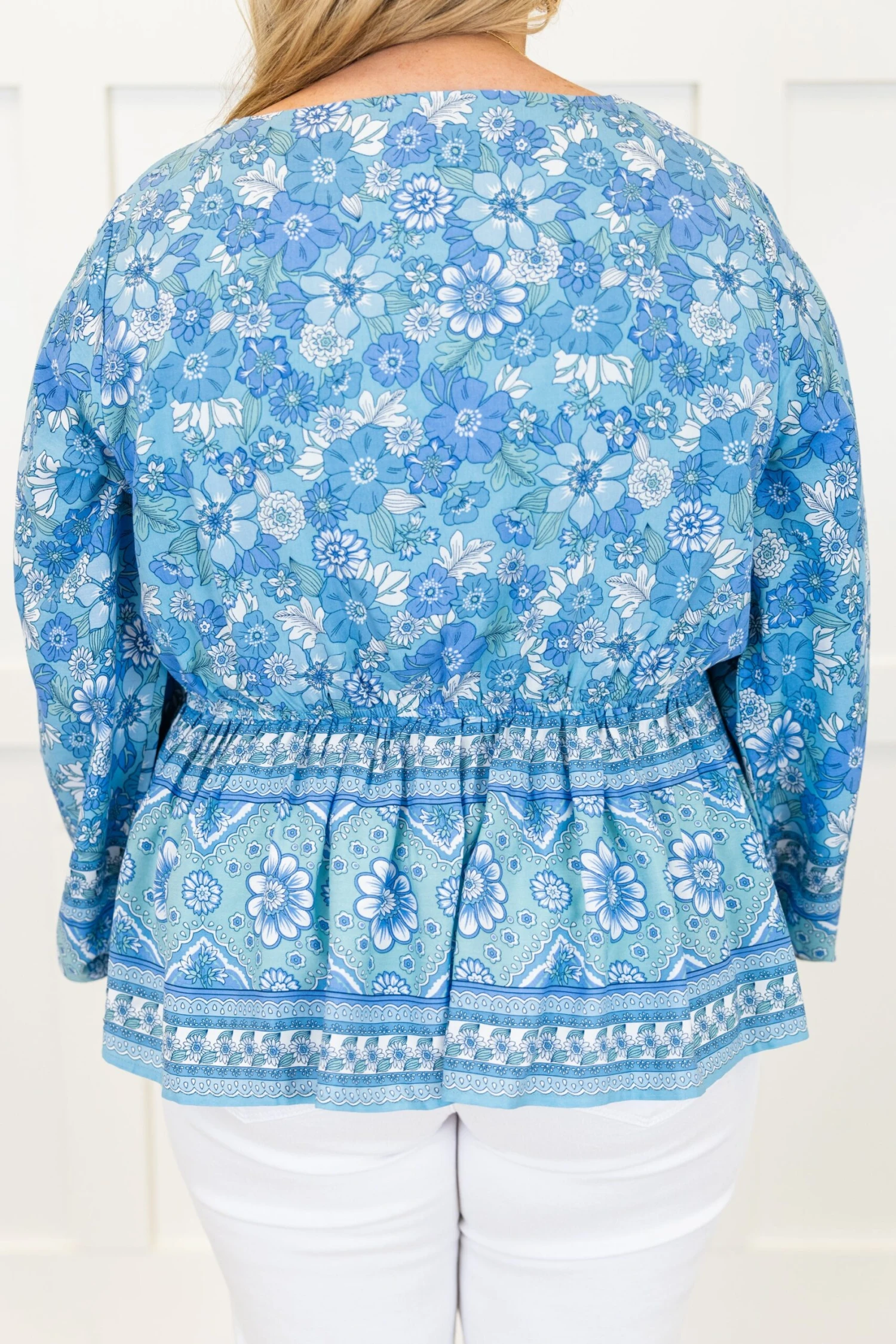 Discover the perfect blend of style and comfort with this top! This stunning blue top features a peplum babydoll silhouette and elastic waist for a flattering fit! The clasp button on the bust adds a touch of sophistication, while the beautiful floral print adds a pop of color! Elevate your wardrobe today!
