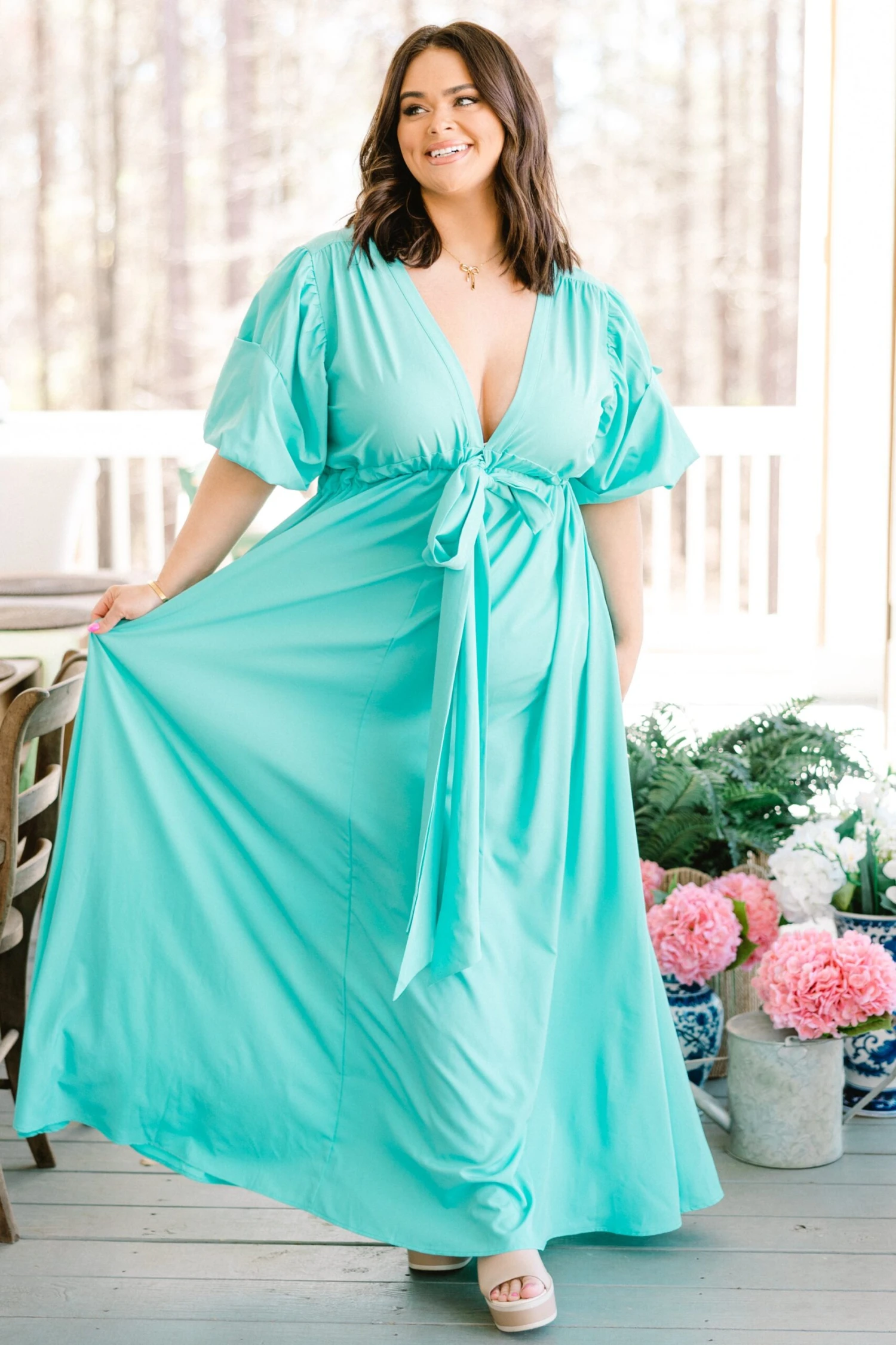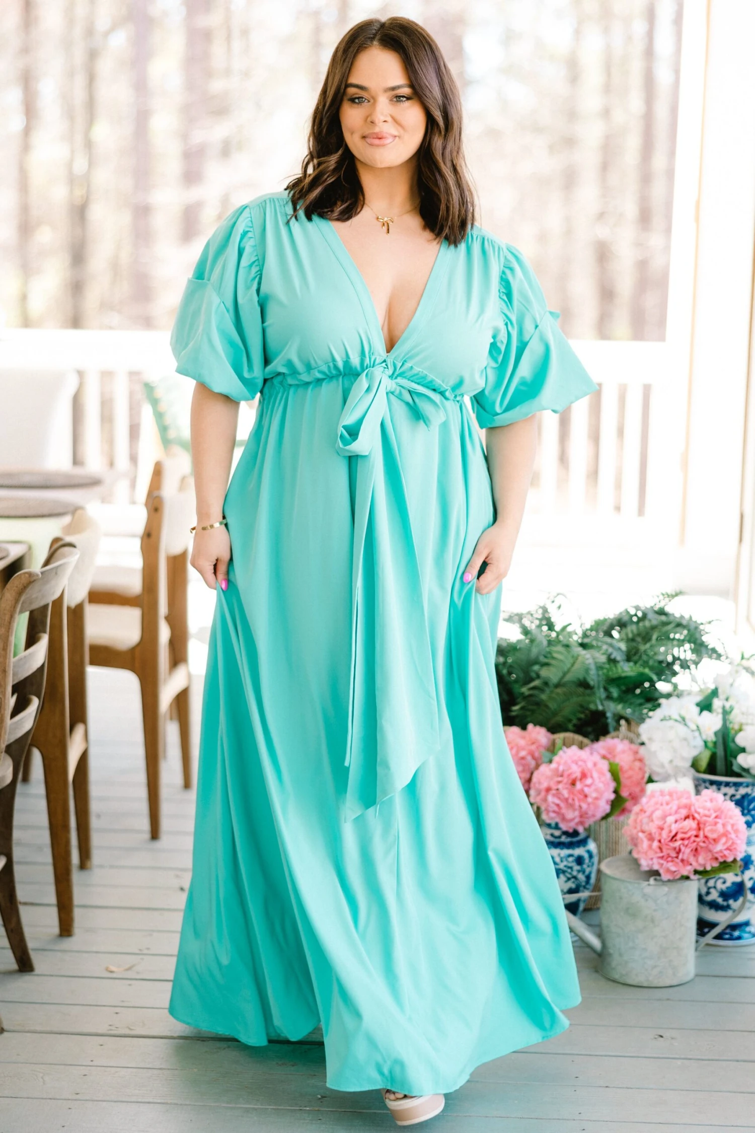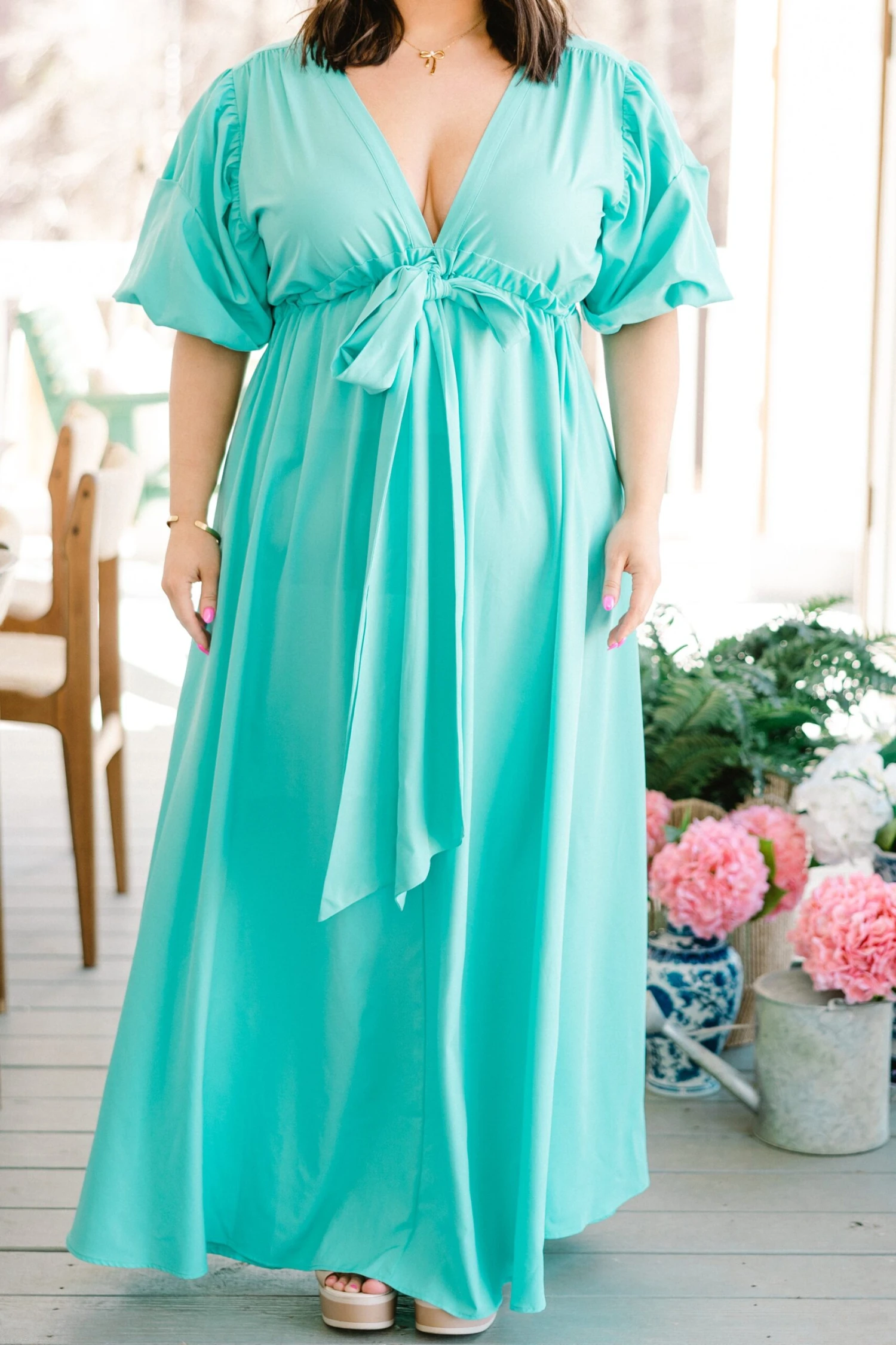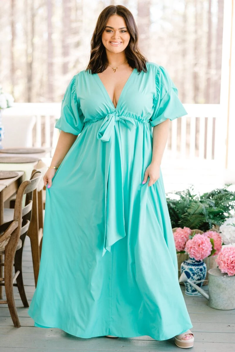Everyone will be looking at how beautiful you are in this gorgeous maxi dress! This bold seafoam dress features a flirty neckline with a front tie that makes it perfect for that special date night or party! Designed with a flattering fit, this dress is sure to turn heads!Â