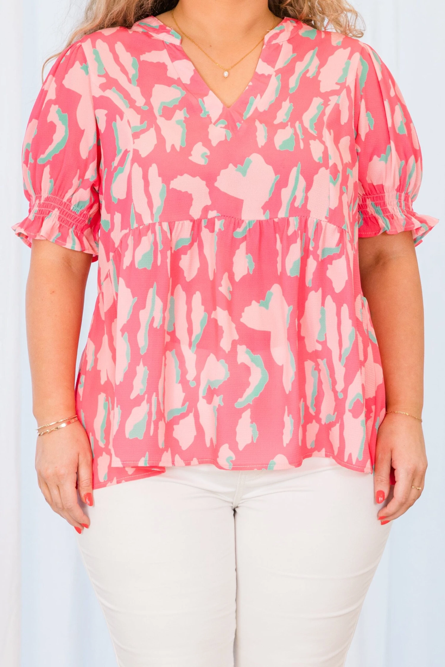 If you are looking for your new favorite top, look no further! It’s available in a beautiful flamingo color that will make you stand out! The babydoll design flatters all body types, while the leopard pattern adds a touch of wild! Complete the look with playful bubble sleeves!