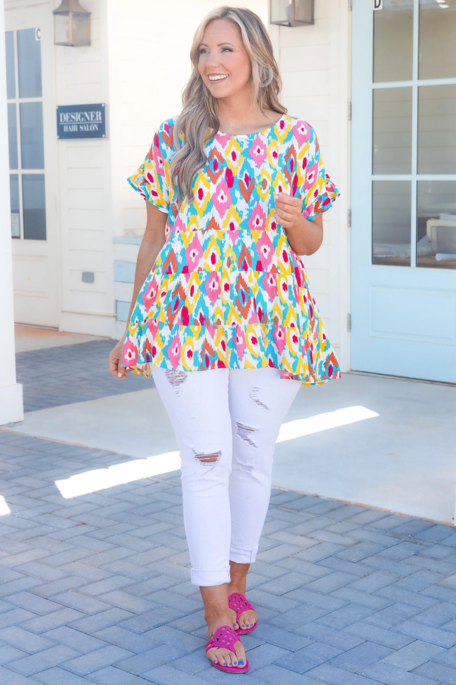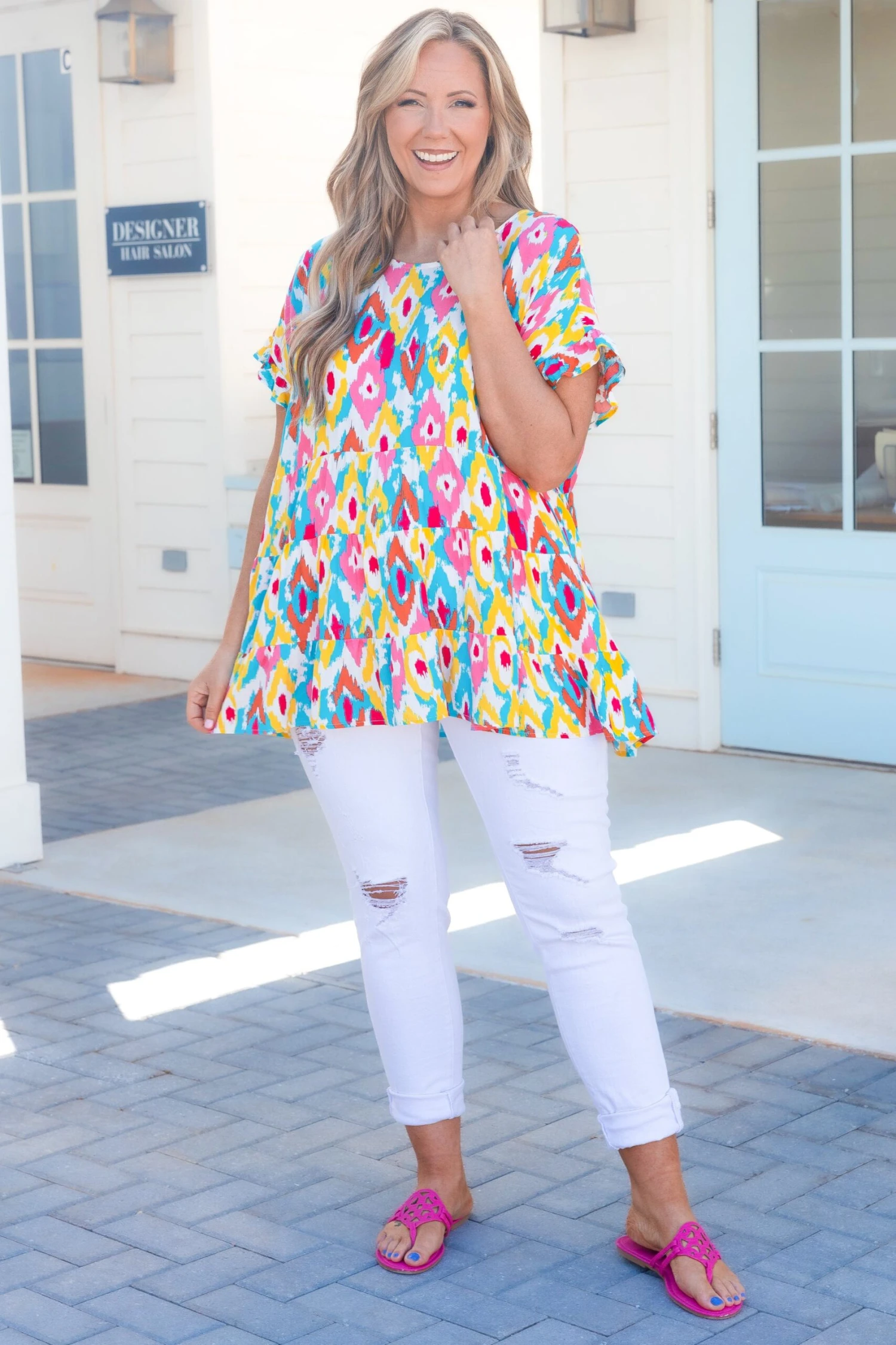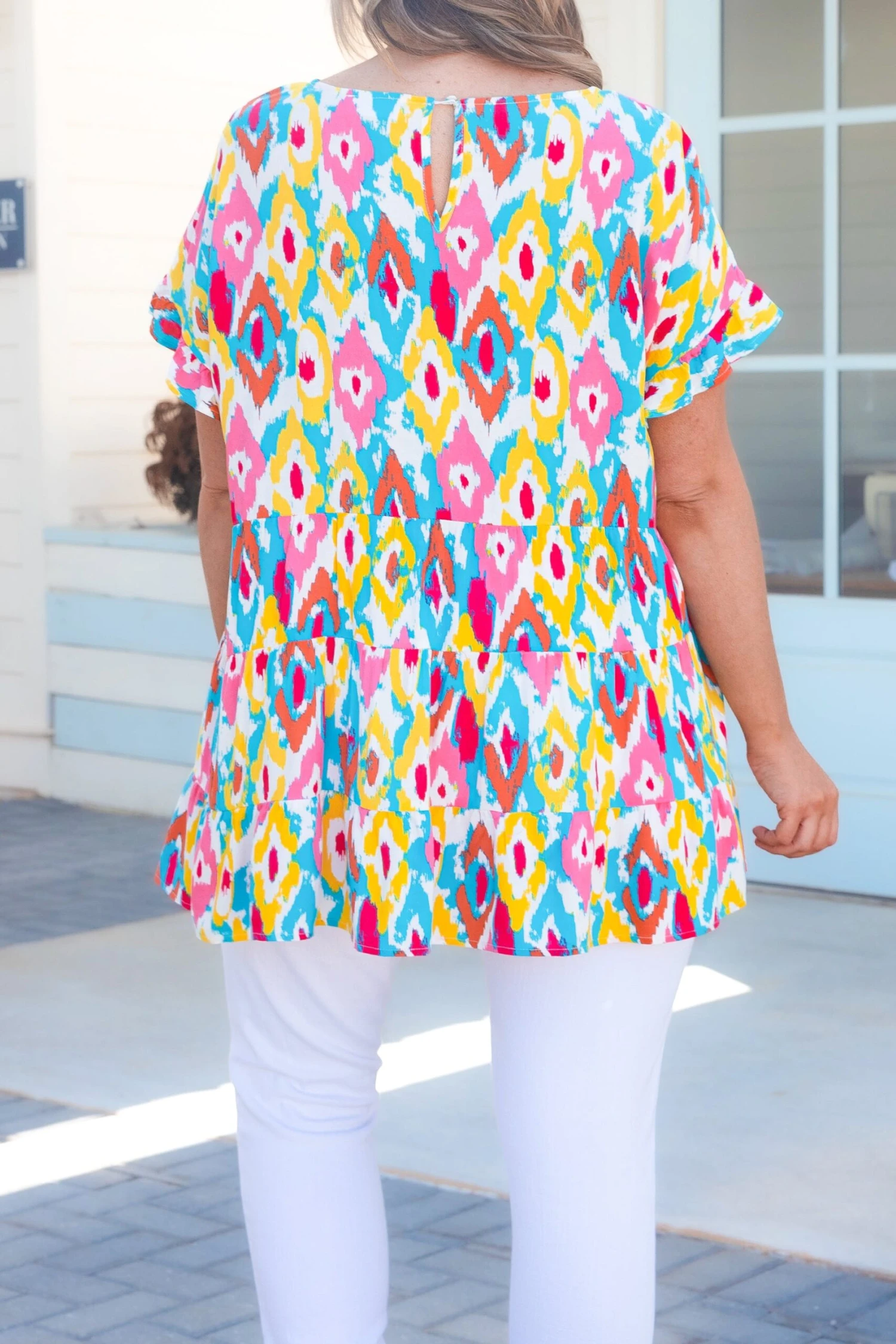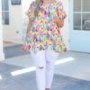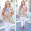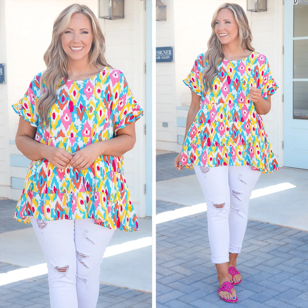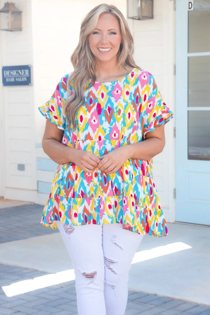 This top is absolutely breathtaking! Featuring a figure flattering fit and babydoll design, this ivory-teal top is a must-have for any wardrobe! Its elegant flowy silhouette is sure to make a statement!