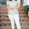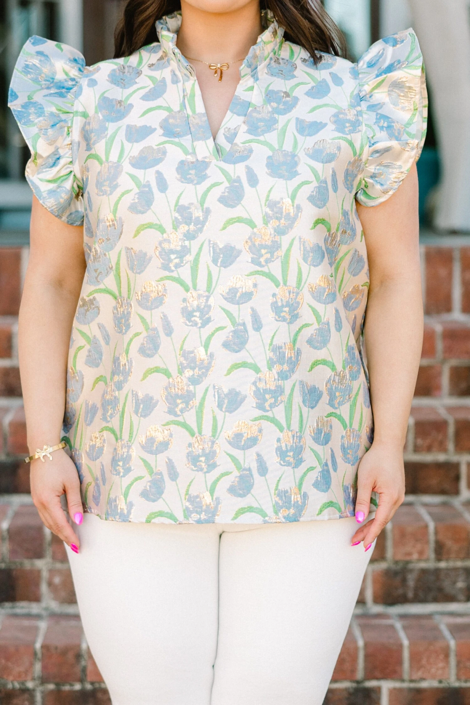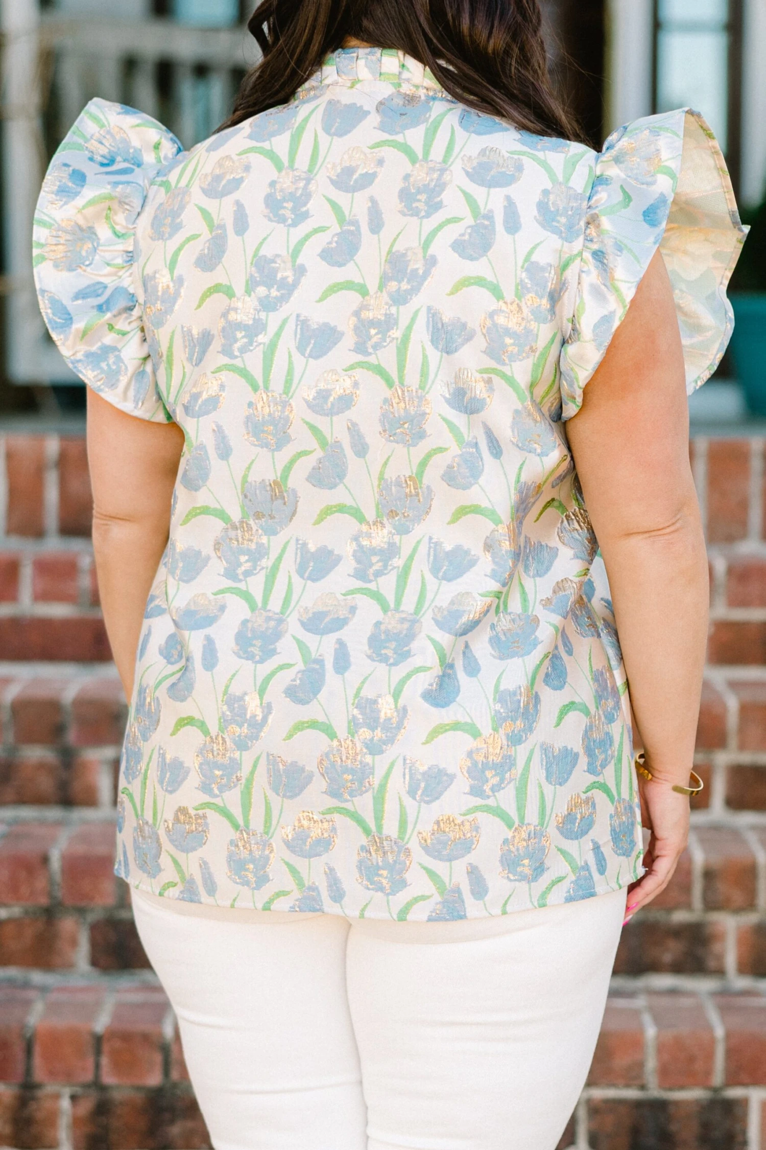 Indulge in luxury with our Lost The Chance Top! Crafted from jacquard fabric, this exquisite blue top features a delicate metallic floral print! The split v-neck adds a touch of sophistication, while the ruffle sleeves add a hint of femininity! Elevate your wardrobe with this elegant and exclusive piece!