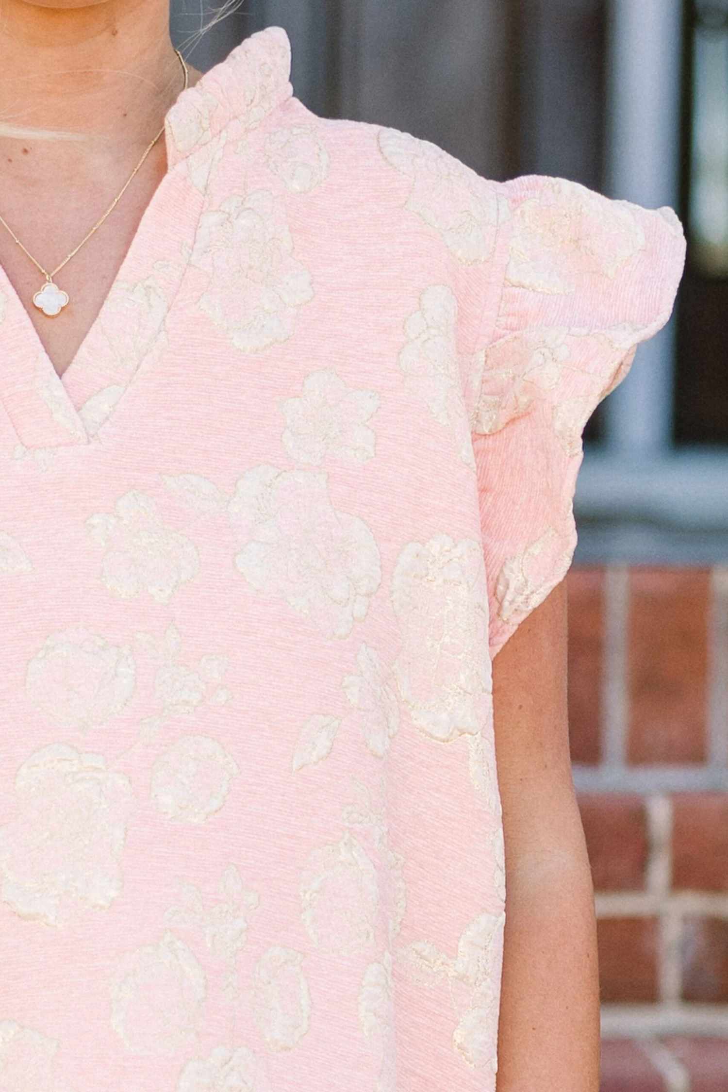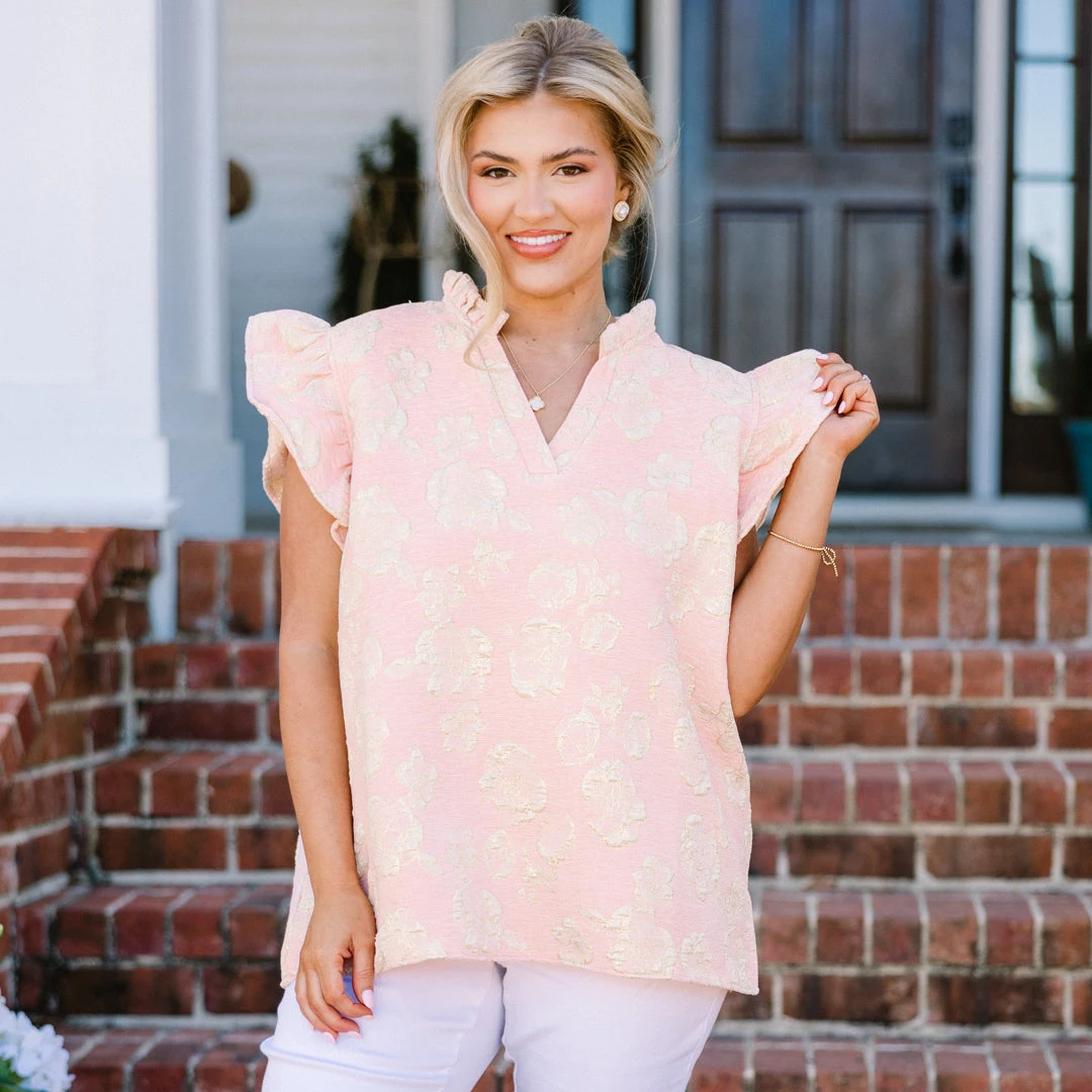 Indulge in luxury with our Lost The Chance Top! Crafted from jacquard fabric, this exquisite pink top features a delicate metallic floral print! The split v-neck adds a touch of sophistication, while the ruffle sleeves add a hint of femininity! Elevate your wardrobe with this elegant and exclusive piece!