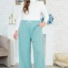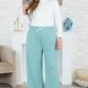 Stay cozy and stylish with these pants in blue grey! These sweatpants feature a white drawstring, side pockets, and a wide leg flow for ultimate comfort! The stitched hem adds a touch of elegance to these laid-back pants! Perfect for a relaxing day in or a casual outing!