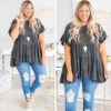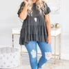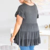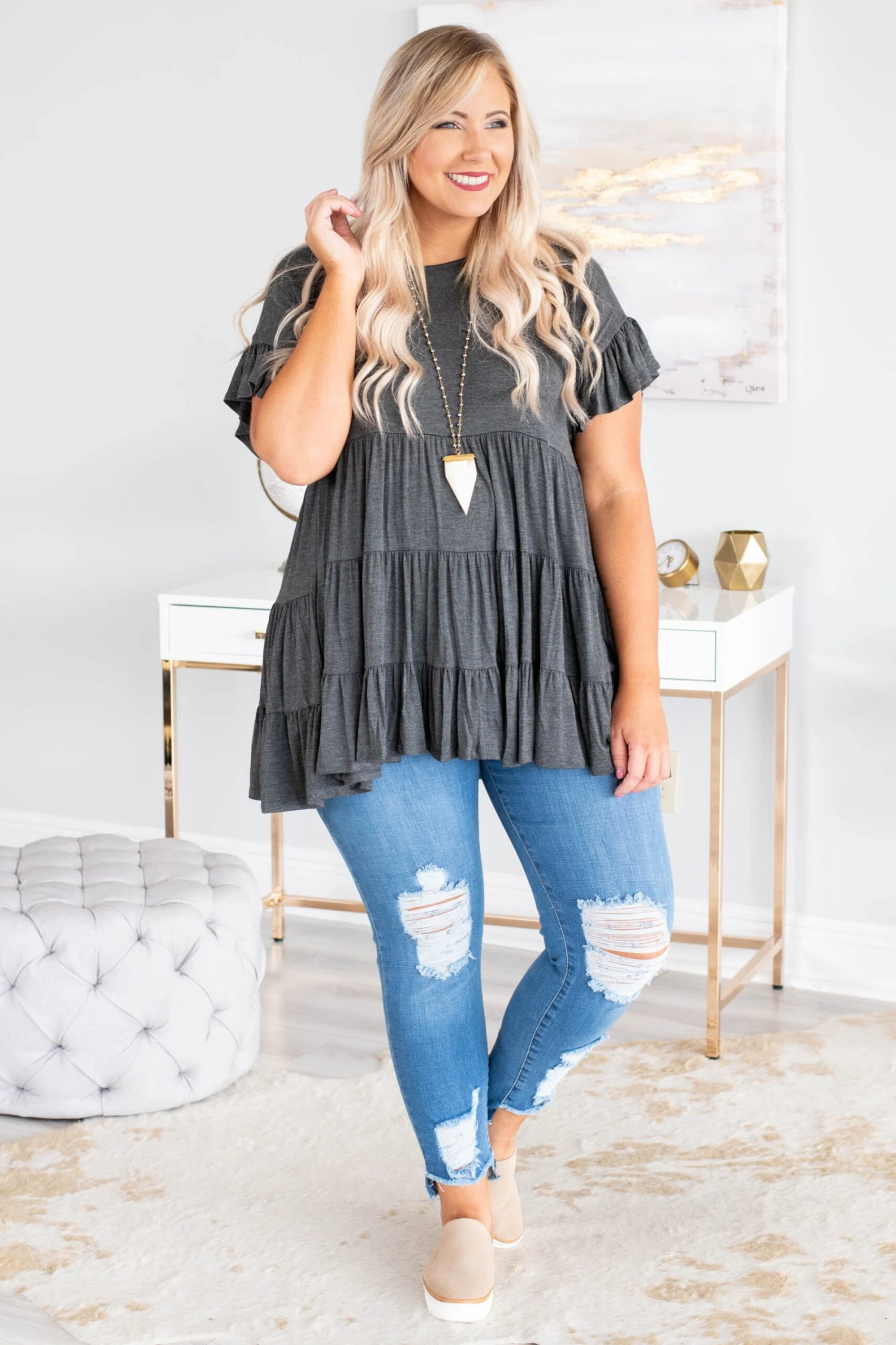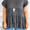 We are madly in love with this top! It has a beautiful flowy fit with a fun and flirty design that’s just too cute! The ruffled layers against the solid charcoal color make for a top that is unlike any other basic piece in your collection! Wear this top with skinnies and booties for an easy everyday look or dress it up with wedges and a statement necklace!Â