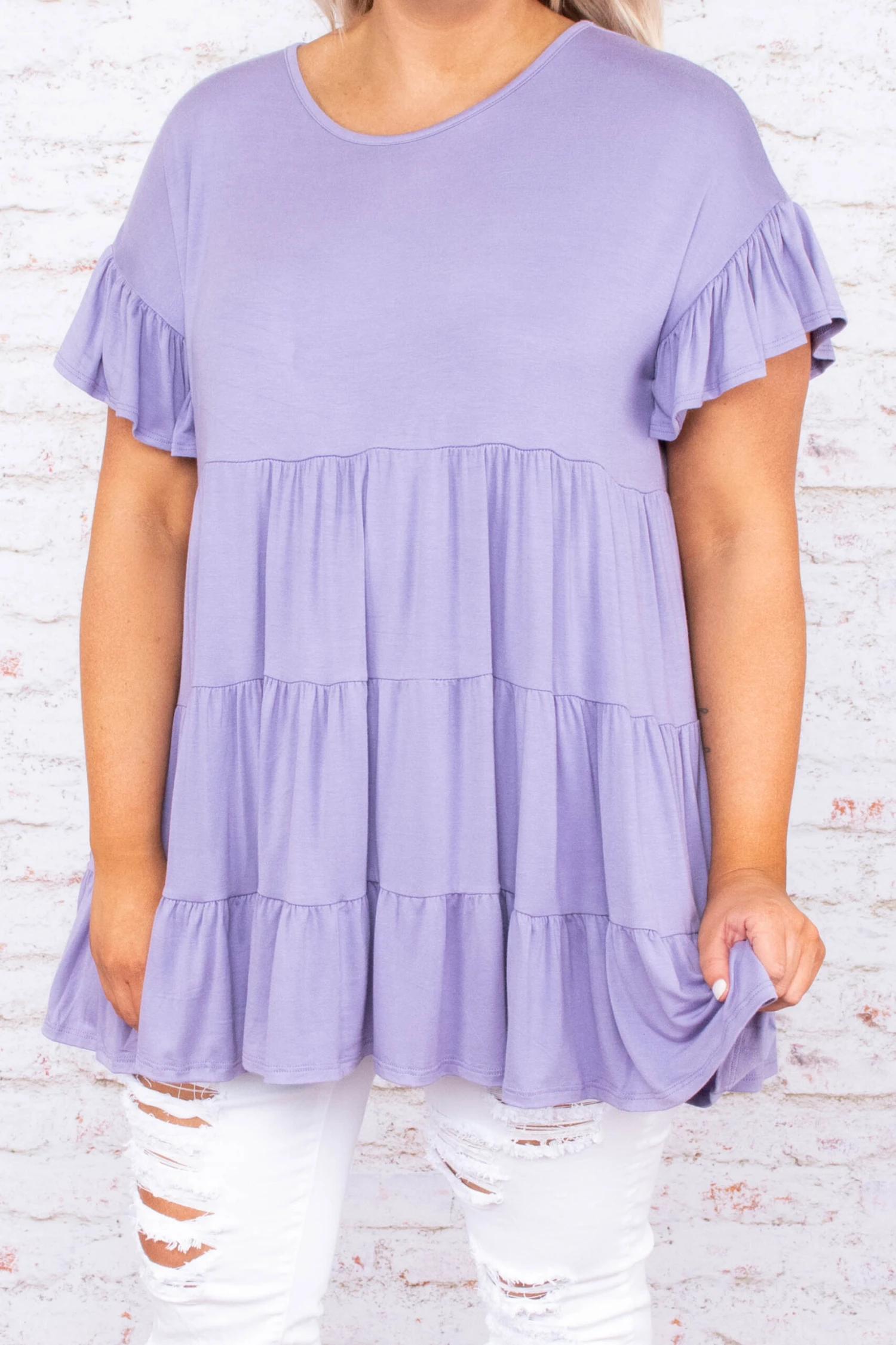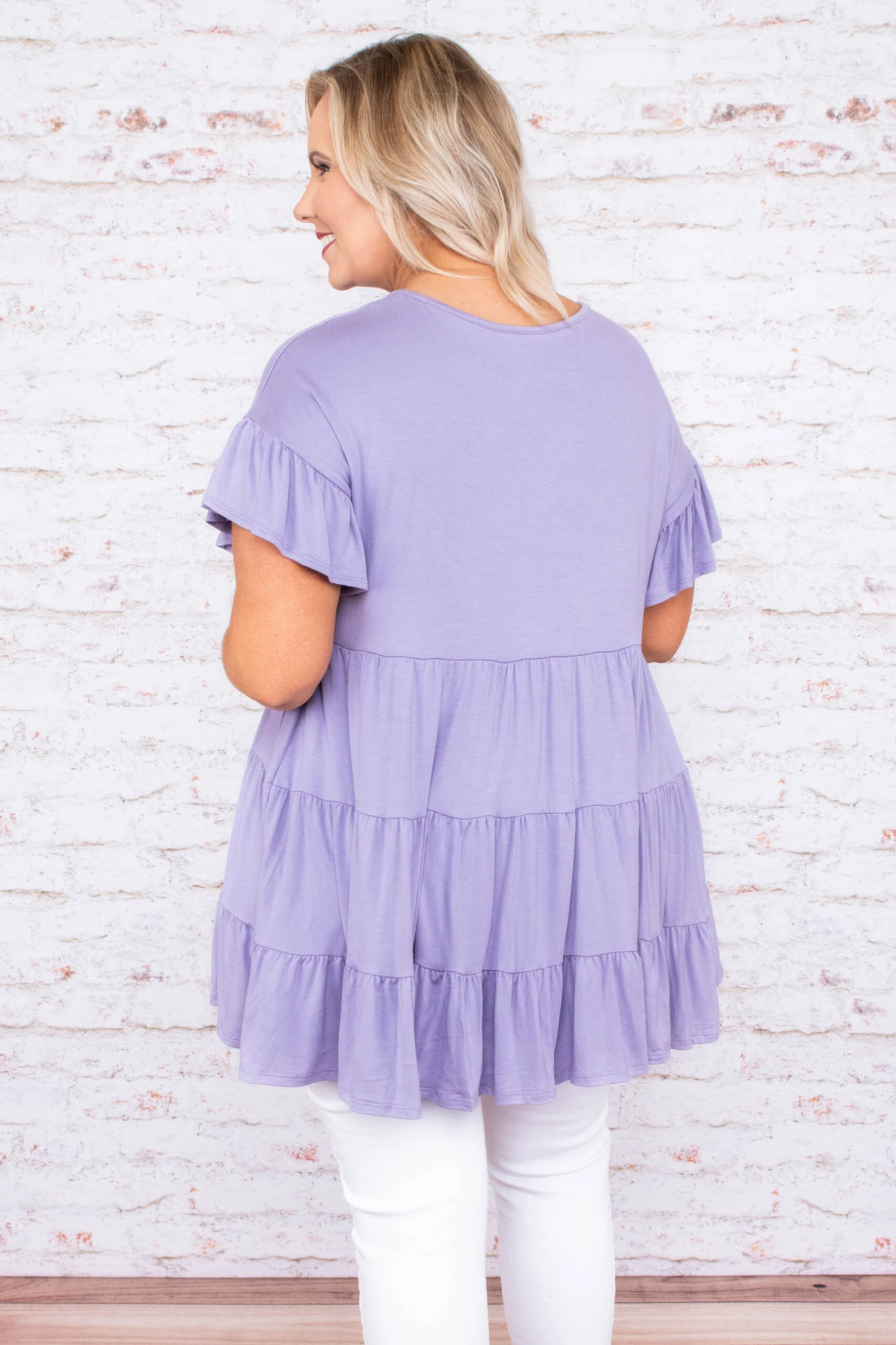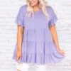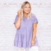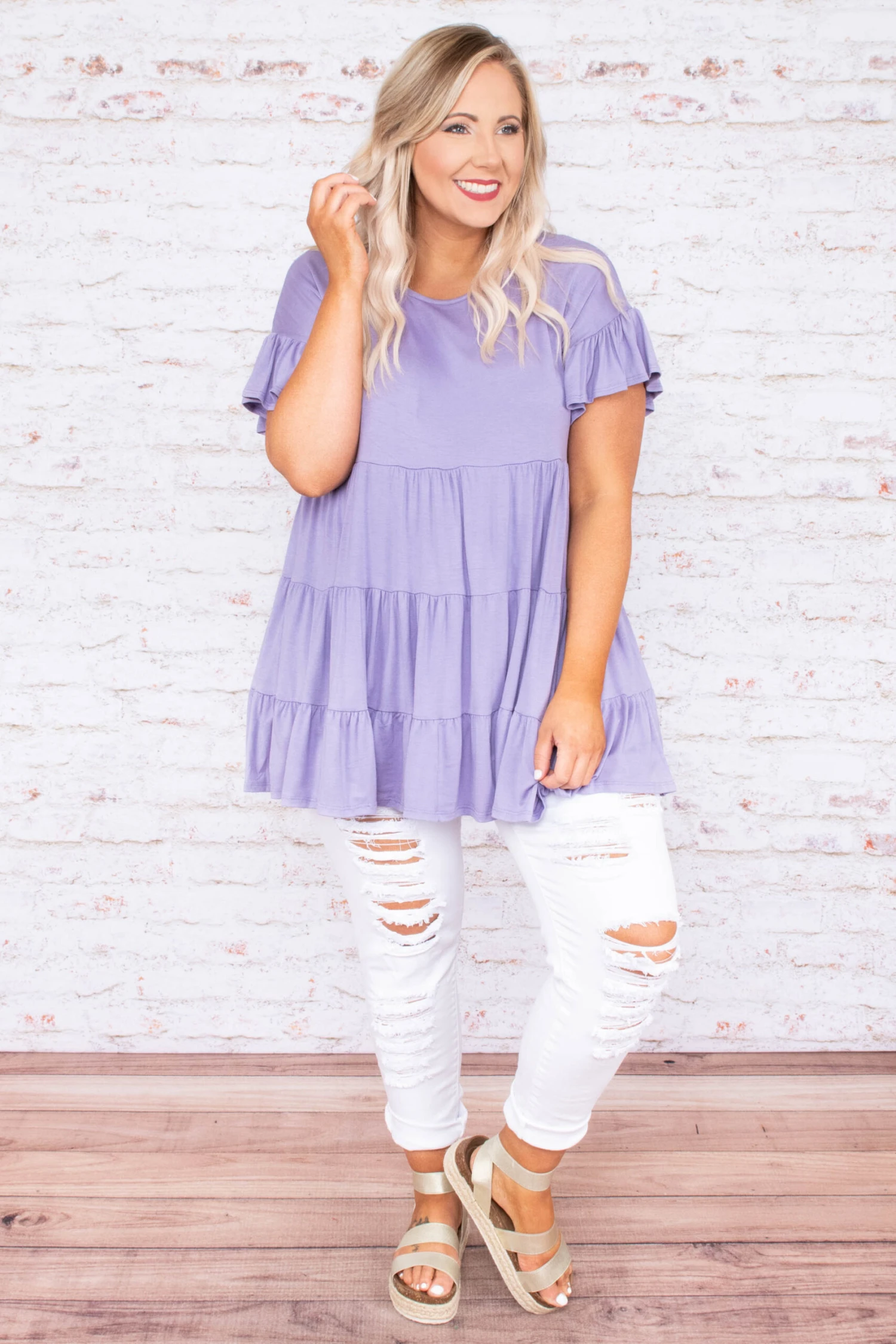 We are madly in love with this top! It has a beautiful flowy fit with a fun and flirty design that’s just too cute! The ruffled layers against the solid lavender color make for a top that is unlike any other basic piece in your collection! Wear this top with skinnies and sandals for an easy everyday look or dress it up with wedges and a statement necklace!Â