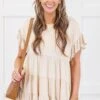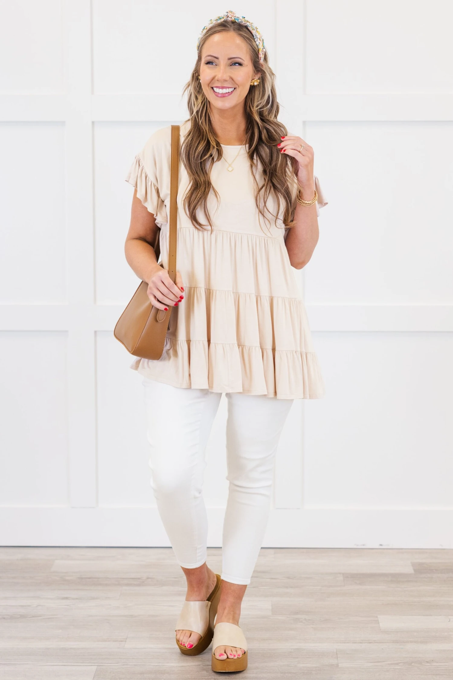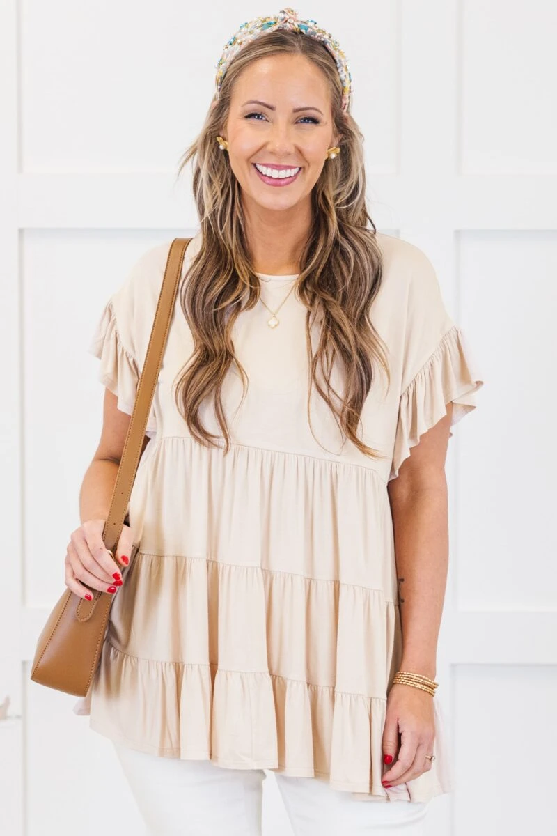 We are madly in love with this top! It has a beautiful flowy fit with a fun and flirty design that’s just too cute! The ruffled layers against the solid taupe color make for a top that is unlike any other basic piece in your collection! Wear this baby doll top with leggings and sneakers for an easy everyday look or dress it up with wedges and a statement necklace!Â