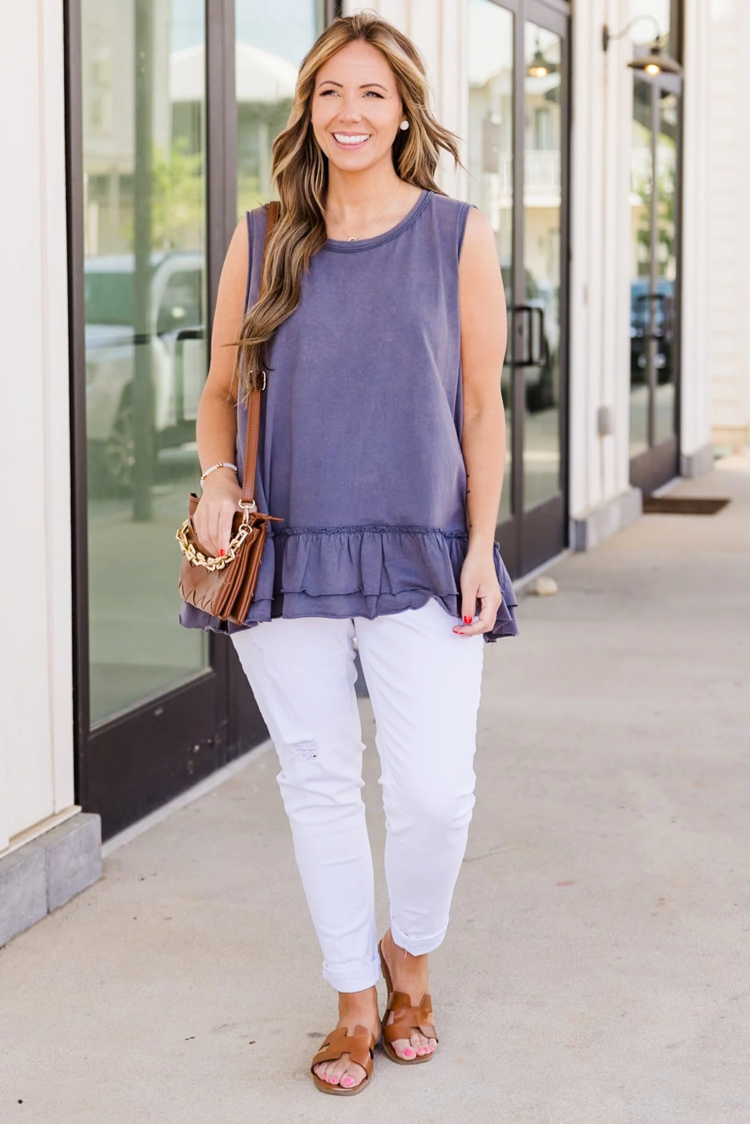 We are SO in love with this top! It features delicate ruffle detailing and unfinished hemlines that are so trendy and sweet! The lovely navy color adds a classic touch , while the versatile design pairs perfectly with white denim and your choice of sandals or heels!