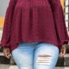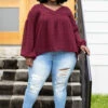 We are absolutely in love with this blouse! This flowy blouse has a chic burgundy color with the prettiest swiss dot fabric for a look you can wear everywhere! It’s soft, sweet, and sheer, featuring an attached lining along the front of the blouse! Not to mention how cute the billow sleeves are for your next event! Simply, style this blouse with skinnies and booties for an effortlessly beautiful outfit!Â