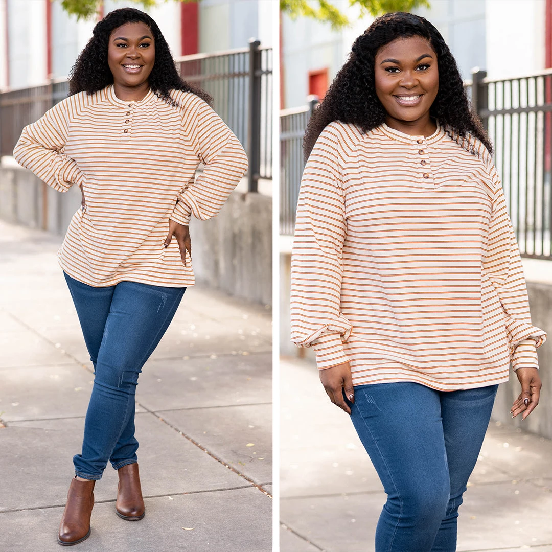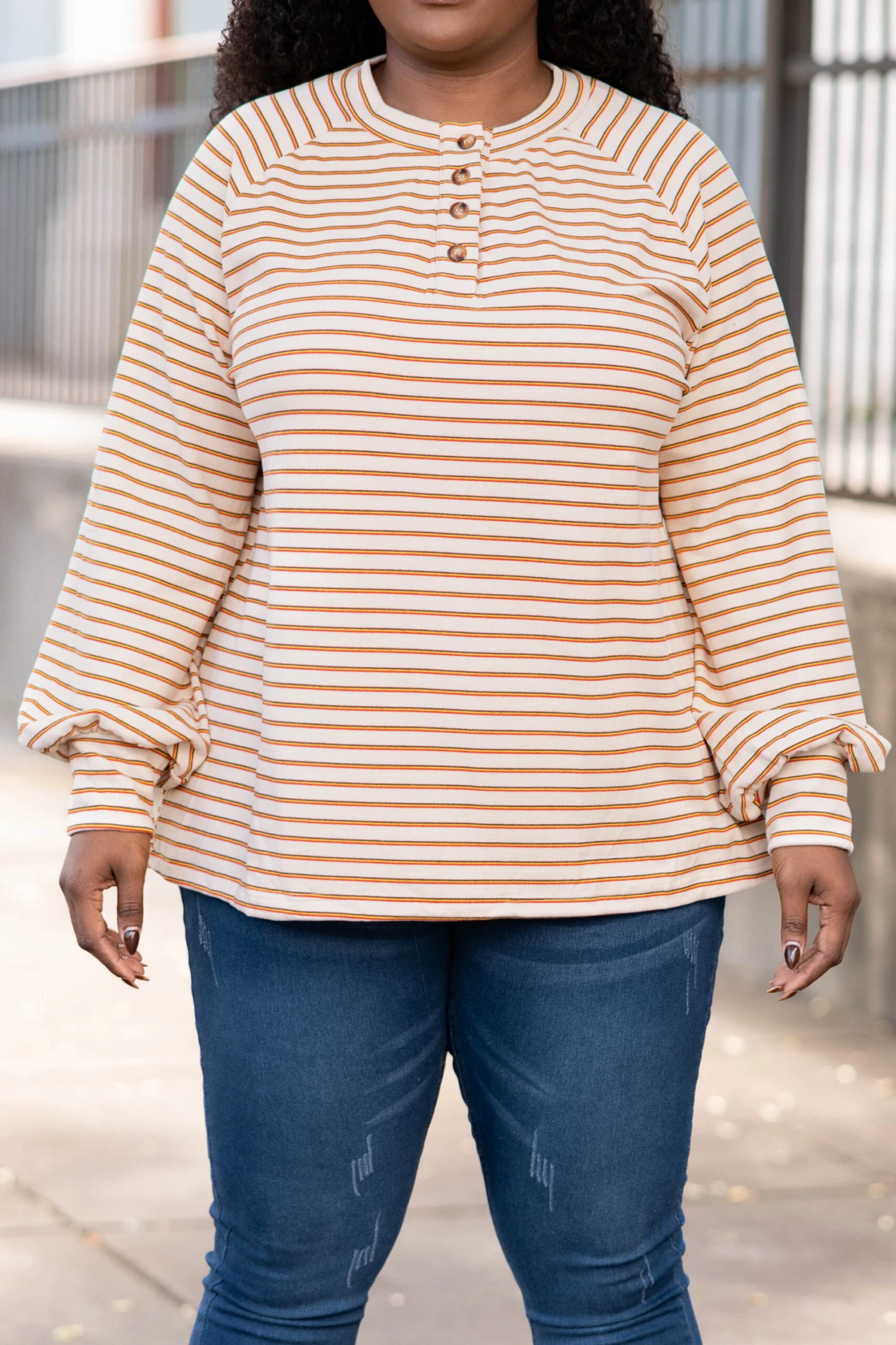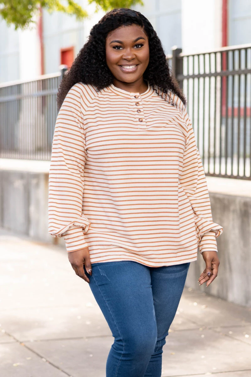 We love this top! It has a soft, oatmeal color with a fun and flirty fit to flatter your figure! It’s comfortable for all-day wear, is easy to style with your favorite shoes and accessories this season! The bubble sleeves and buttons are so sweet! Pair this top with skinnies or leggings for an effortlessly chic look!