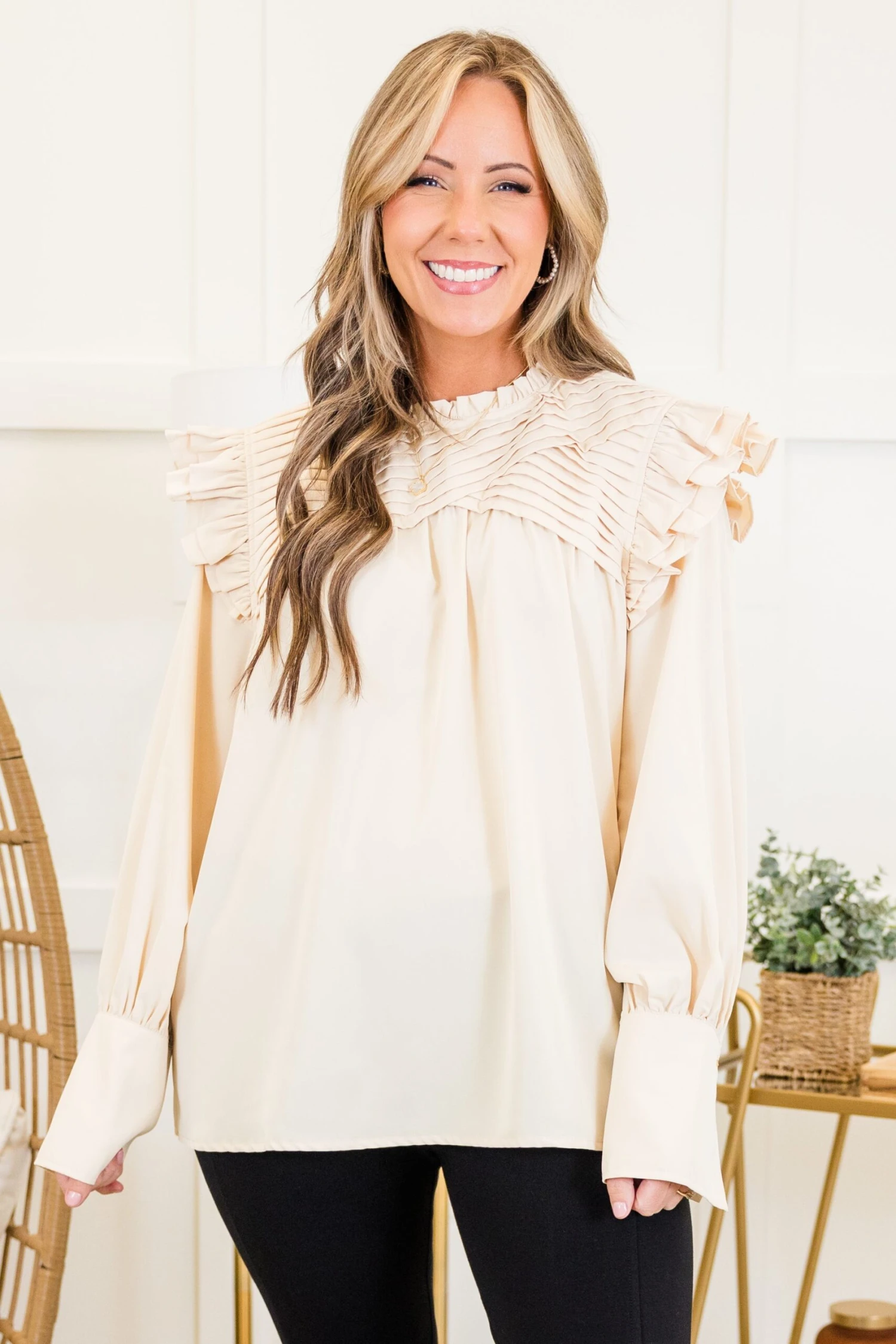 Indulge in the timeless elegance of this top in cream! Featuring delicate ruffled and pin tuck detailing around the neckline and shoulders, this top exudes sophistication! With its round neckline and button keyhole back, it is the perfect blend of luxury and charm!