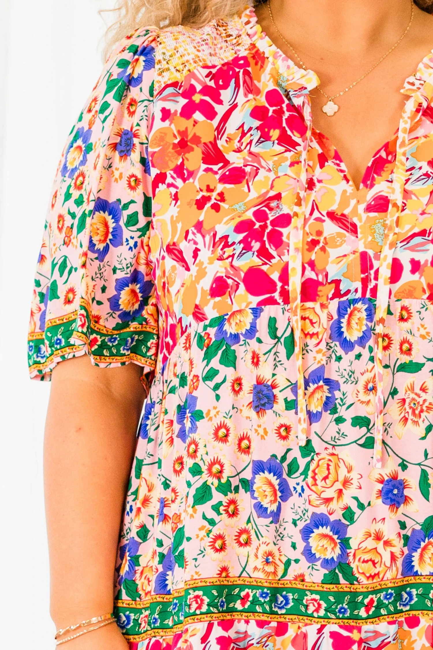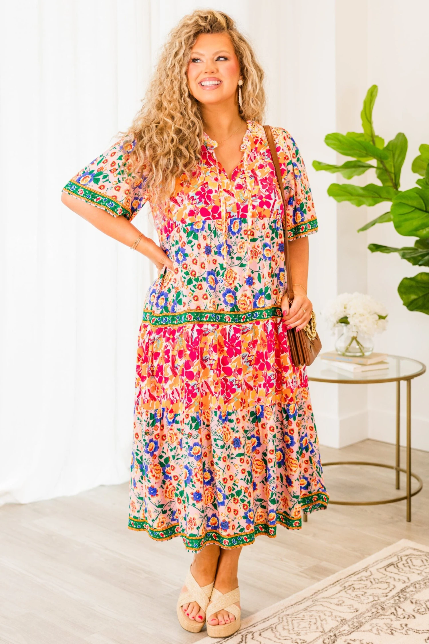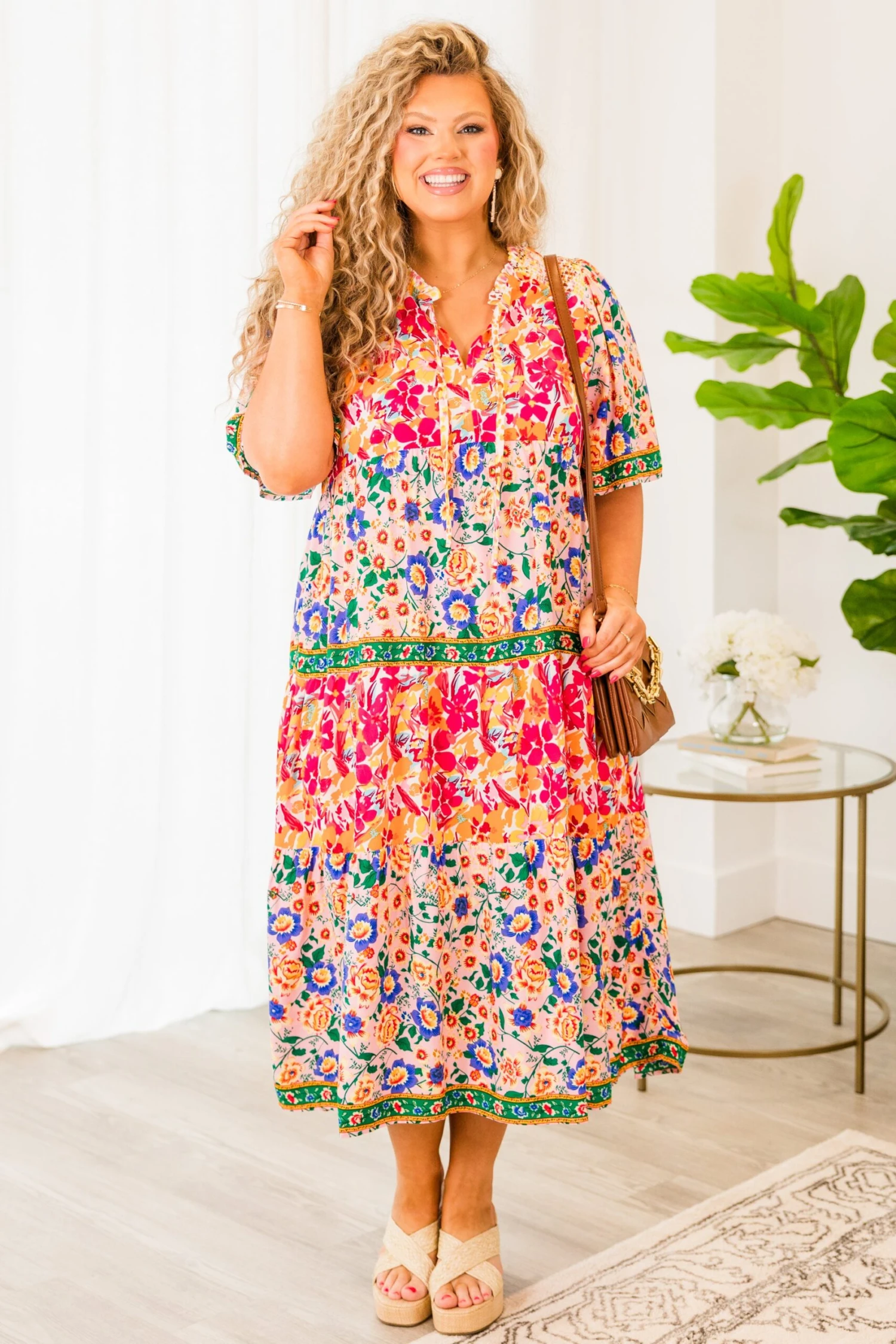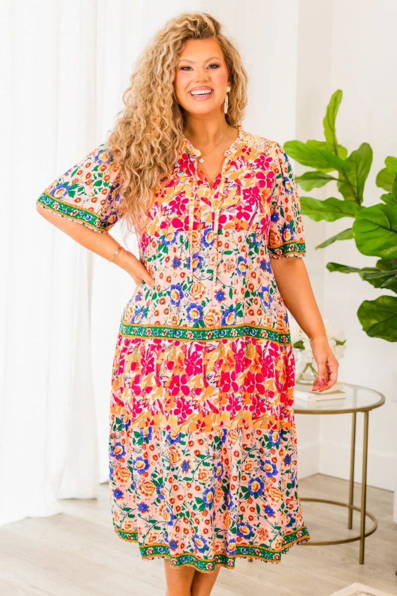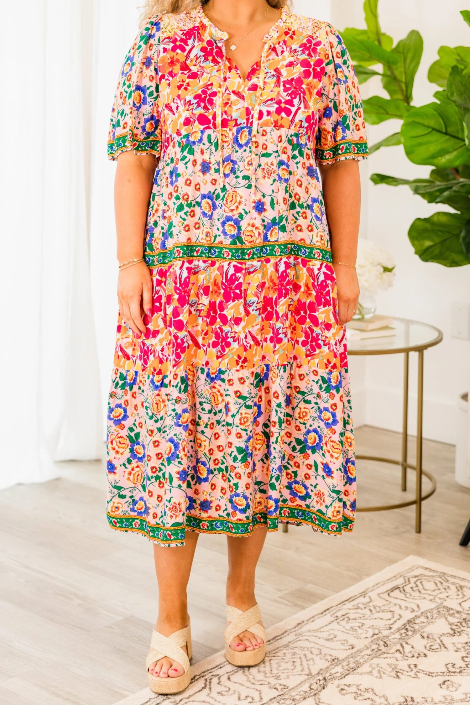 Grab this beauty and don’t let go! This dress in a beautiful pink color features a trendy floral pattern and flows flawlessly to a perfect midi length! Designed to pair effortlessly with cute accessories and wedges, it’s the perfect addition to your wardrobe!