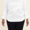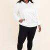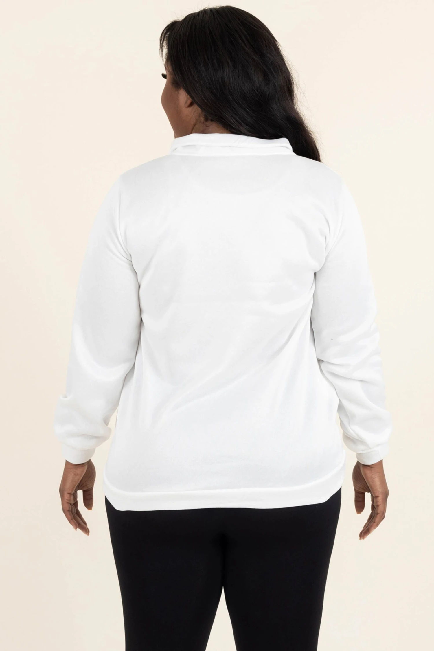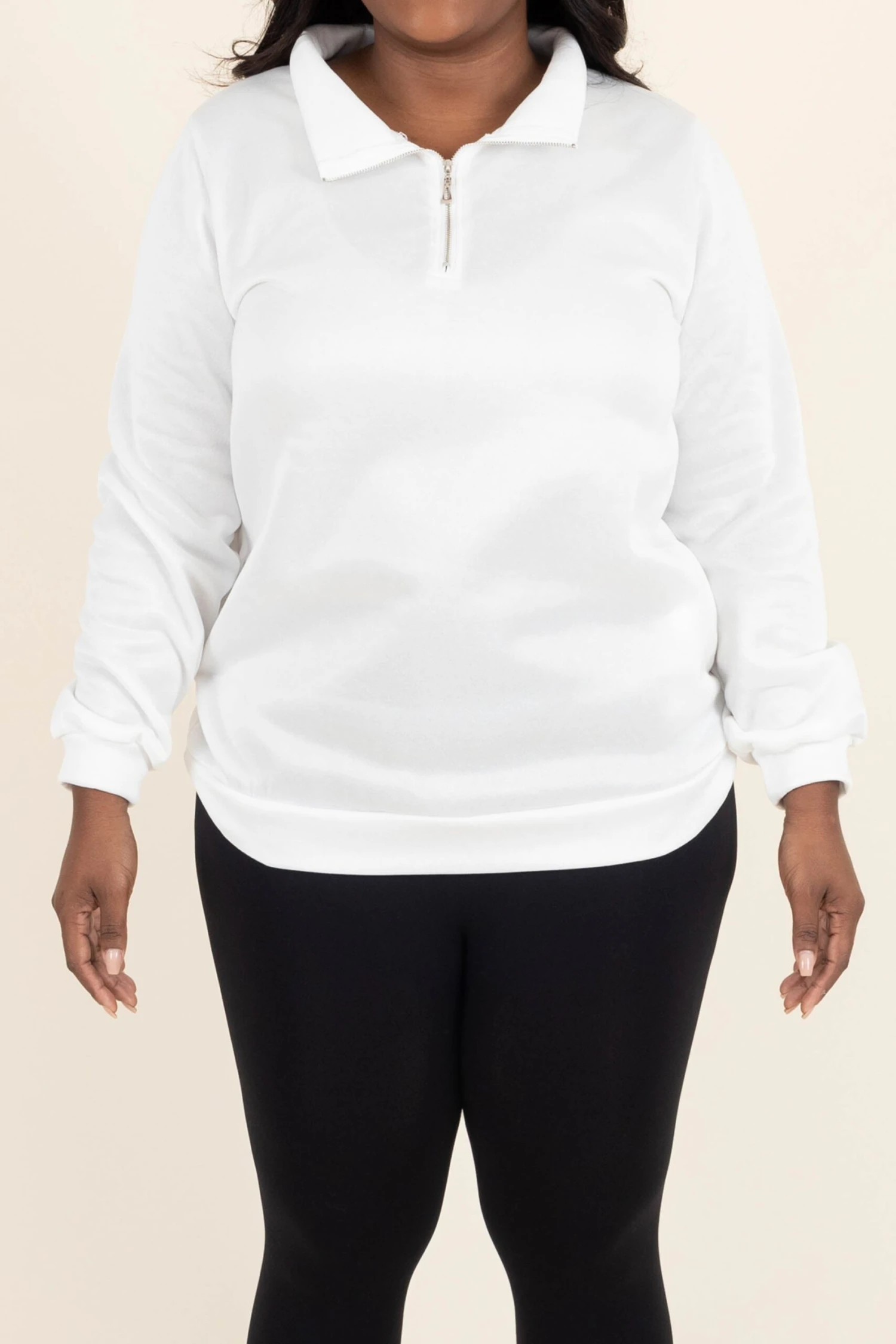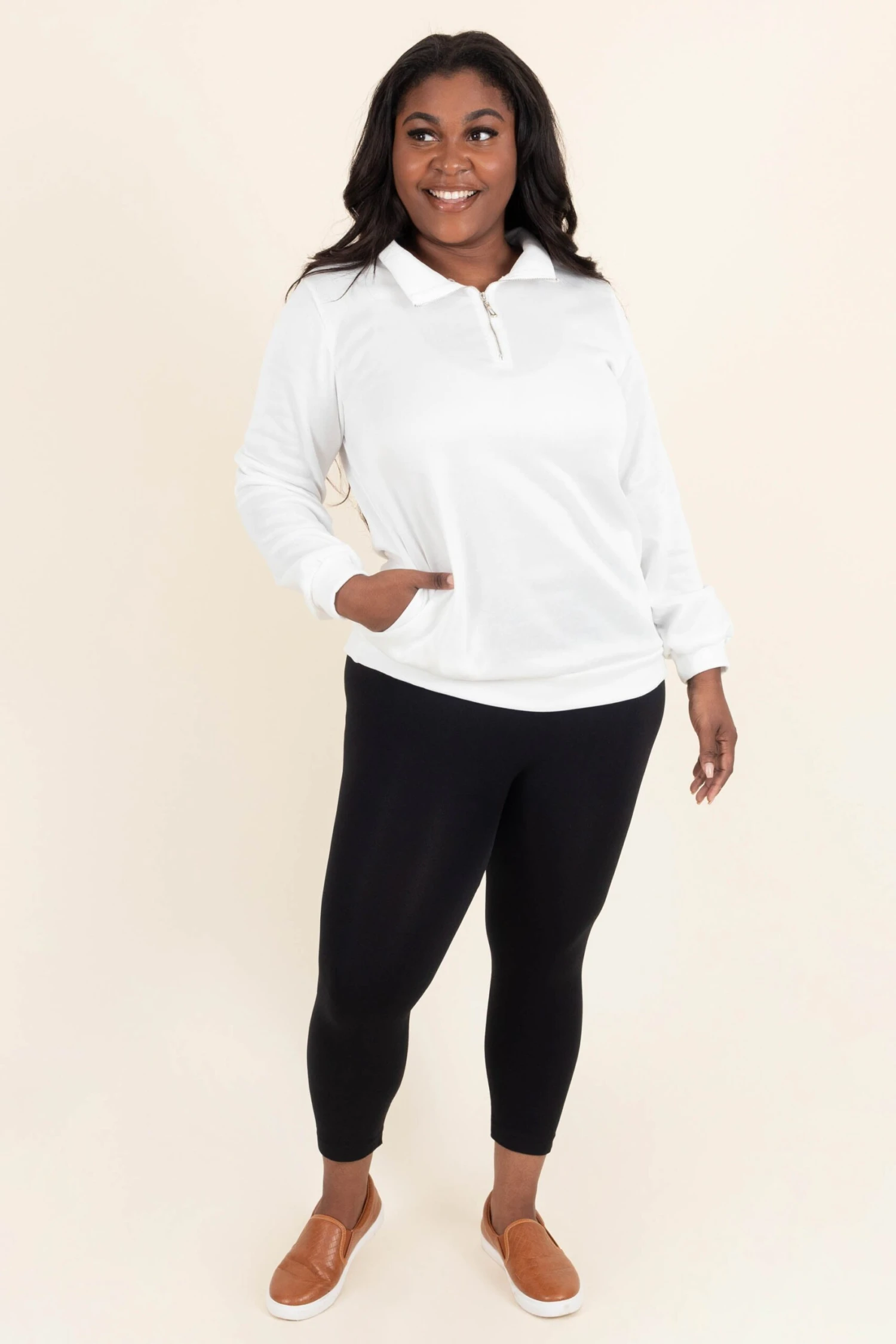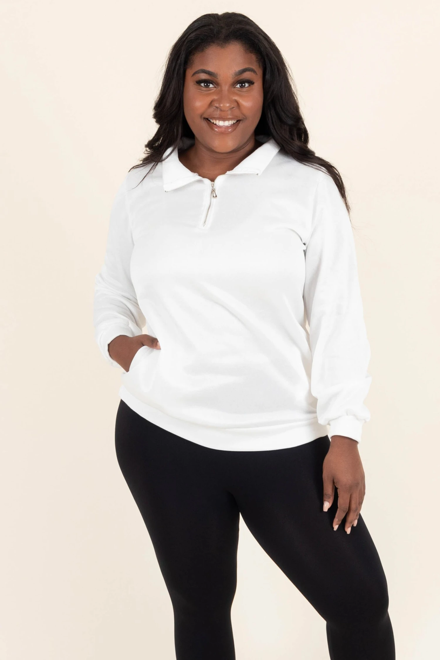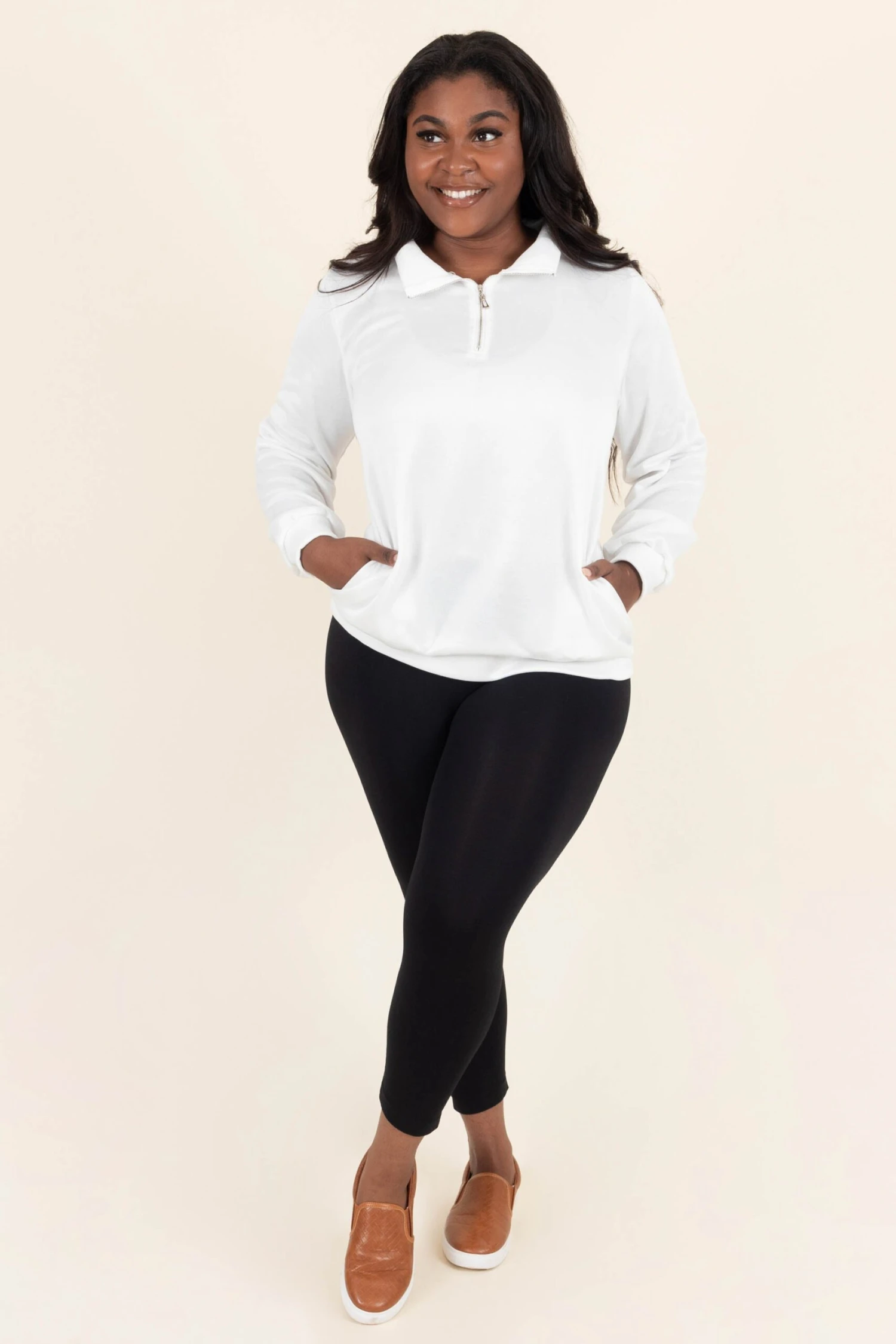 You’ll need this chic pullover when you’re enjoying your leisure time! This gorgeous hoodie has a soft, white color and classic pullover fit with a functional zipper on the front! The figure flattering fit and stretchy material is exactly what you need in this comfy, cozy layering piece!