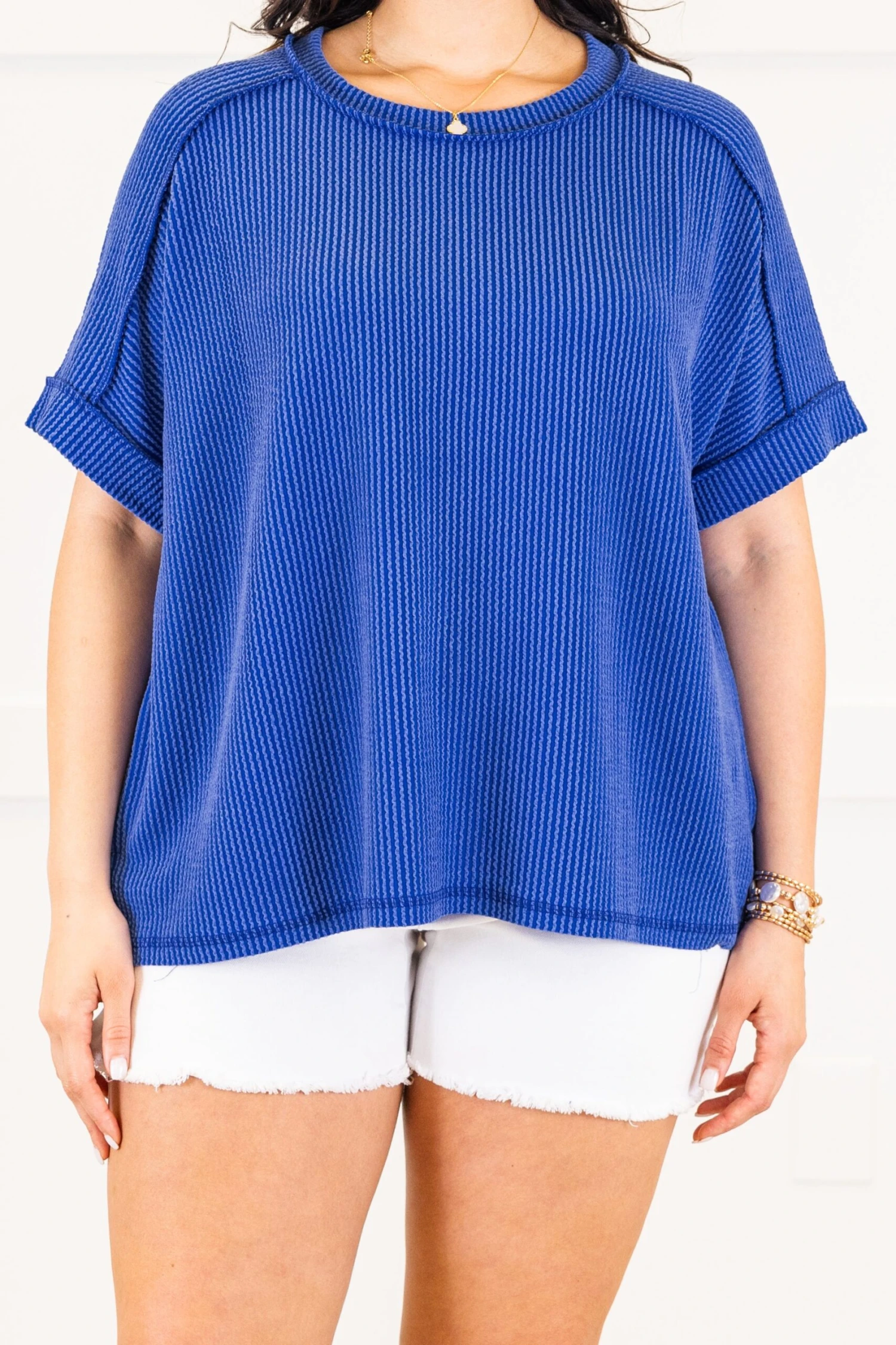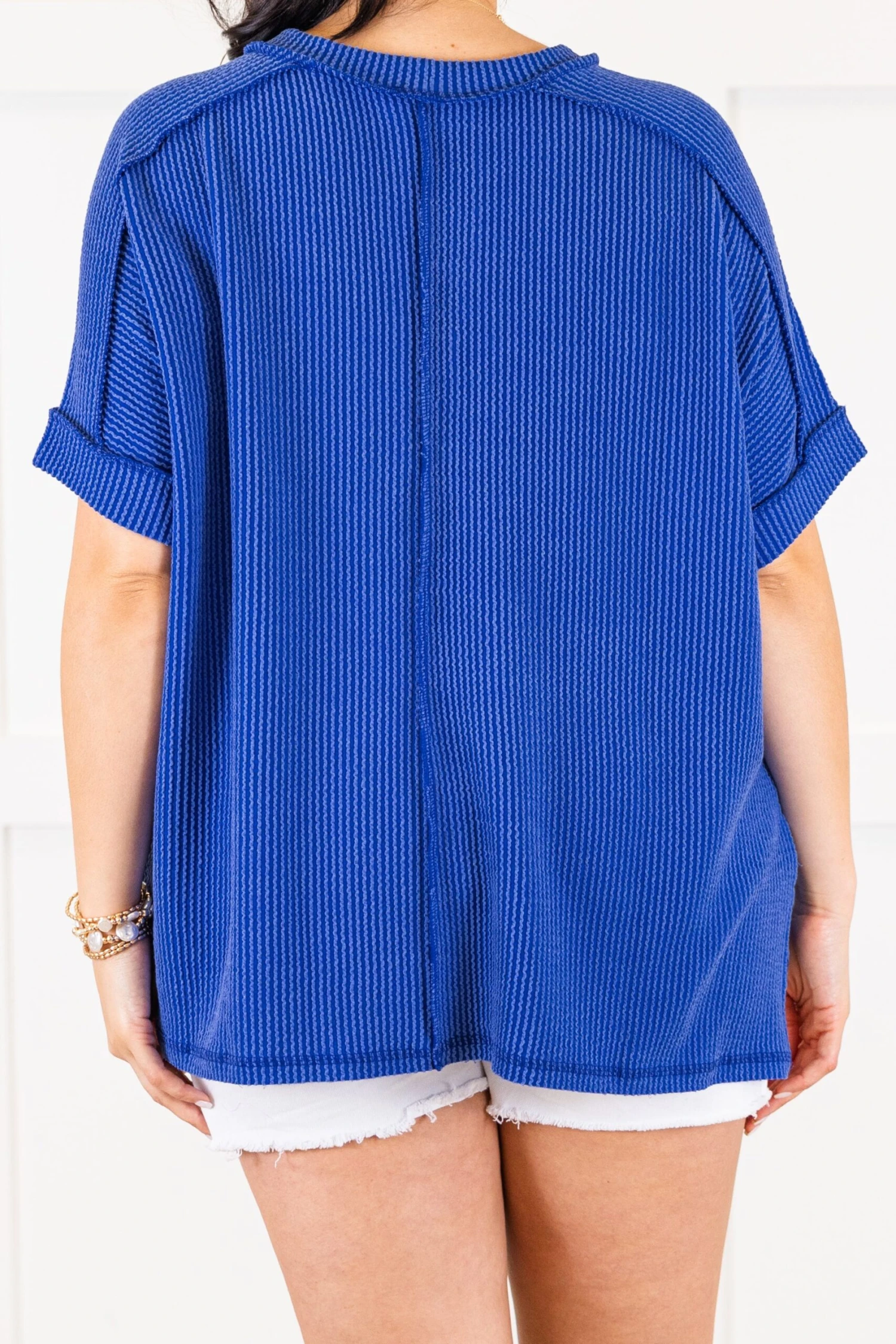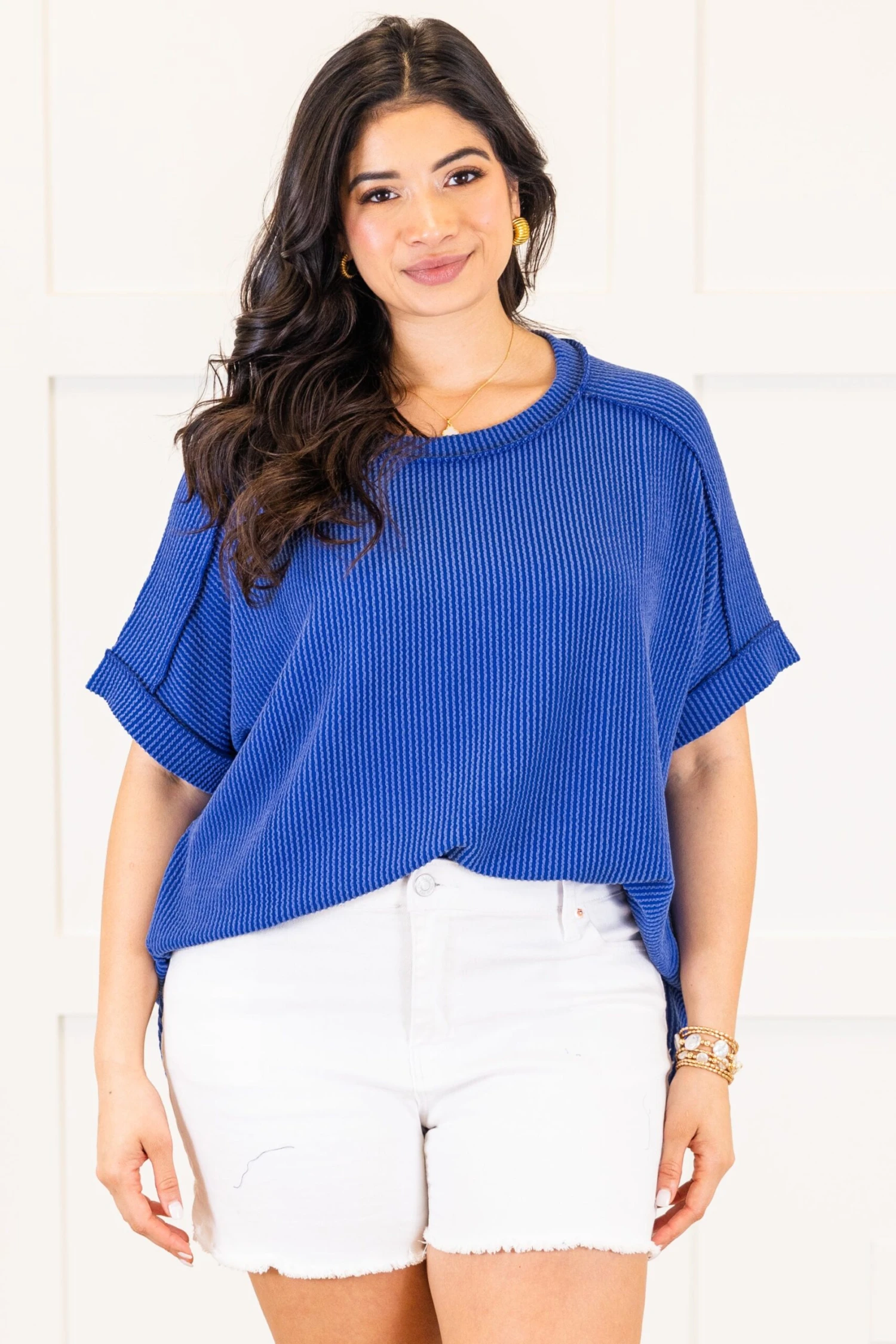 Effortlessly stylish and comfortable, this top is perfect for any occasion! Made from corded ribbed fabric, it features short cuff sleeves and a raw edge hem for added detail! The high low hemline adds a modern touch to this classic bright blue top! Upgrade your wardrobe now!
