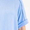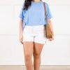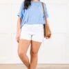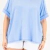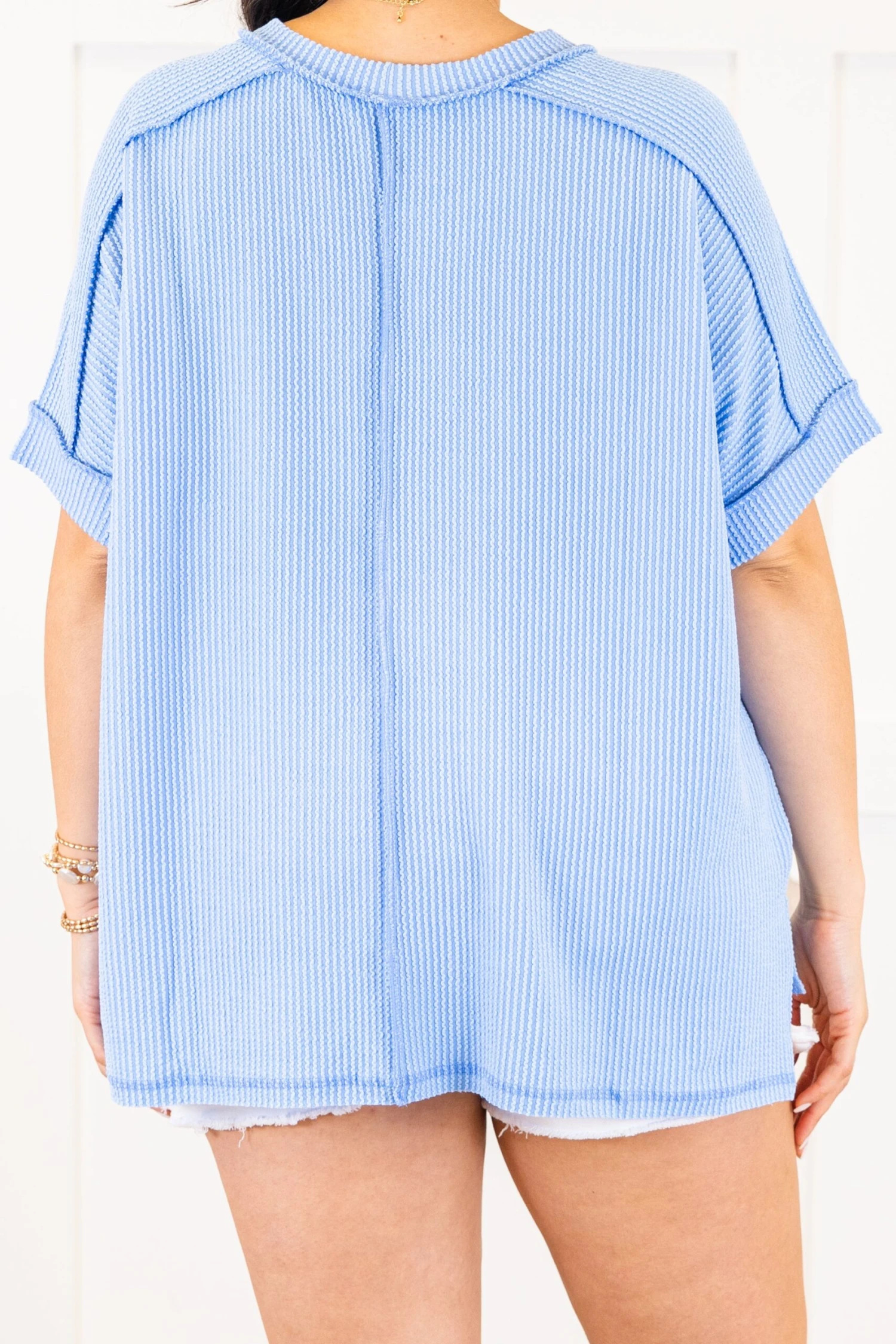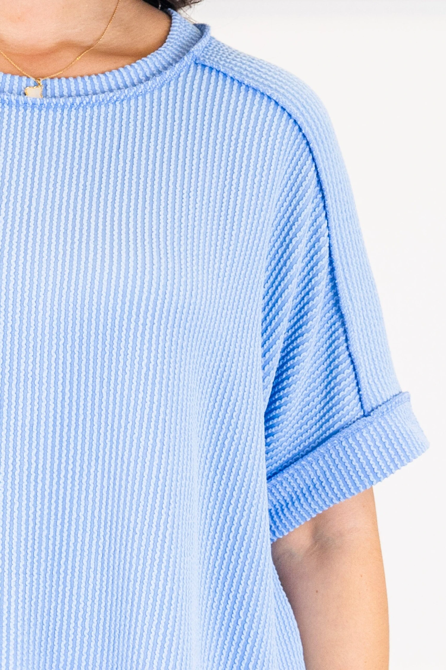 Effortlessly stylish and comfortable, this top is perfect for any occasion! Made from corded ribbed fabric, it features short cuff sleeves and a raw edge hem for added detail! The high low hemline adds a modern touch to this classic spring blue top! Upgrade your wardrobe now!