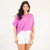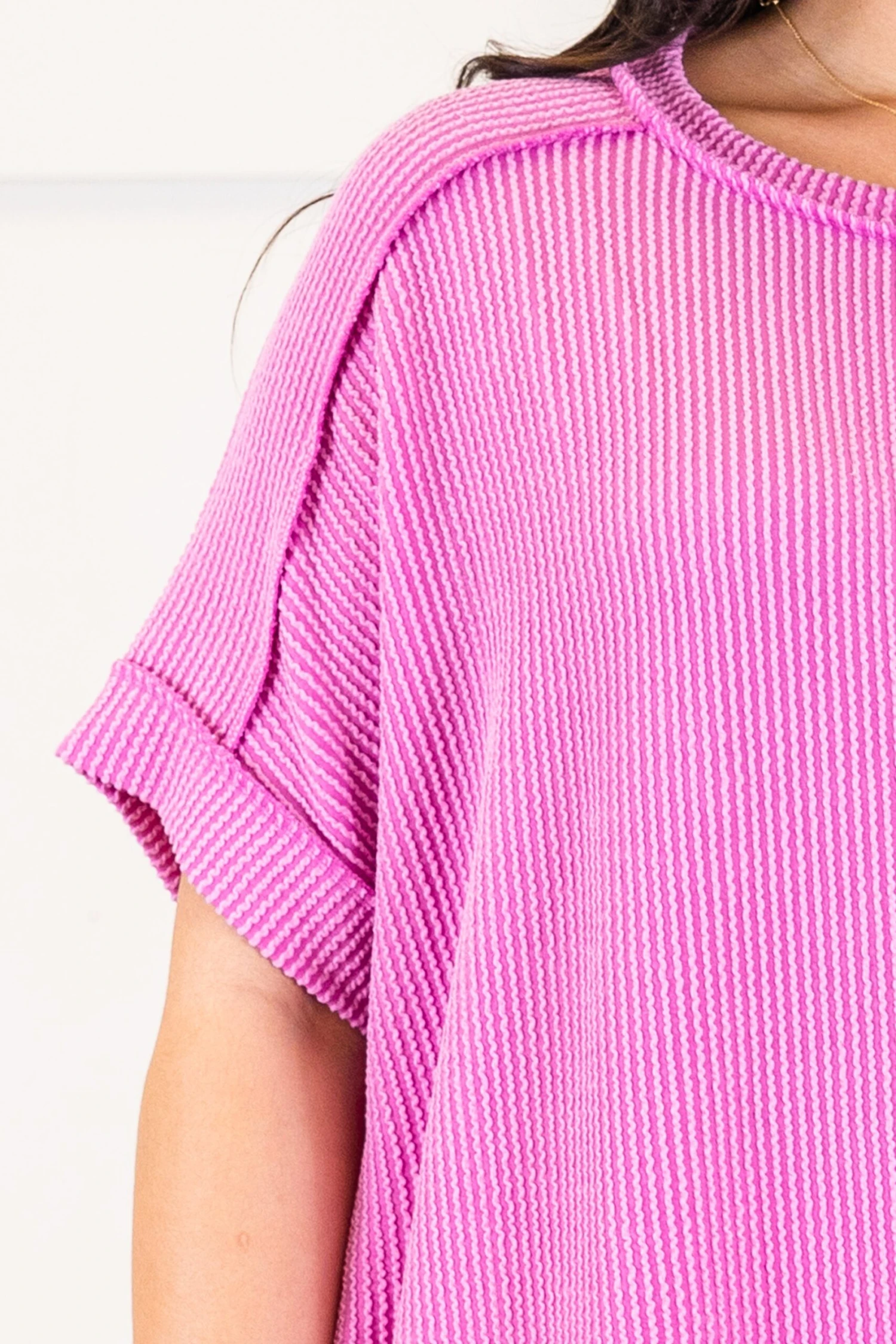 Effortlessly stylish and comfortable, this top is perfect for any occasion! Made from corded ribbed fabric, it features short cuff sleeves and a raw edge hem for added detail! The high low hemline adds a modern touch to this classic spring violet top! Upgrade your wardrobe now!