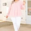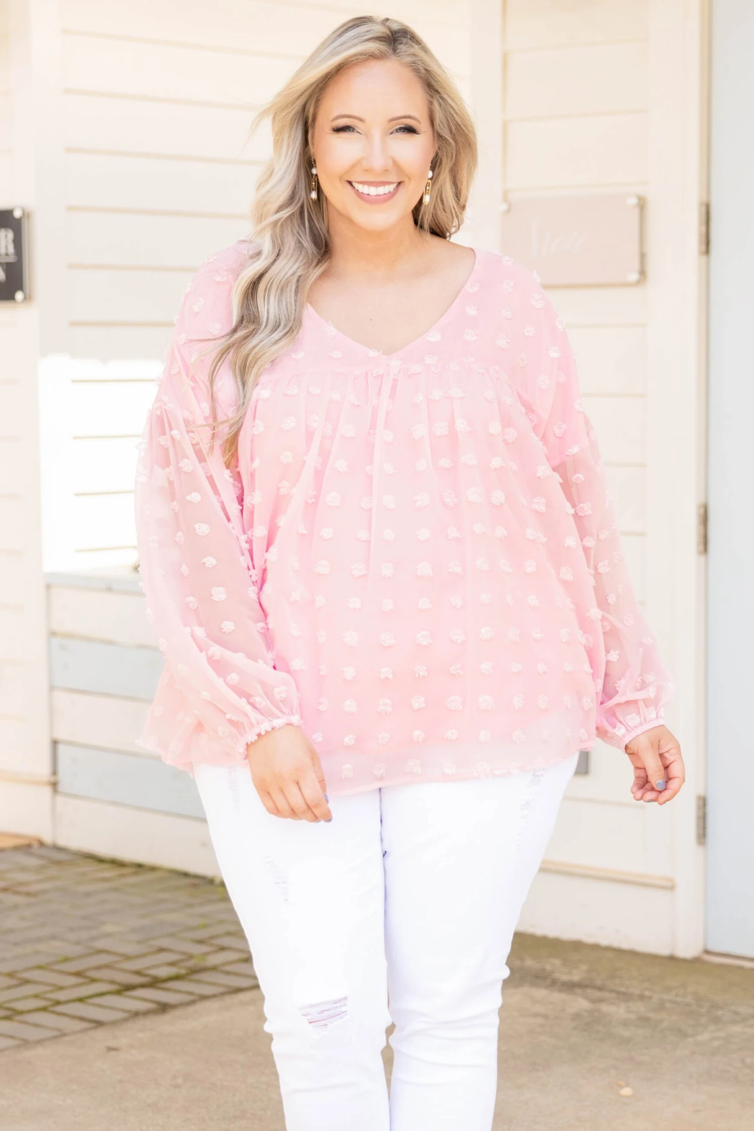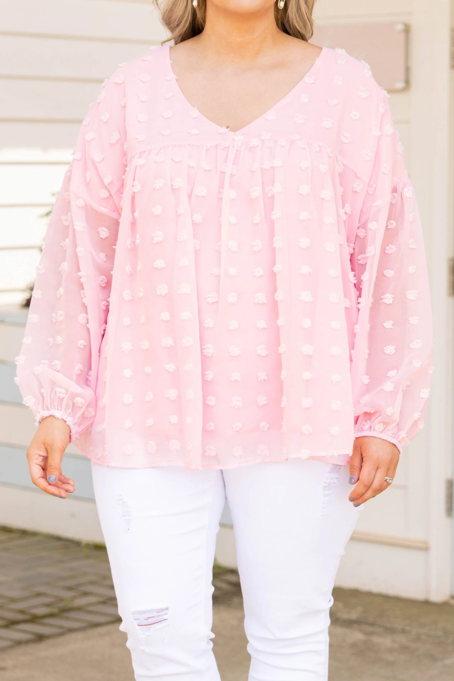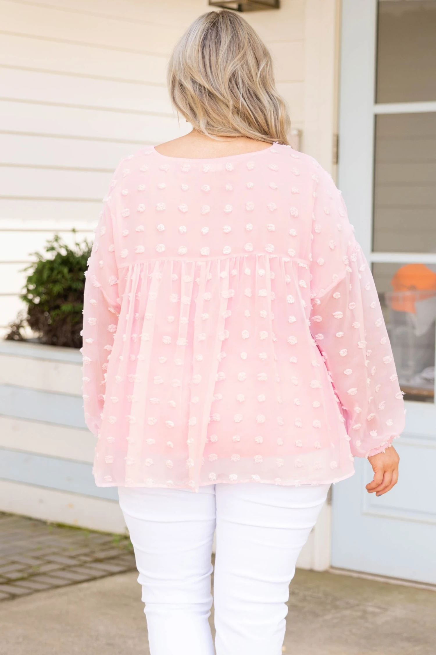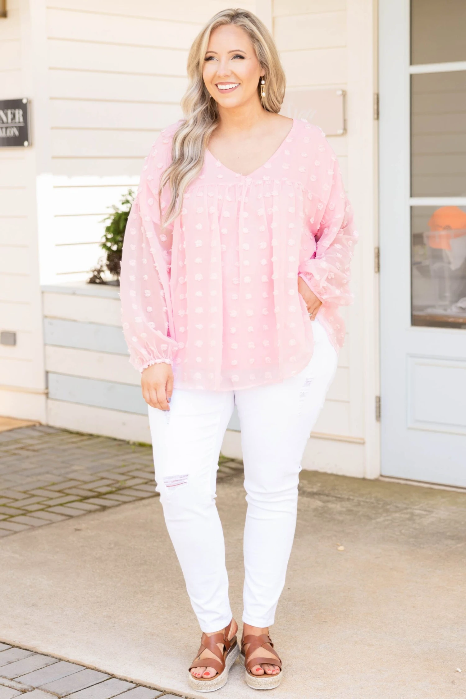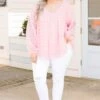 Have a little mystique in this top! This cutie has a fun light pink color with a chic raised dot pattern that we love! The bubble sleeves are so cute and the lightweight feel means you won’t get too hot! Style this with some white skinnies and sandals for a cute look!