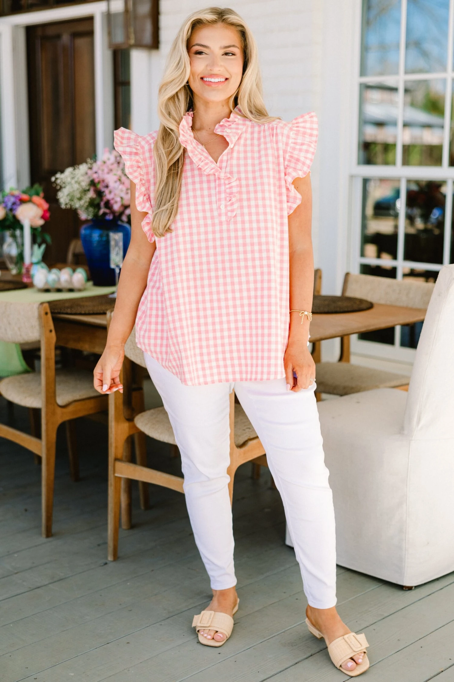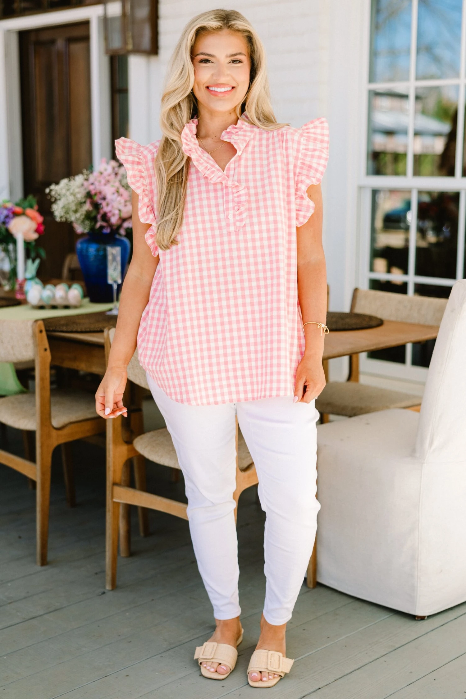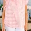 Elevate your game day style game with our Meet Me At The Stadium Top in light pink! The gingham print and ruffle details add a touch of charm, while the functional buttons make it easy to wear! Perfect for any occasion, pair it with your favorite blue or white denim for a chic and effortless look!