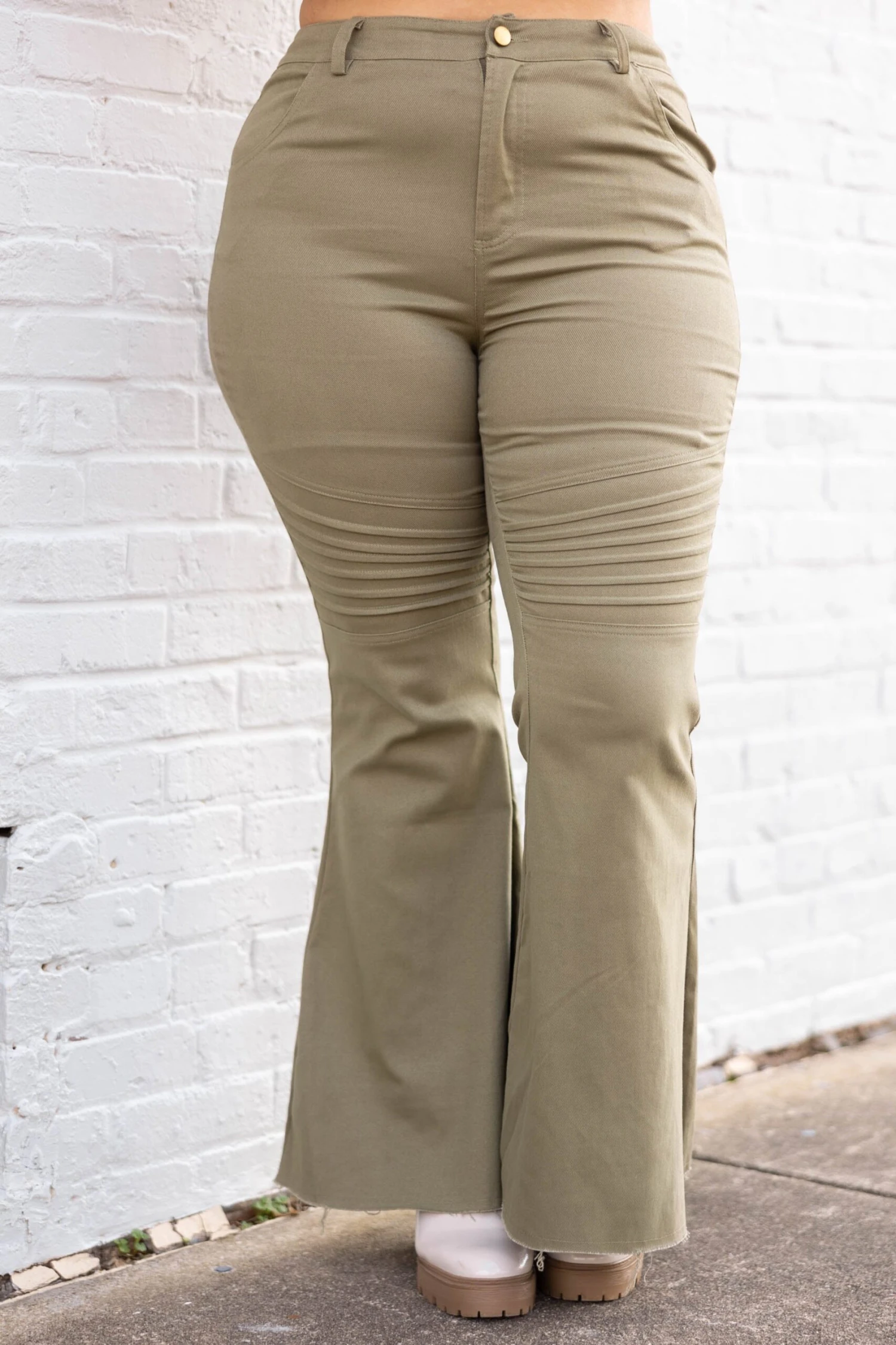 Your new favorite bell bottoms jeans are here! They have a trendy flared and raw hemline with a fitted design to flatter your figure in the best way! Pair these moss colored jeans with boots and a sweater for an effortlessly beautiful look!