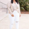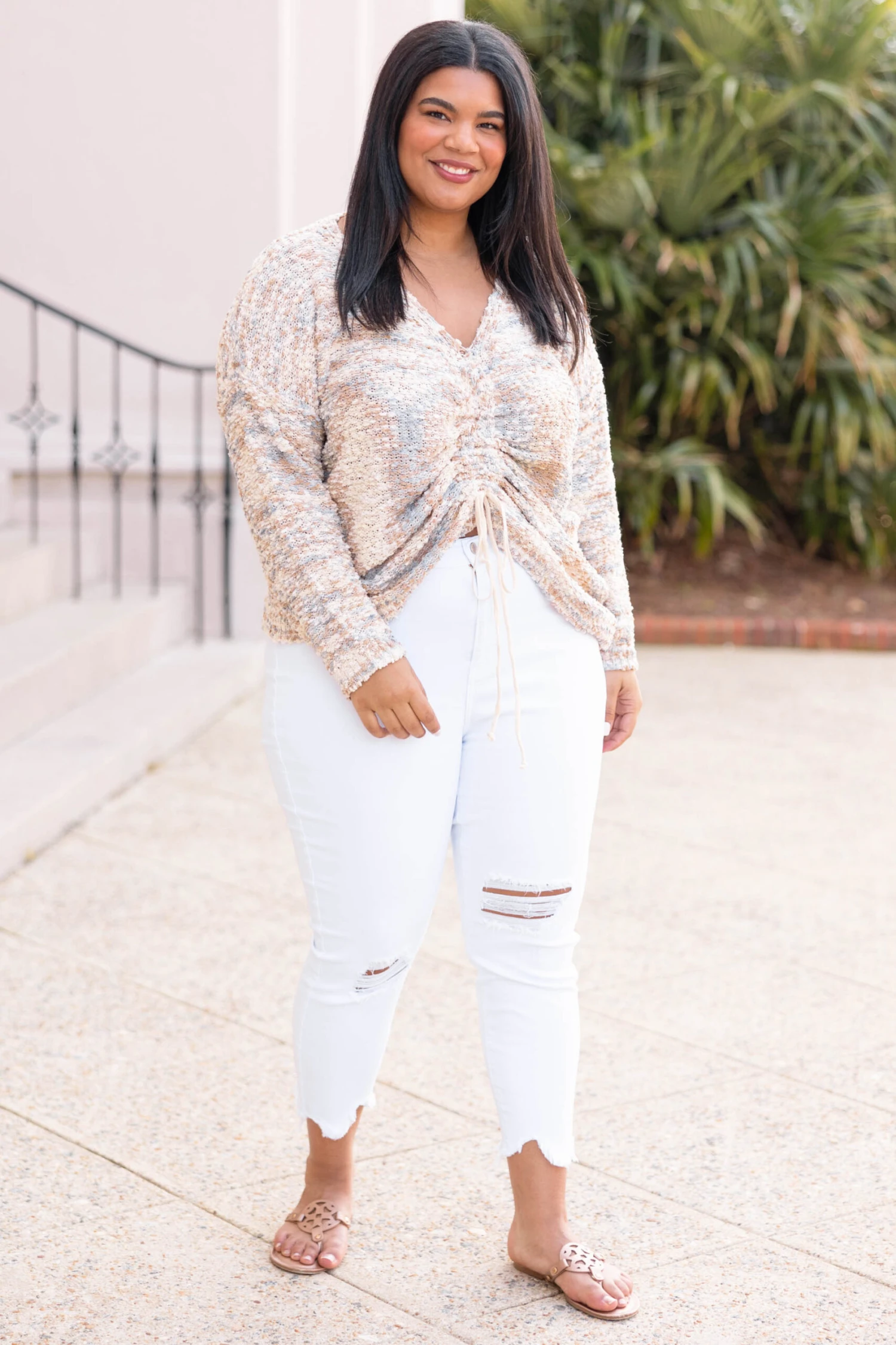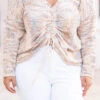 This sweater was made for memorable moments! It has a neutral color that is perfect for the season! The ruched front and figure flattering fit is great for any occasion! We see this top styled with white denim and sandals for a classic chic look!