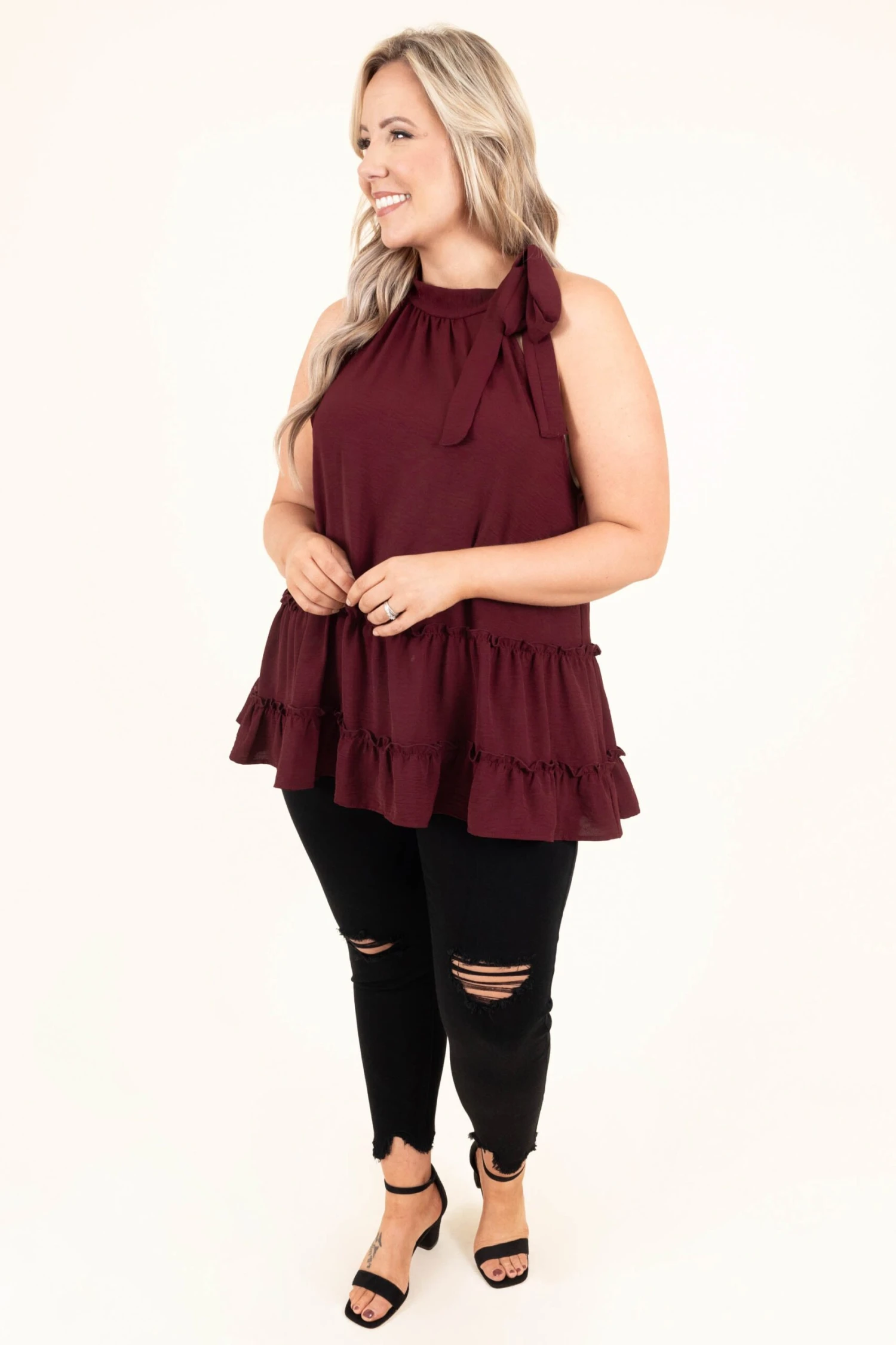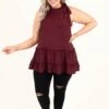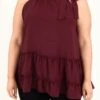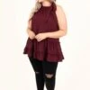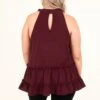 This top is absolutely fabulous! The wine color is classically chic and the tiered style will look good on anyone! We love the tie halter that is so flattering and the keyhole clasp in the back is so flirty! Style this with some distressed skinnies and heels and you have a super chic look!
