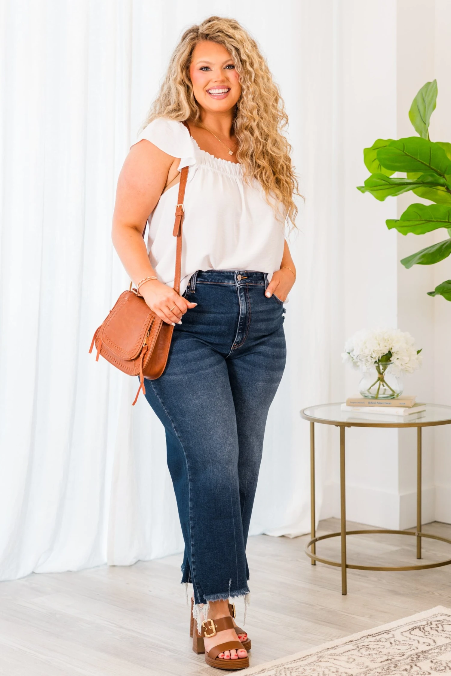 Stay on time and on trend with Miss Punctuality Jeans in a trendy dark wash! These comfy jeans feature a distressed hemline, adding a playful edge to your style! Don’t let fashion be late, grab these jeans today!