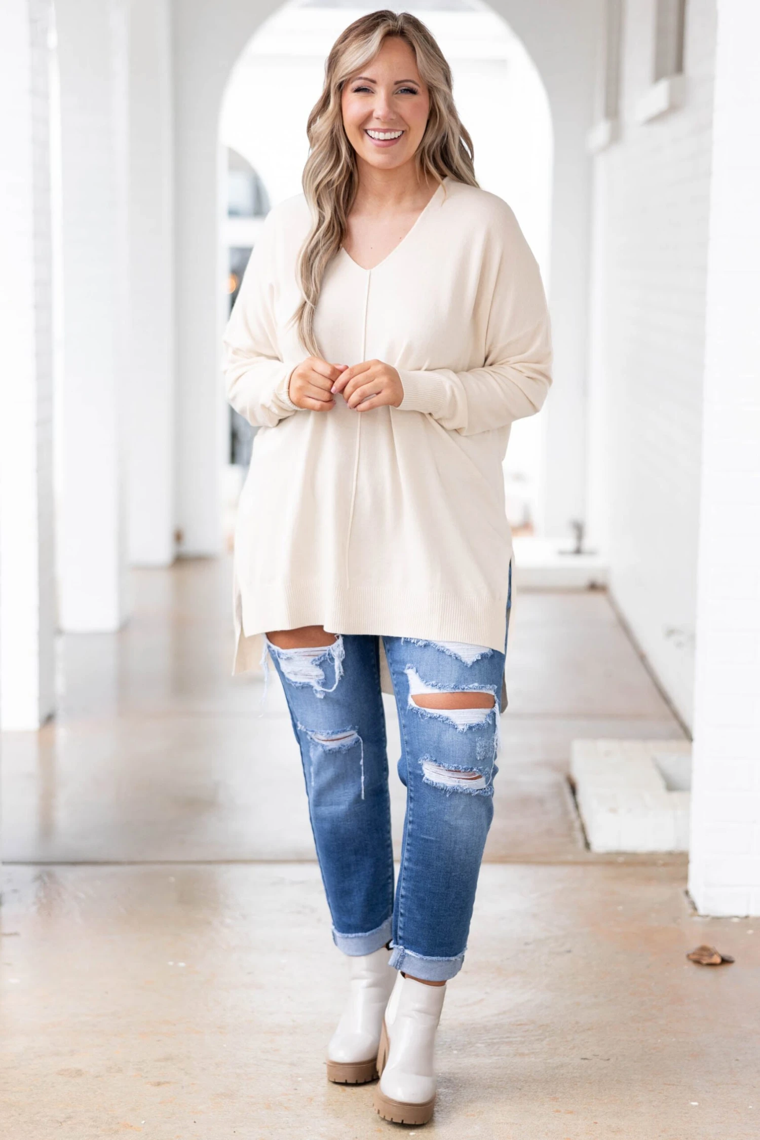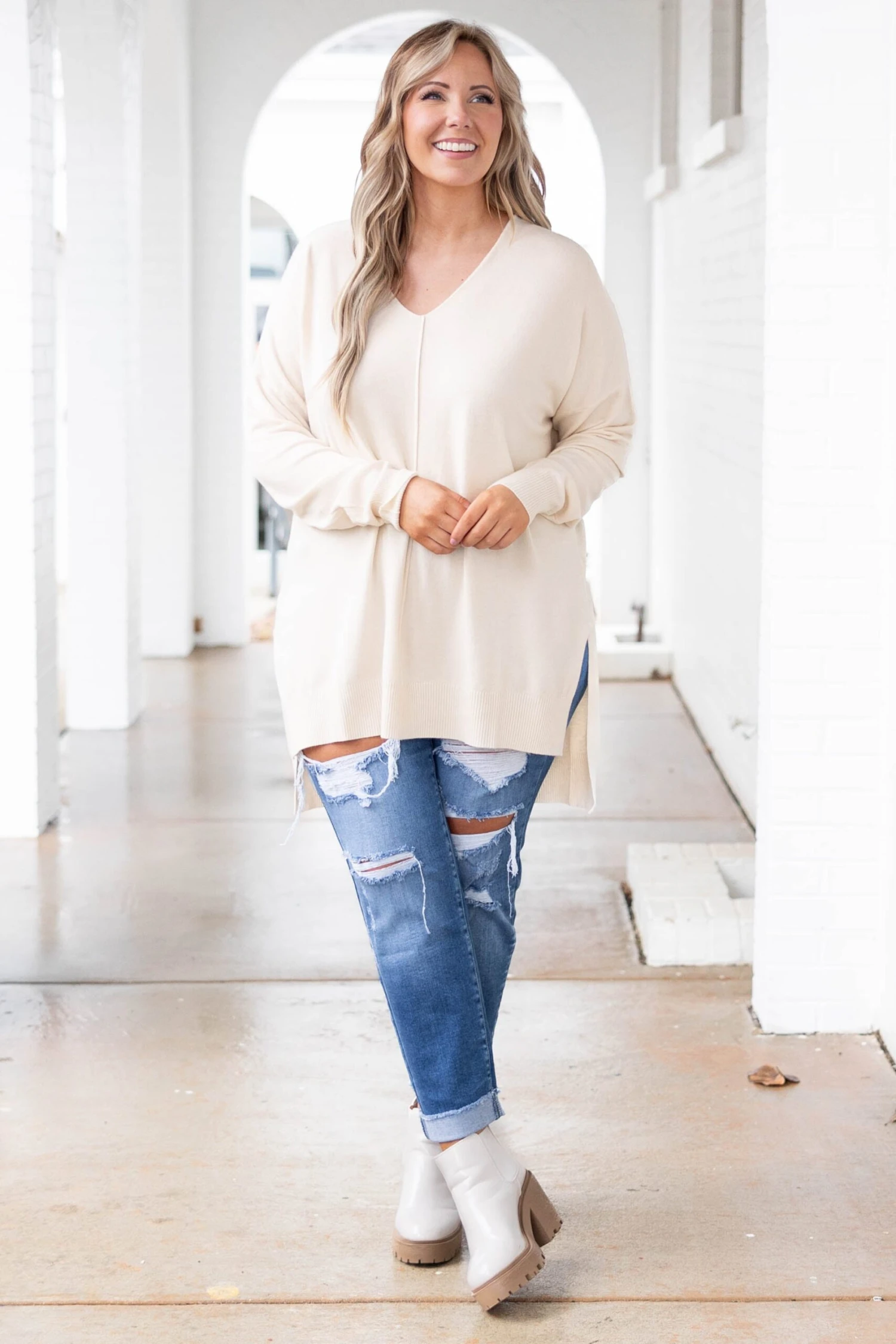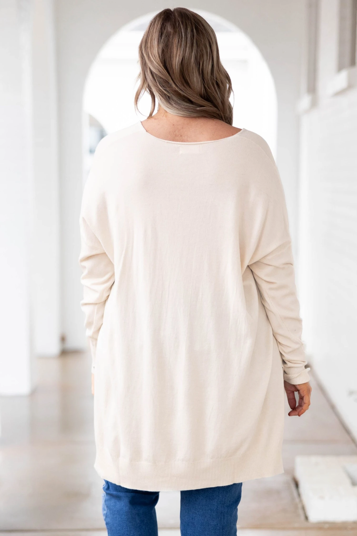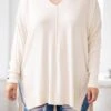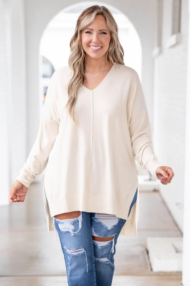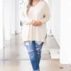 In this top, you’ll never miss last year’s wardrobe! This sweater has a neutral bone color you can dress up or down and style with everything in your closet! It’s comfortable for all day wear, has a figure-flattering fit, and can be layered with your favorite outerwear! Simply, style this sweater with denim and boots for an effortlessly chic look!