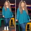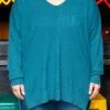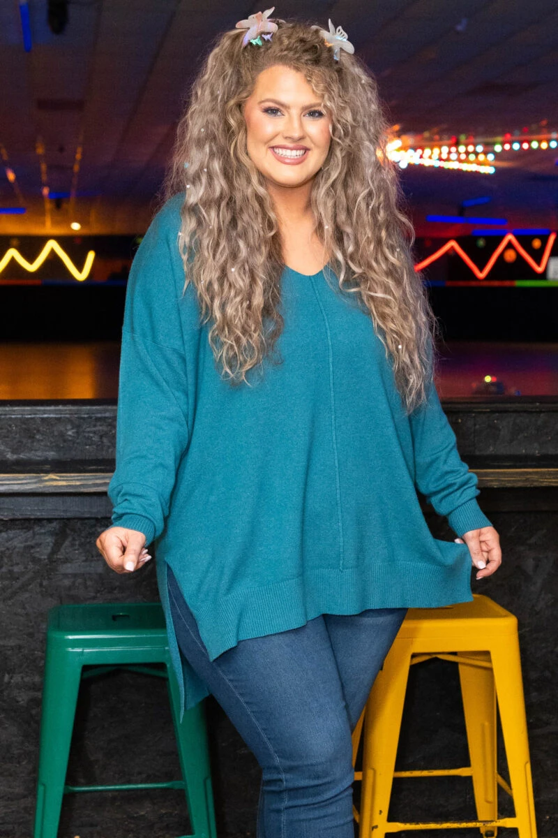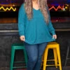 In this top, you’ll never miss last year’s wardrobe! This sweater has a sweet heather teal color you can dress up or down and style with everything in your closet! It’s comfortable for all day wear, has a figure-flattering fit, and can be layered with your favorite outerwear! Simply style this sweater with distressed skinnies and booties for an effortlessly chic look!Â