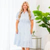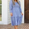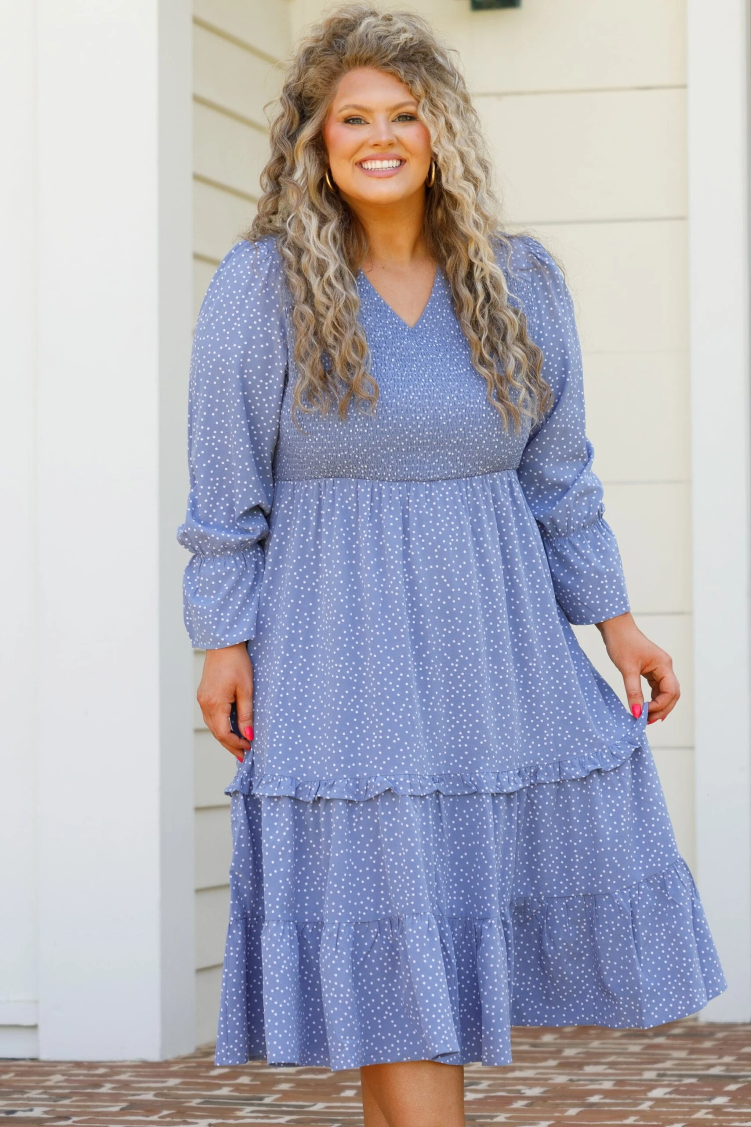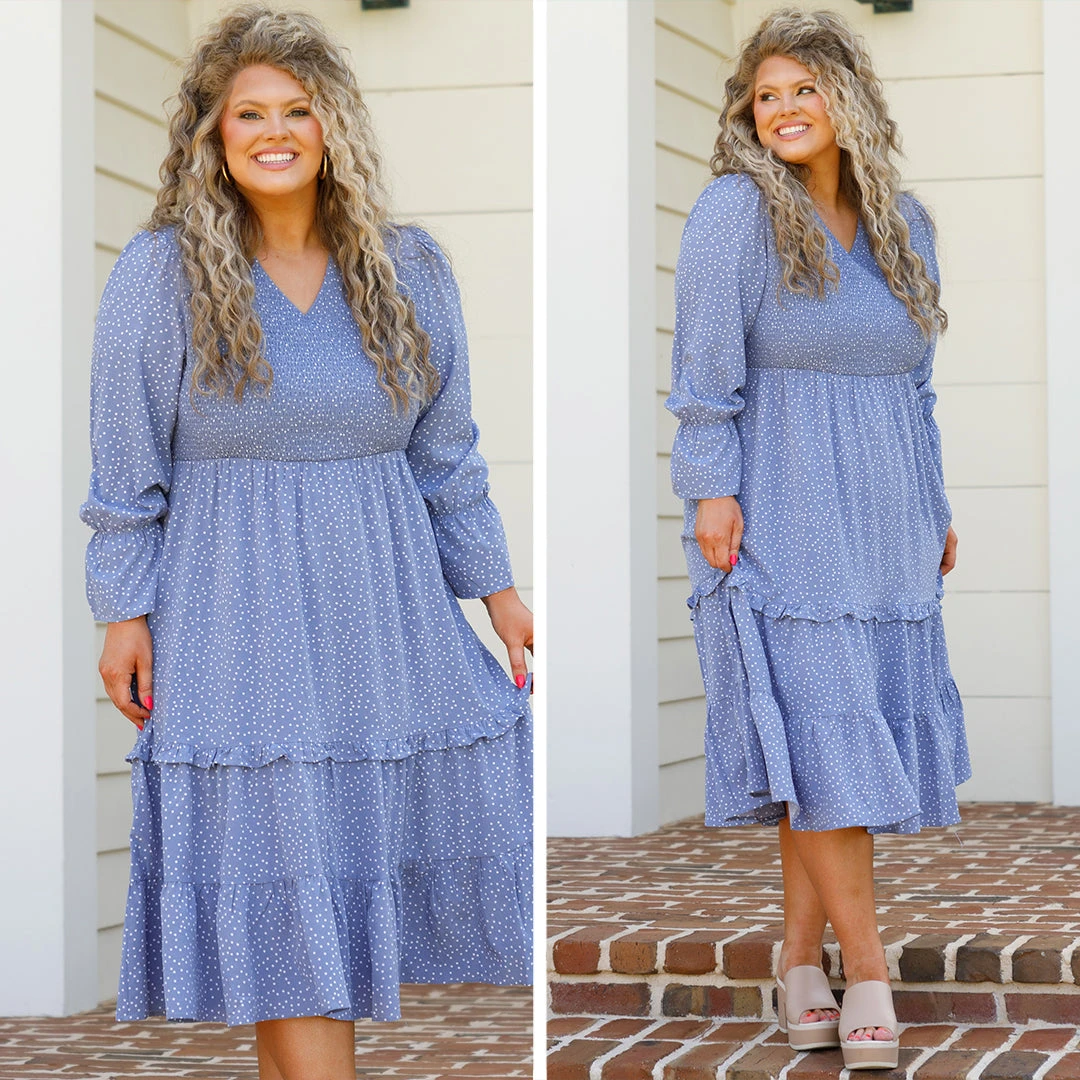 Enjoy your morning wearing this mesmerizing dress! This midi dress has a pretty blue color with a polka dot pattern that is a season favorite! The adorable sleeves and flowy fit are perfect for any occasion! Style this dress with some cute accessories and wedges for an unforgettable look!