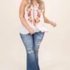 This top is more than a dream, it’s the real thing! This cutie has a unique square dot design that is so fun and the floral embroidery is so stunning! The neckline has fun tie that you can tie up or leave undone depending on how you are feeling! Pair this fab top with some flares and booties to look oh so stylish!