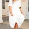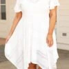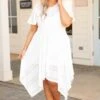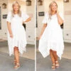 We more than just love this dress, we are obsessed! The white color will have all eyes on you and the lace is stunning! We love the asymmetrical hem for a unique look and the tie at the collar for a nice touch! Style this with some sandals and accessories for a super stylish look!